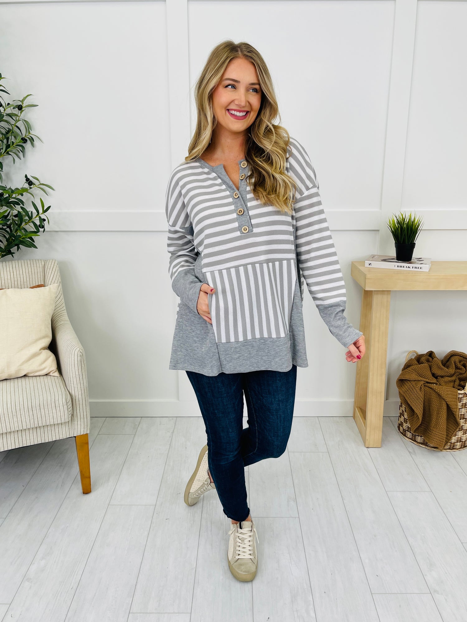 This classic yet modern top combines classic grey stripes with contrasting solid panels for a stylish, casual look. Its quarter button-down design and relaxed, flowy fit offer both comfort and effortless styling. Perfectly comfy and undeniably cute, this top is an essential addition to your wardrobe for versatile, everyday wear.