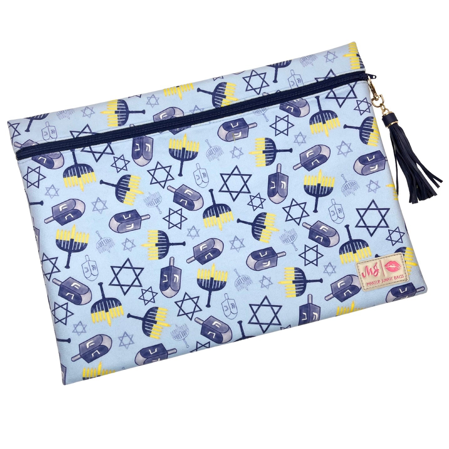 The perfect flat-lay bag that holds everything, stays organized, looks beautiful, actually works in a festive dreidel pattern.