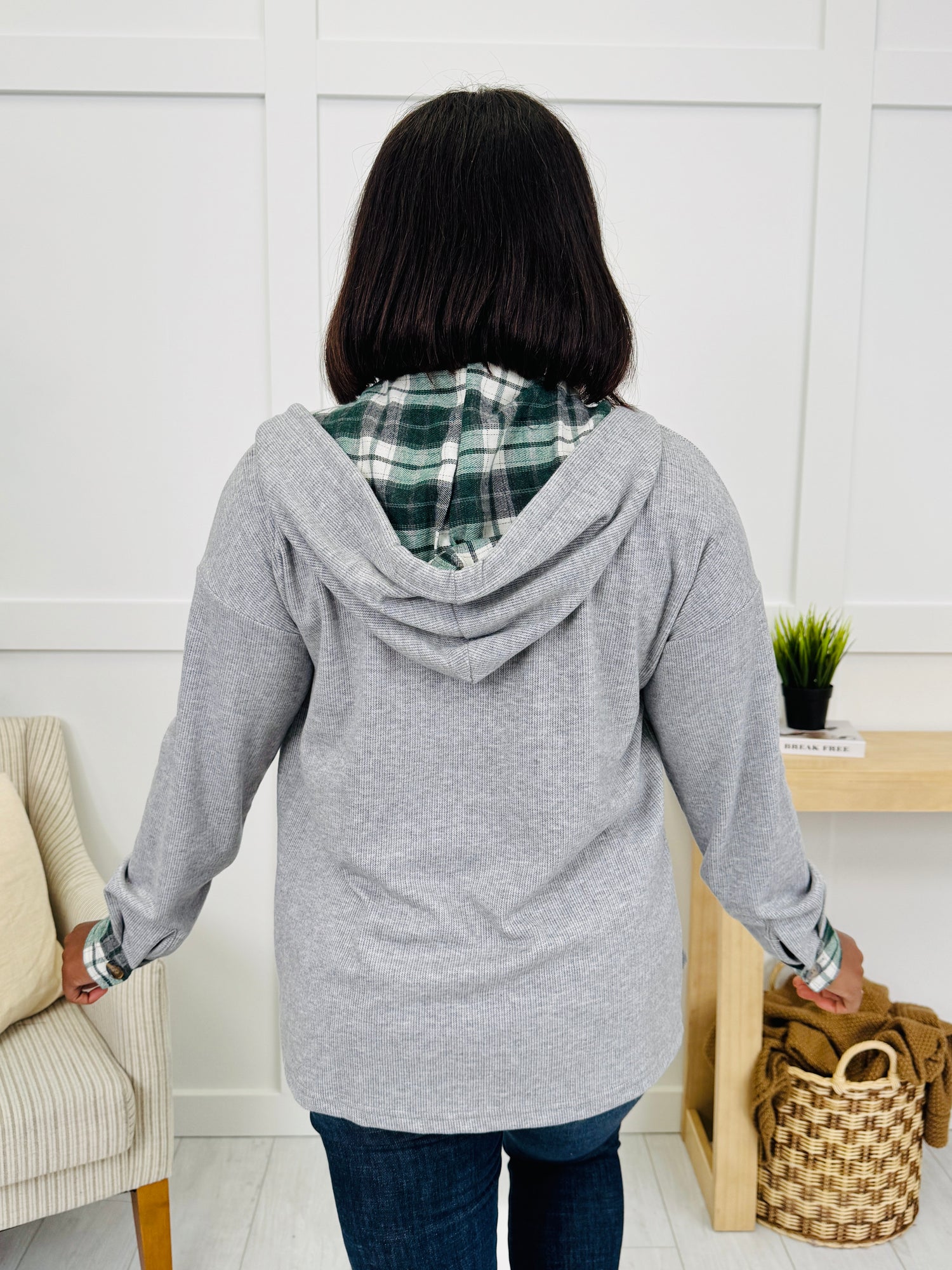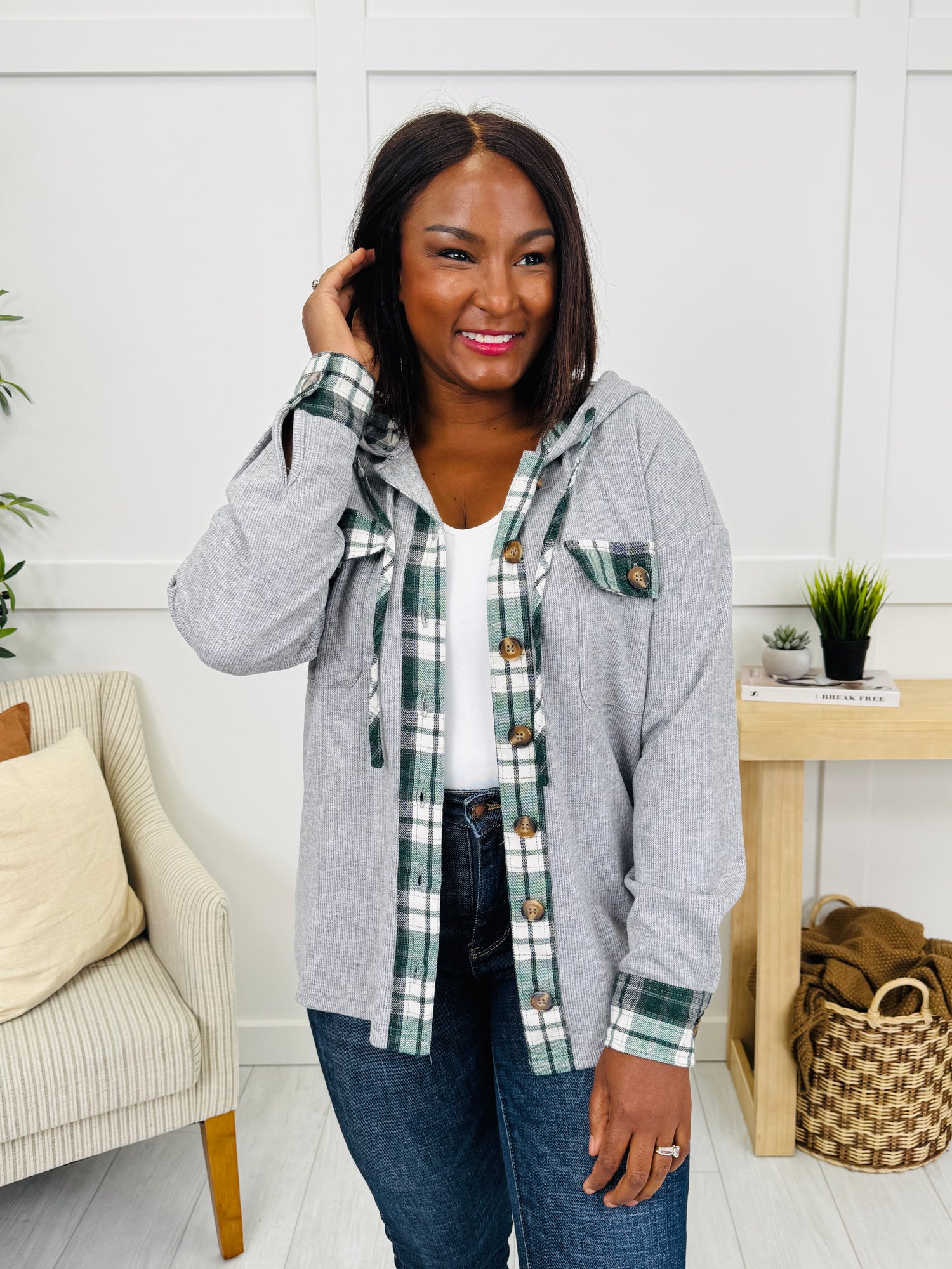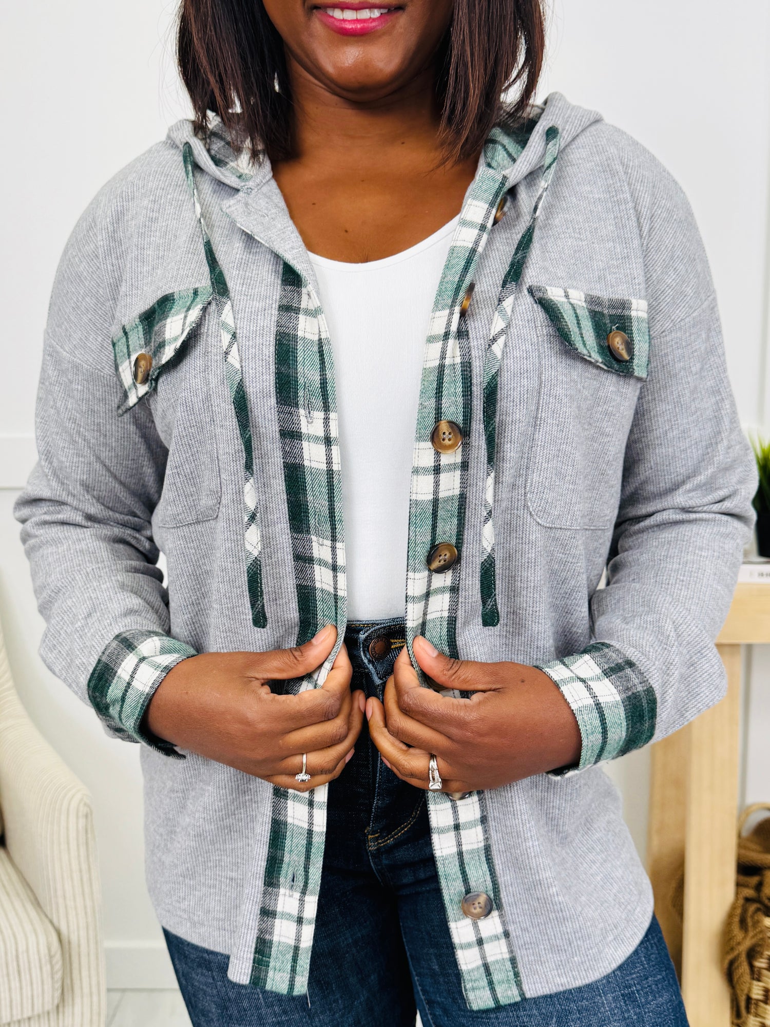 This cozy hoodie jacket combines a soft gray body with a stylish plaid-lined trim, hood, and chest pockets for a trendy look. The button-front closure and adjustable hood make it easy to layer over any outfit. Whether you're running errands or relaxing, this piece offers both comfort and style with its relaxed fit and practical details.