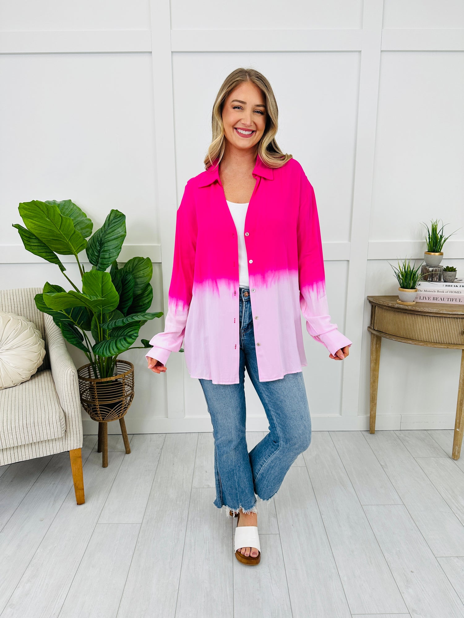 This collared button-front top features a striking dip-dyed ombré finish that transitions beautifully from top to hem. The relaxed, flowy shape creates an easy, polished look whether you wear it buttoned as a blouse or open as a lightweight layer. Finished with long sleeves and button cuffs, it has a clean, elevated feel that pairs effortlessly with denim for everyday styling.