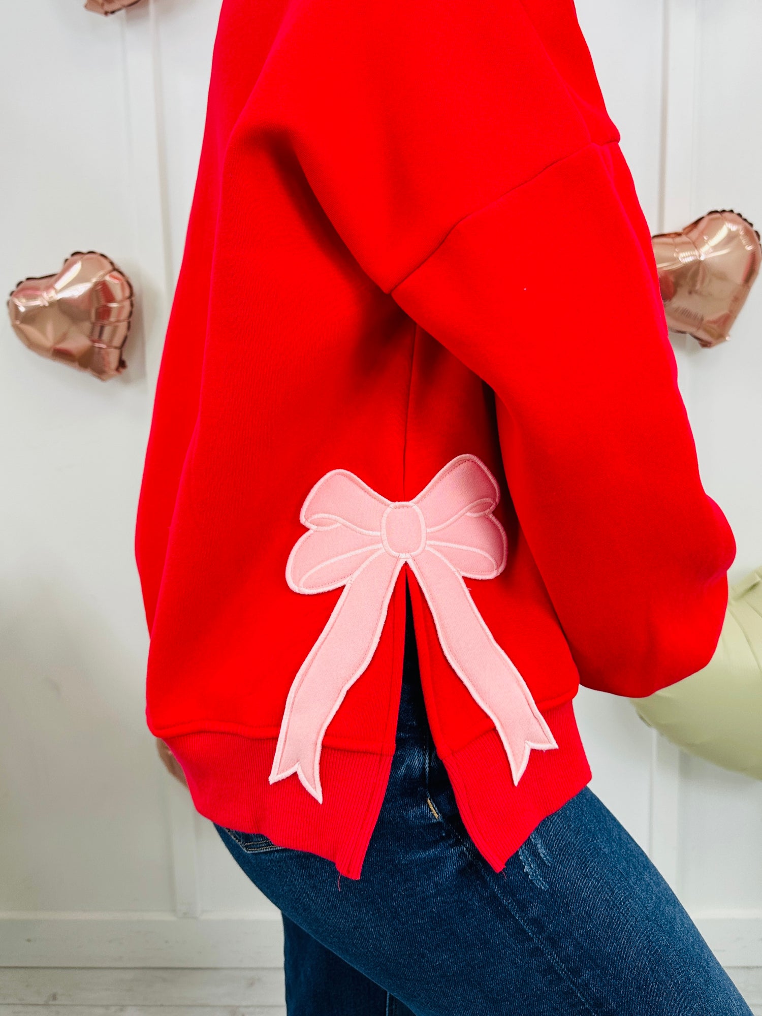 This statement sweatshirt brings all the cute with its oversized LOVE appliqué front and center. A sweet bow accent at the side adds the perfect extra touch, and the slit hem finish gives it an easy shape that looks great with your favorite denim. Finished with banded cuffs and a banded bottom hem, it’s the kind of cozy piece that does the most without trying too hard.