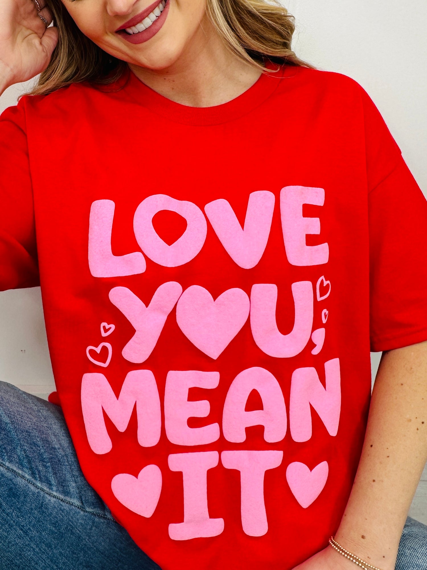 Show some love in style with the Love You Mean It tee — a playful and bold design that makes a statement of affection. The soft puff ink in pastel pink pops beautifully against the red base, creating a fun and flirty vibe that’s perfect for any casual occasion.