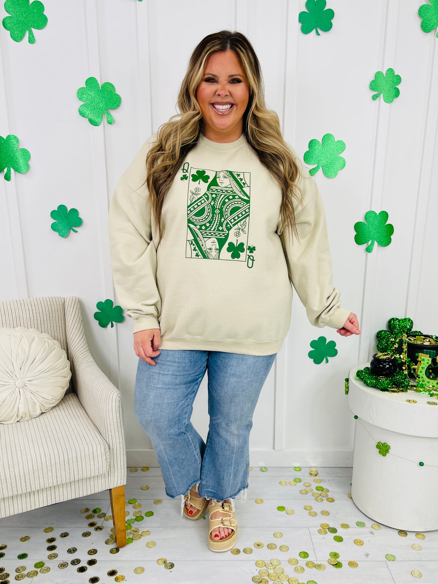 Start your day feeling a little extra lucky in the Clover Queen sweatshirt — a playful, eye-catching design that blends classic card-style artwork with festive charm. The detailed queen graphic paired with shamrock accents gives this piece a fun, confident vibe that feels both bold and easy to wear.
