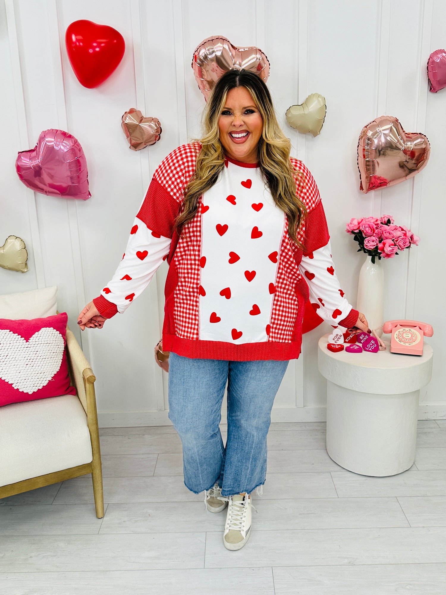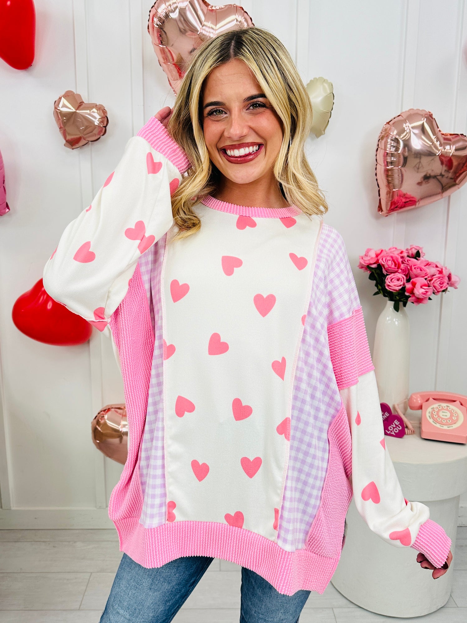 This best selling top is back in a new heart version that's perfect for Valentine's Day. This top is made from buttery soft fabric that our customers rave about and also features our best selling raised rib fabric. This top has an eye-catching patchwork design with playful heart prints and gingham accents that give it the perfect mix of sweet and casual. It's relaxed and oversized fit is flattering on all body types and comfy enough for everyday wear while still making a statement.