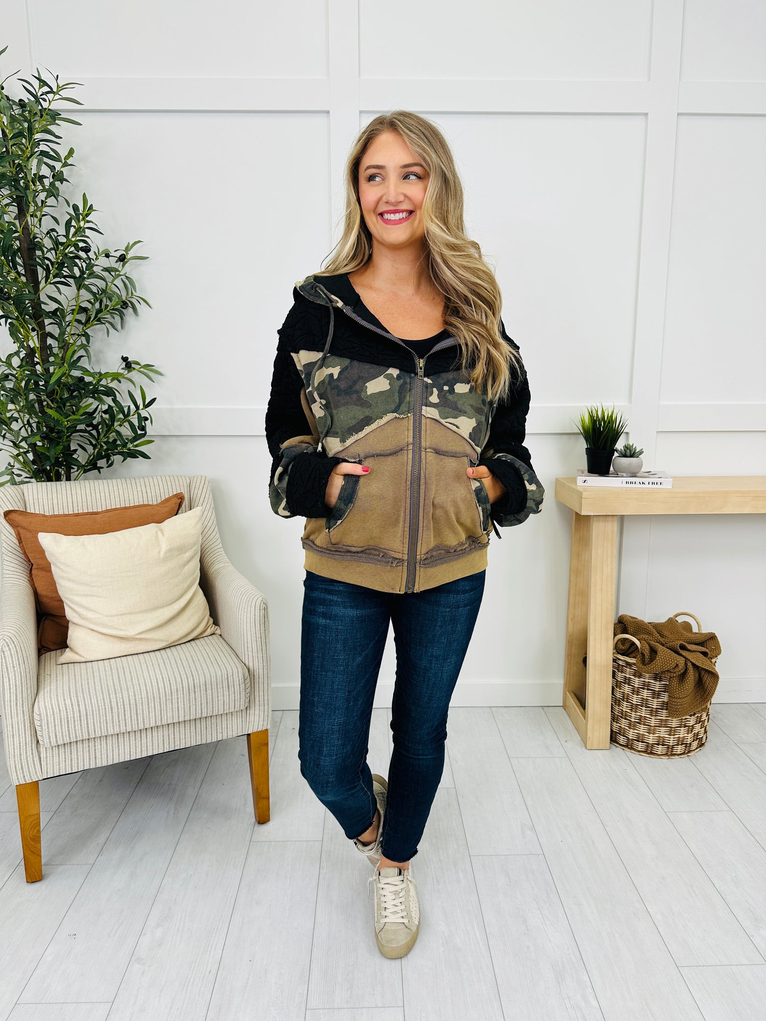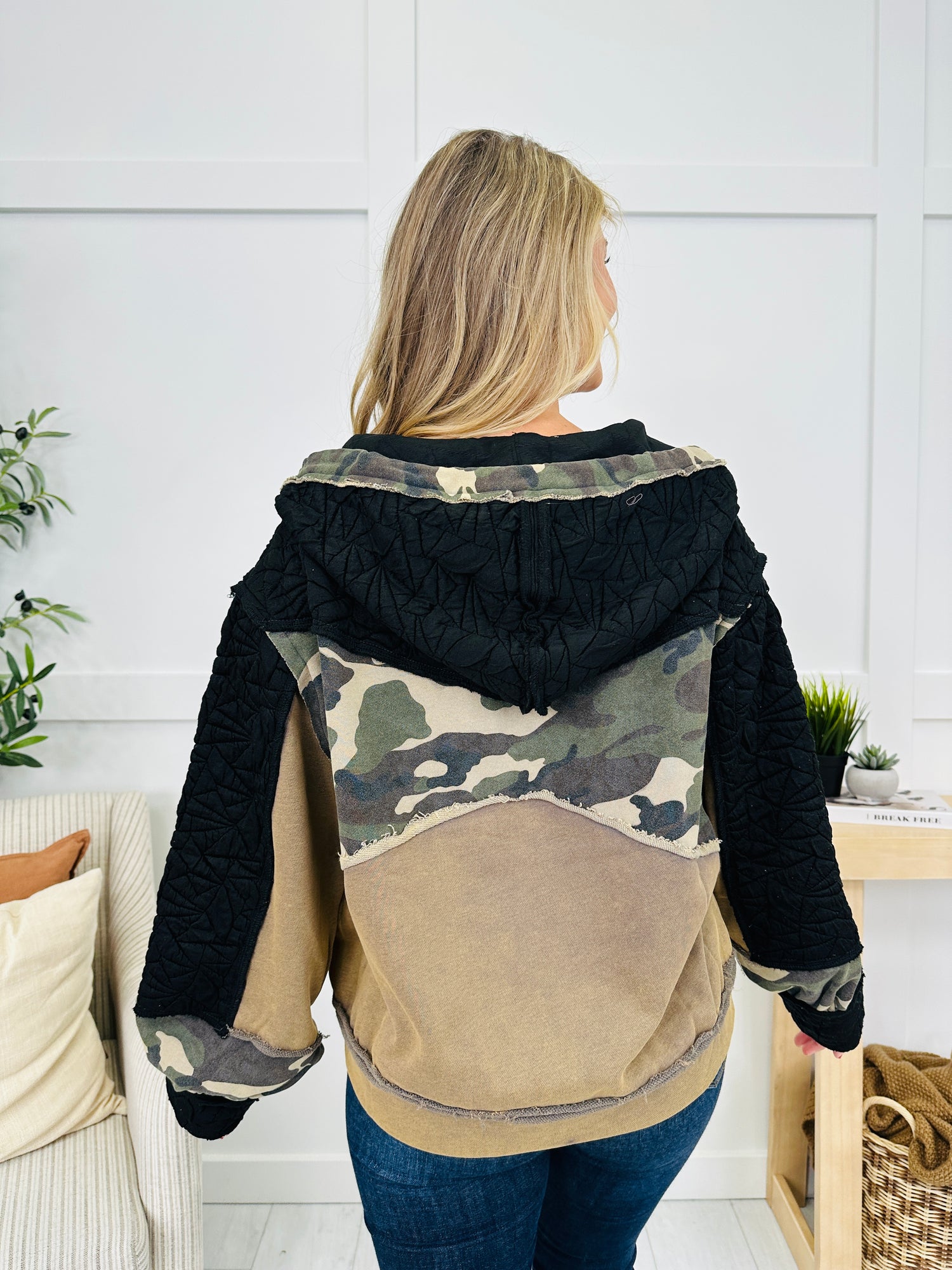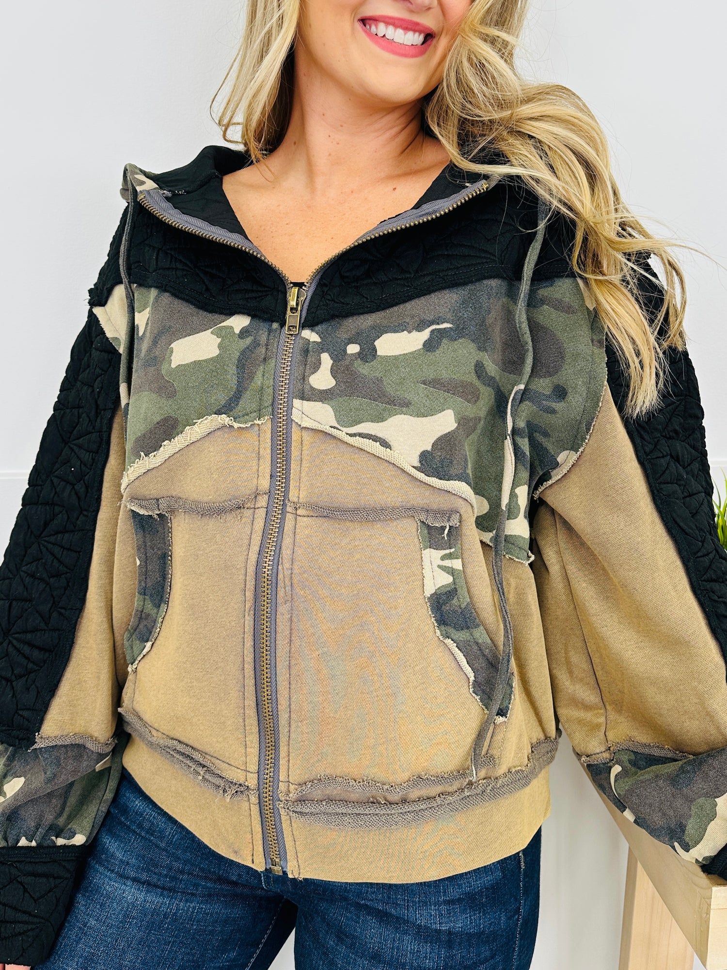 This zip-up hoodie brings an edgy twist to casual comfort. The mix of camo and solid panels gives it a bold, lived-in look, while the quilted sleeves add unique texture and dimension. Finished with exposed seams and roomy front pockets, it’s the perfect throw-on piece for effortless, cool-girl style.