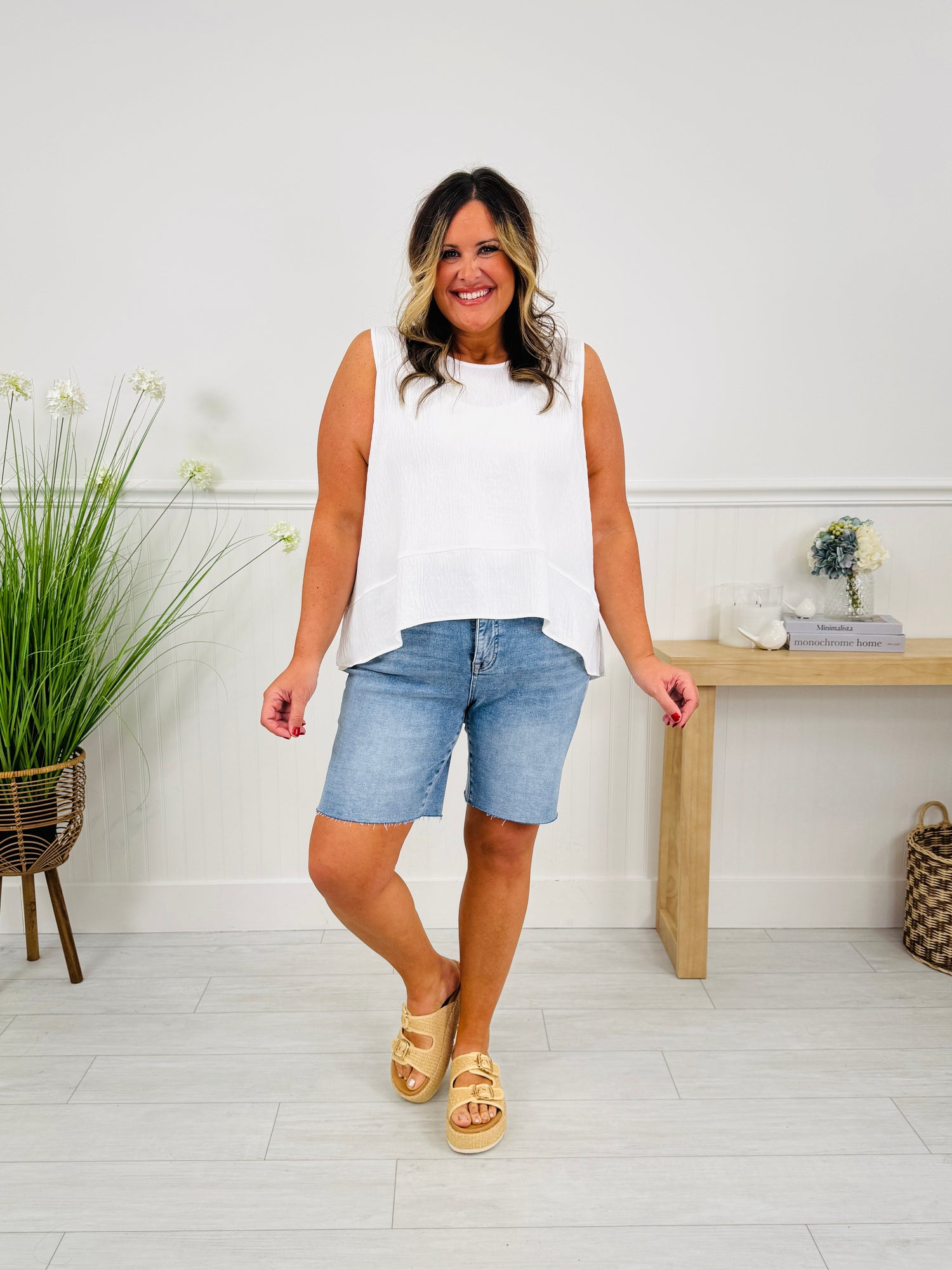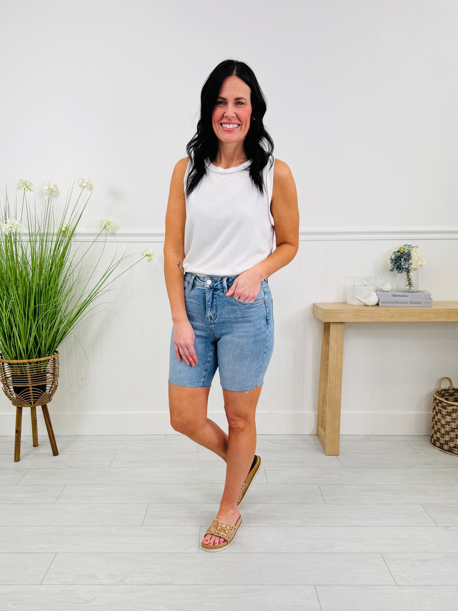 These shorts are made from a buttery soft and stretchy material that's designed to move with you and hold their shape all day. We love the medium wash for the season! Not only are these shorts the perfect mid-thigh inseam, they are also customizable. You can cuff them or cut them (thanks to the raw hem) if you want to make them your perfect inseam! Meet in the middle with these new shorts and add them to your cart while you still can!