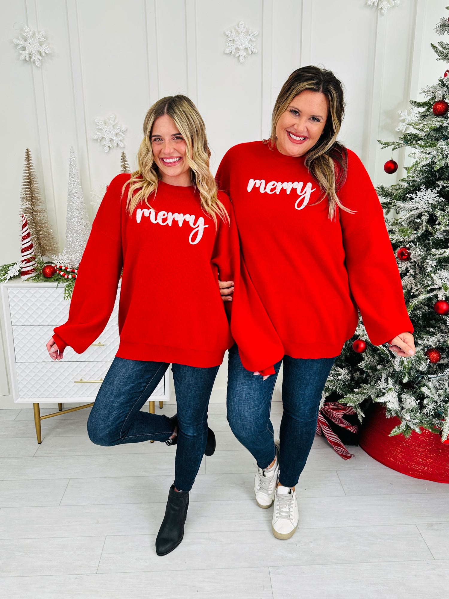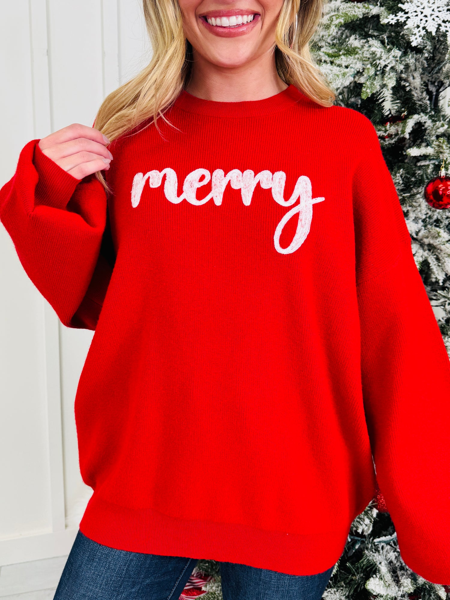Our best selling sweater is now available in a new Christmas version that is sure to make your holiday season Merry! This bright red knit features the word "merry" across the front in soft white lettering for a festive pop that stands out.