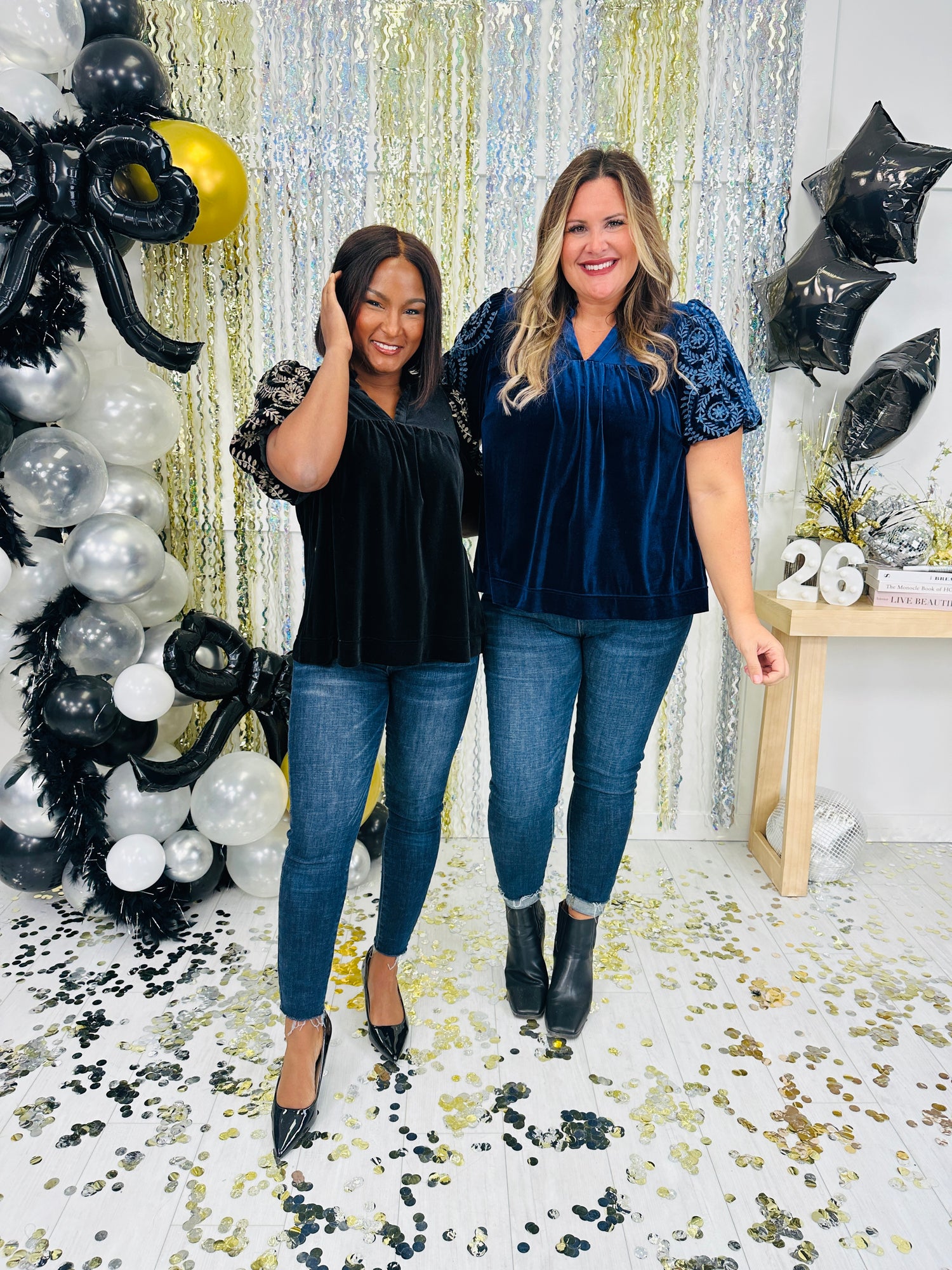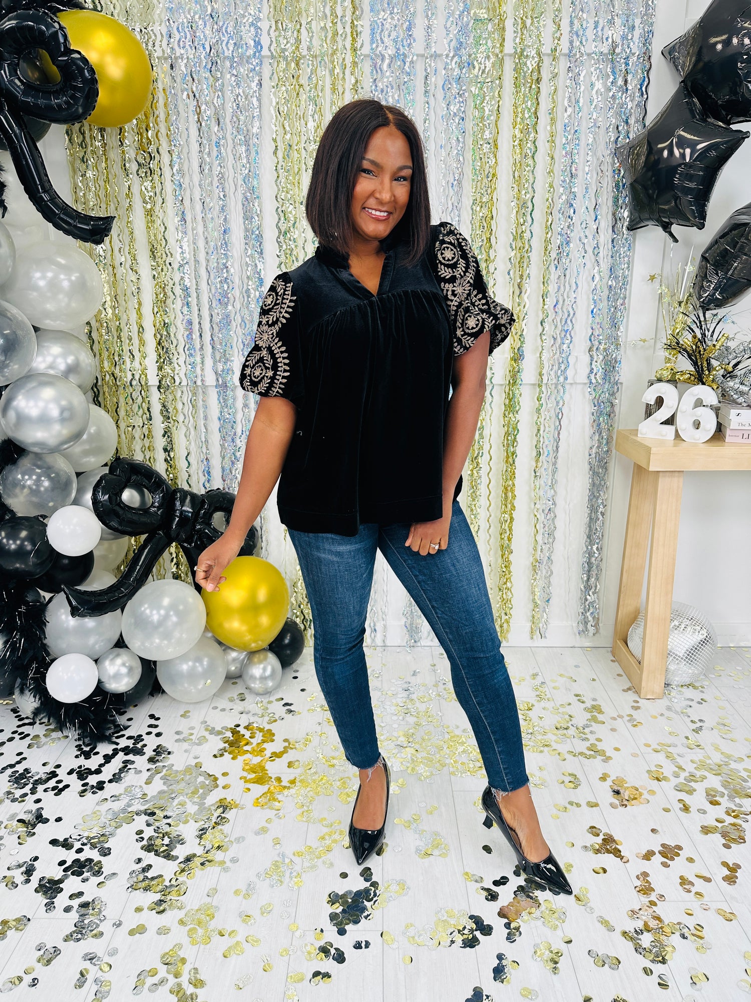 This stunning top combines luxurious velvety fabric with delicate embroidered floral detailing on the sleeves for an elevated, feminine look. The notched V-neckline adds a flattering touch, while the relaxed fit ensures comfort throughout the day. Available in several colors, this top is perfect for both casual and dressier occasions, offering versatility and timeless style.