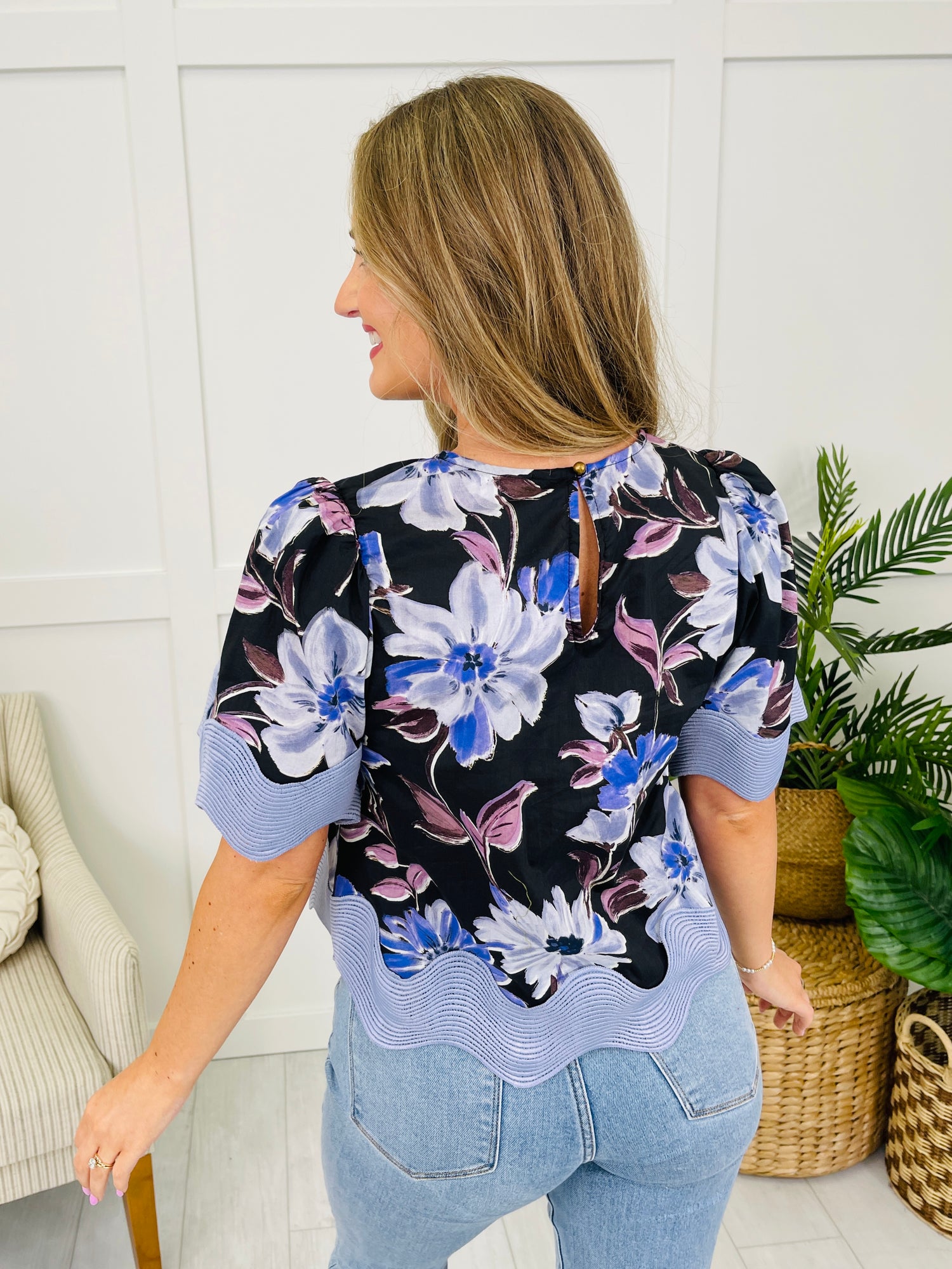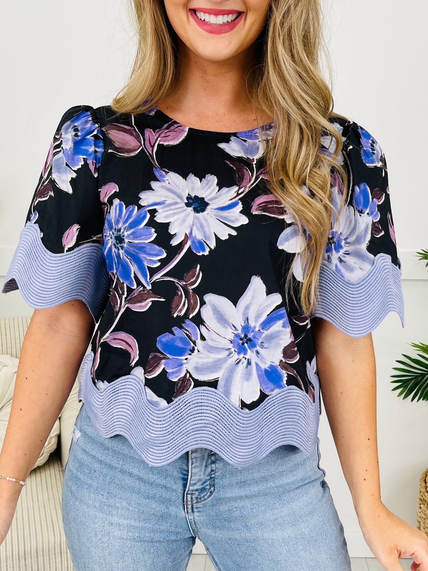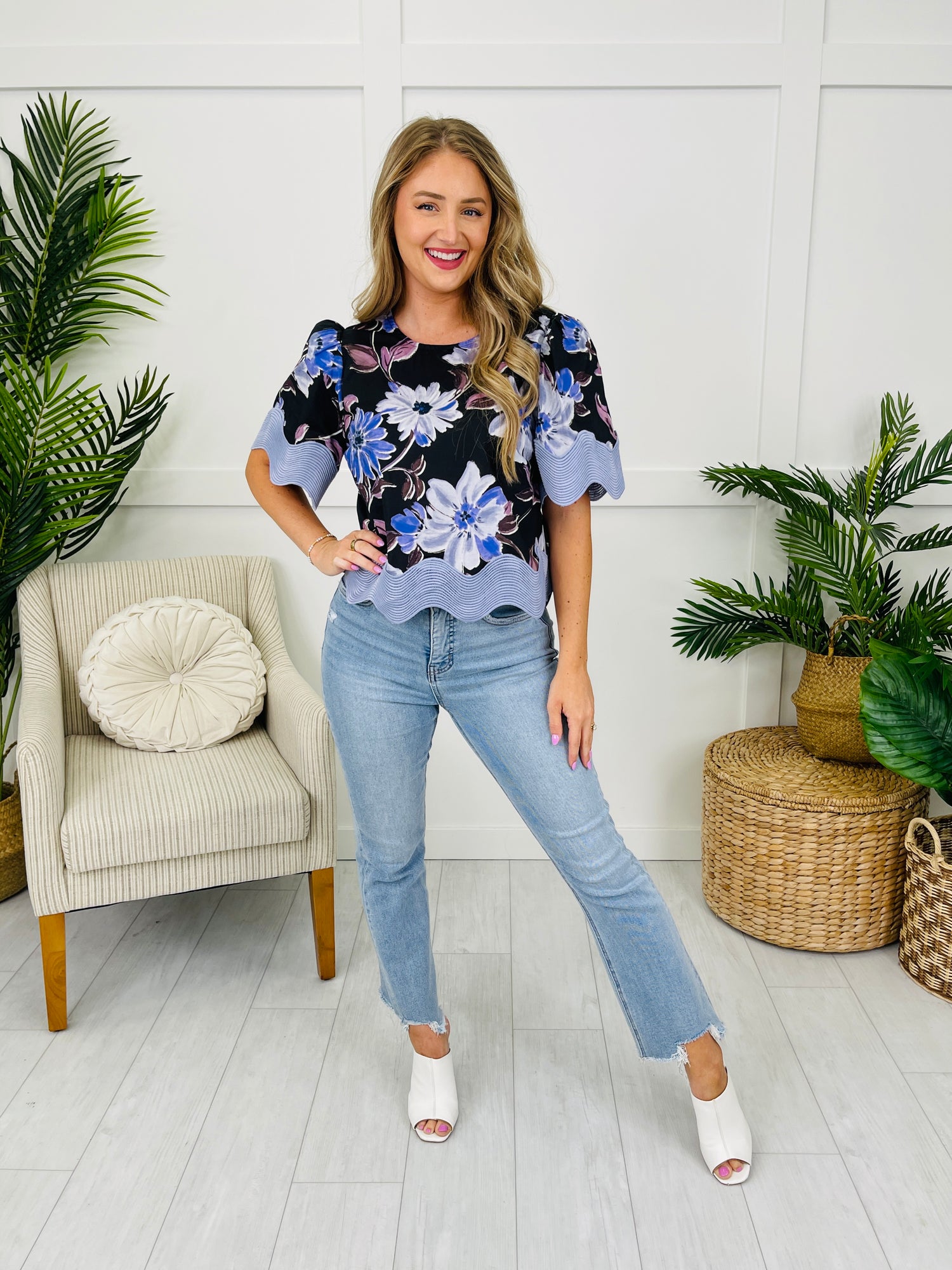 This stunning top brings a fresh and feminine touch to your wardrobe! The bold floral print pops beautifully against the background, while the wavy scalloped trim adds playful texture to the sleeves and hem. Its relaxed, flowy fit ensures comfort without sacrificing style—just pair it with denim and wedges for an effortlessly chic look!