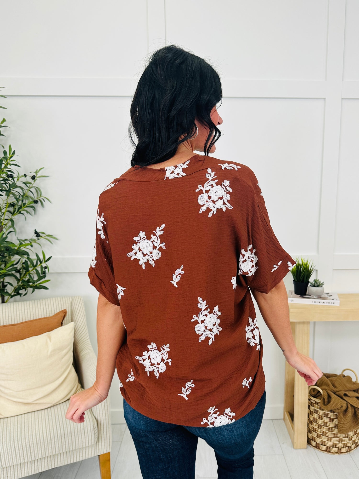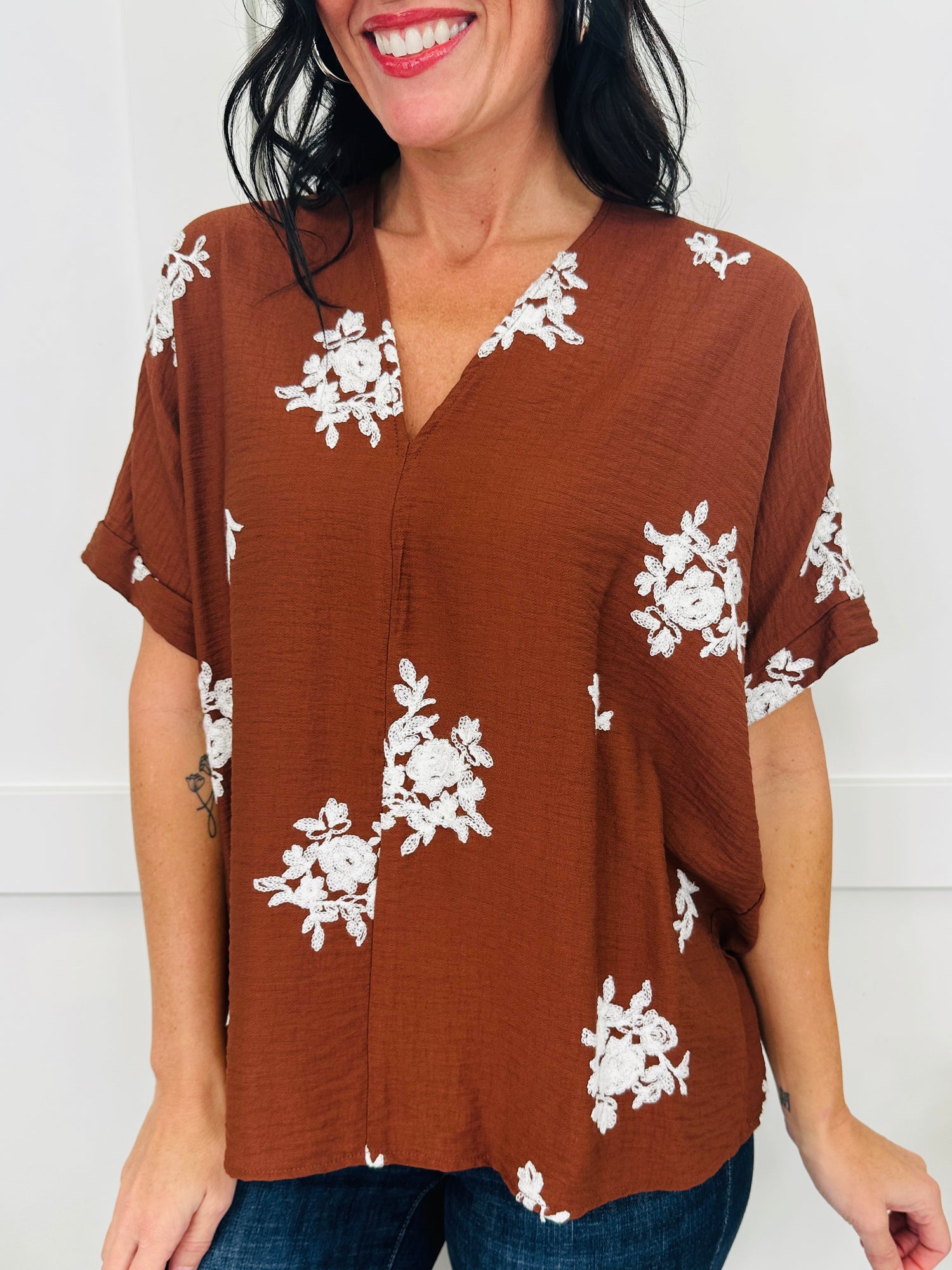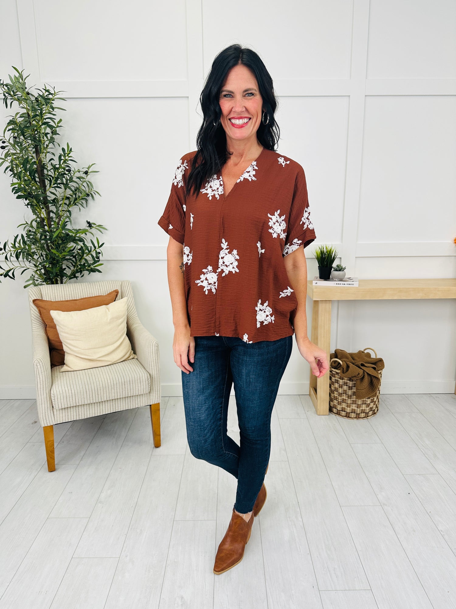 This top blends effortless elegance with everyday charm. The embroidered white floral accents stand out beautifully against the warm brown backdrop, adding texture and a touch of femininity. With its relaxed fit, v-neckline, and customer favorite MOCO Flow material, this piece is an easy choice for both casual days and dressed-up moments.