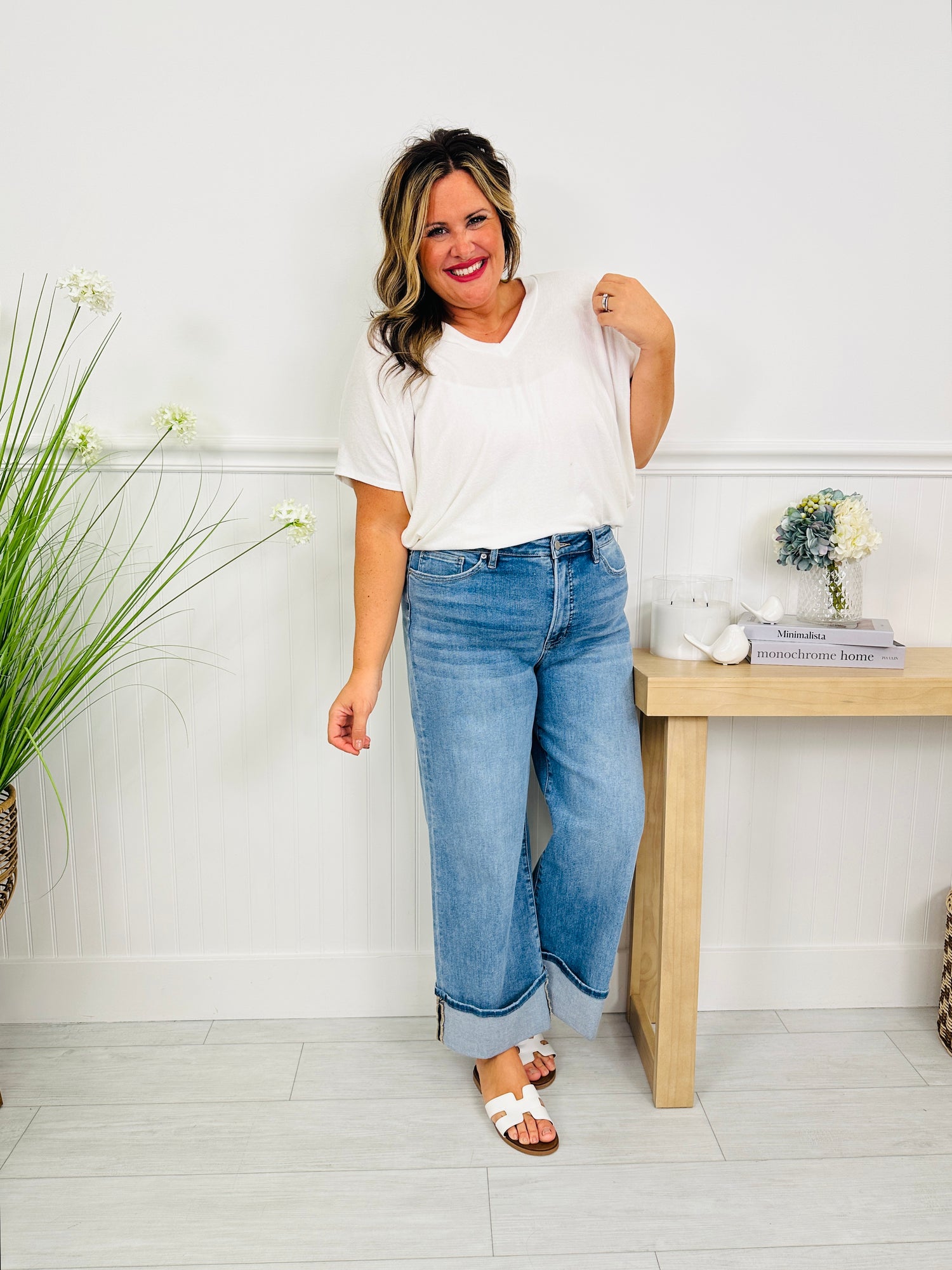 These cuffed wide leg cropped jeans are the trendy basic jean your closet needs this spring. They have incredible stretch and snap back, which means they won't sag as the day goes on. They are buttery soft and so comfortable-- you will never want to take them off! They feature our viral tummy control panel that will hold everything in for an amazing confidence boost! These are completely non-distressed and can be worn from work to weekend to everywhere in between. The cuff is sewn so that you don't have to worry about it un-cuffing as the day goes on! Your wardrobe has been waiting for these jeans!