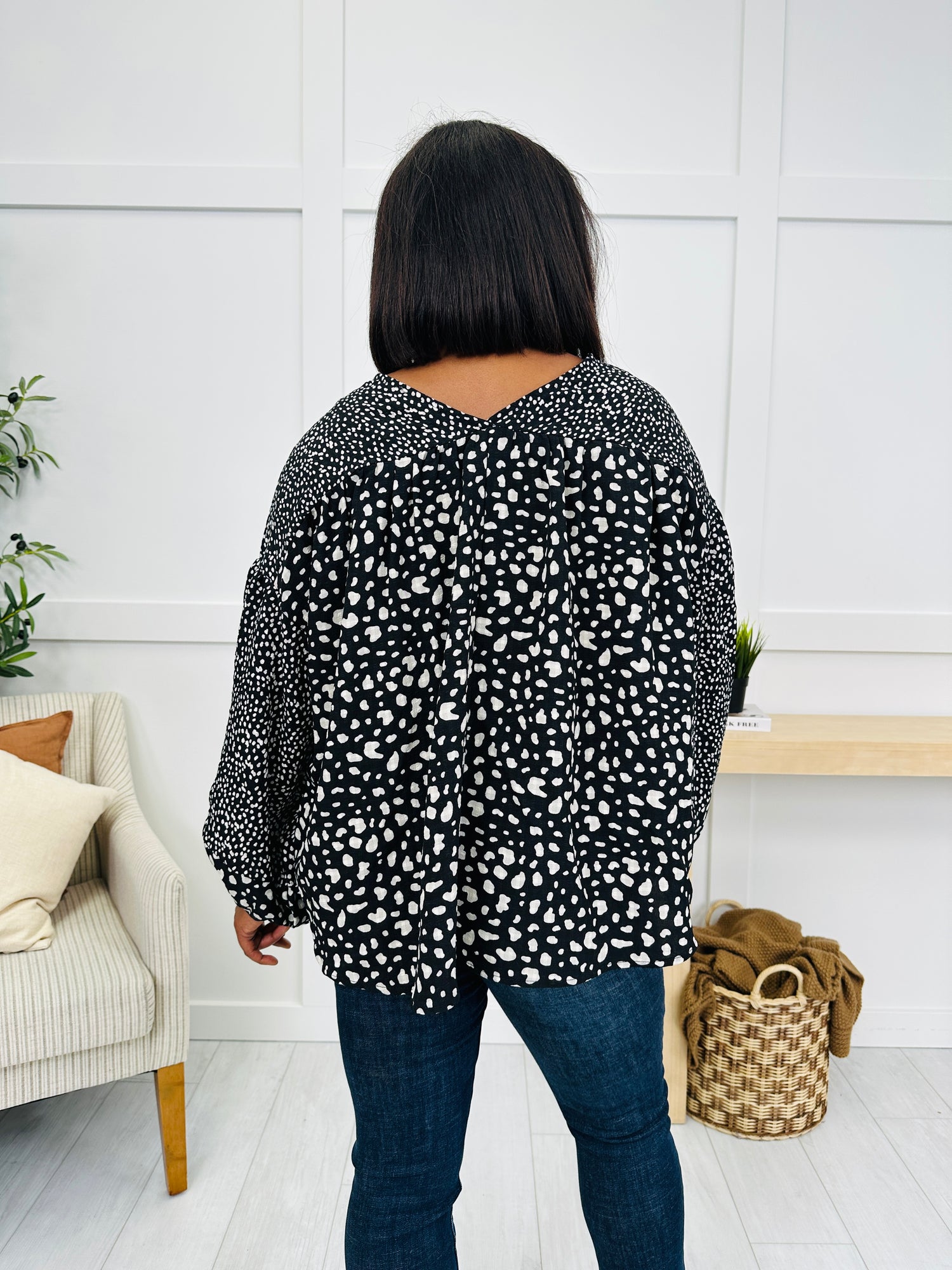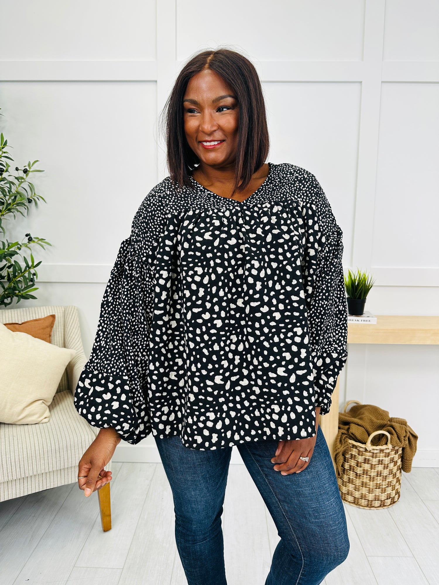 Make a bold yet effortless statement in this eye-catching top. The playful spotted print adds a fun and trendy vibe, while the billowy, statement sleeves elevate the look with standout style. Finished with a flowy, relaxed fit, it’s the perfect piece to pair with your favorite denim for a chic and comfortable outfit.