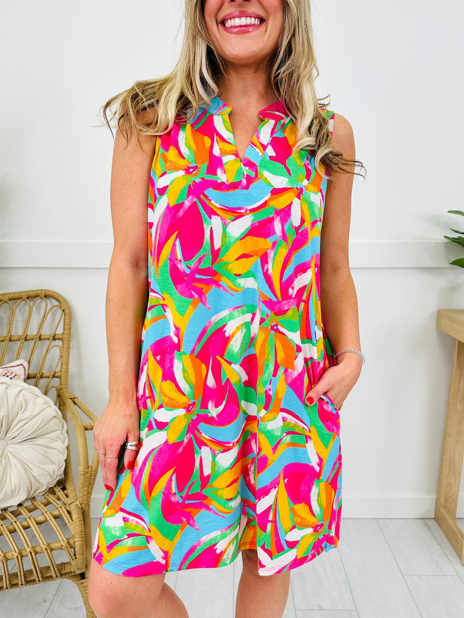 The Palms and Plans dress is officially our best selling dress this season. It's made form our best selling wrinkle material, which is cool to the touch and perfect for warmer weather! Our customers rave about this amazing material! This dress is flowy and flattering on every single body type. Did we mention it has pockets? This dress is so versatile, too! You can dress it up to brunch, church, wedding showers, and other events, and because it is wrinkle free, you can also throw it in bag and use it has a bathing suit cover up.