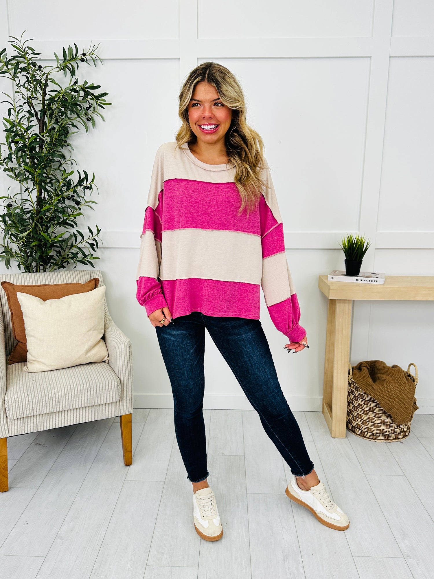 This striped top combines a fun mix of bright pink and beige for a fresh, casual look. With its relaxed fit and soft fabric, it promises comfort and style. Pair it with jeans or leggings for an easy-going yet stylish outfit.