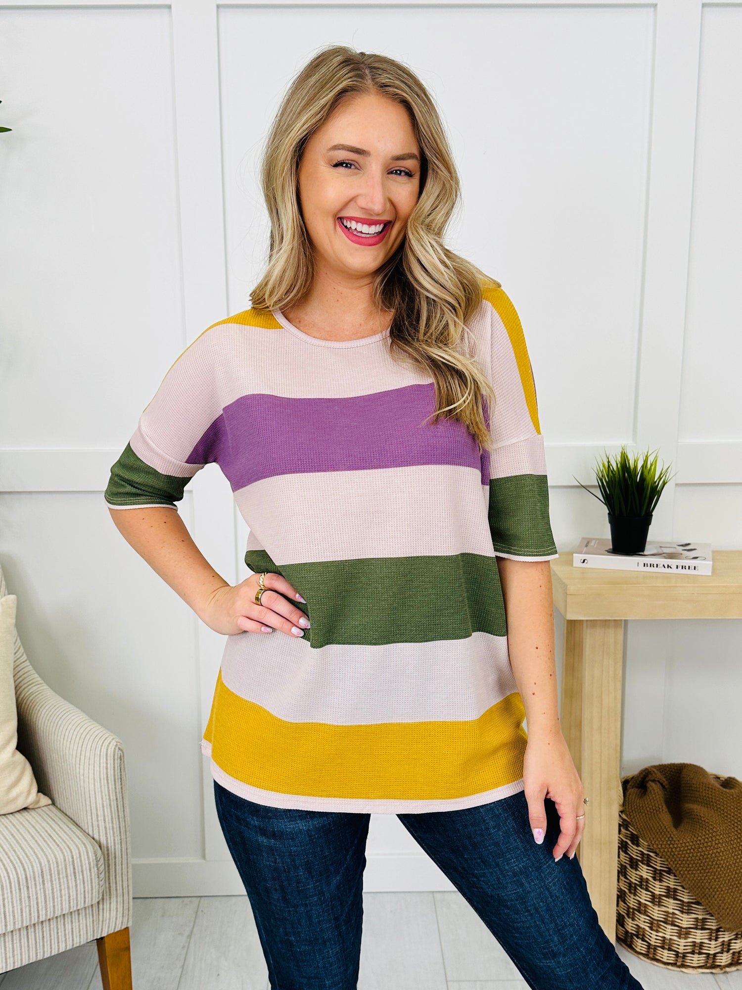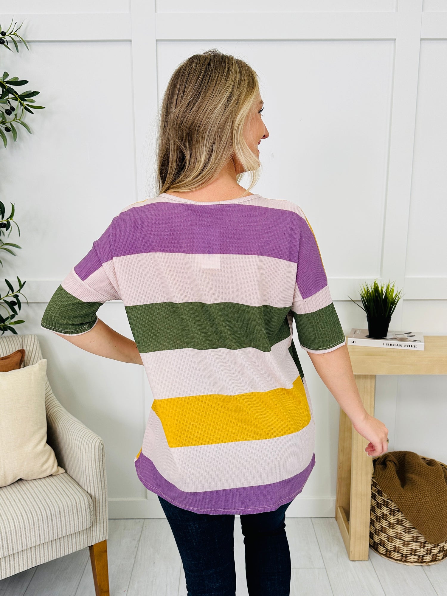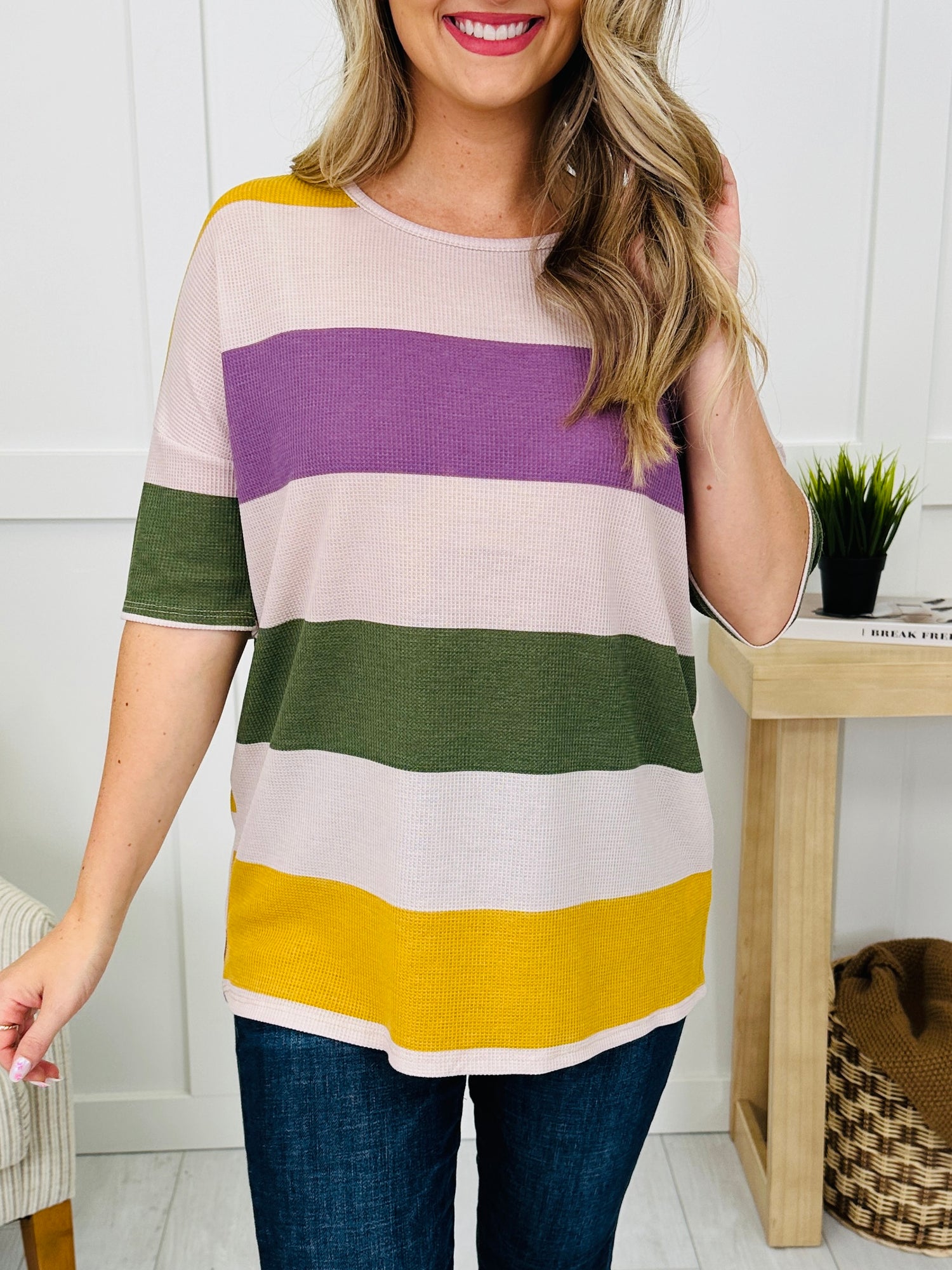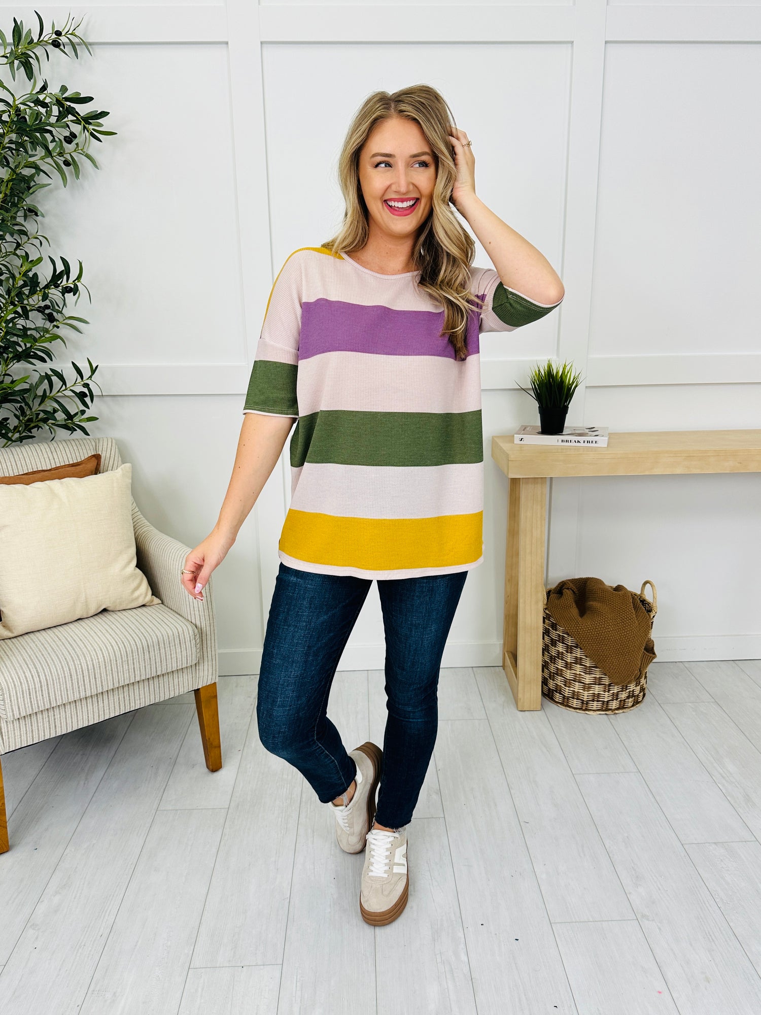 Brighten up your wardrobe with this playful, colorblock striped top. The soft, textured knit offers a comfortable feel, while the short sleeves and relaxed fit keep it easy to wear all day long. Perfect for pairing with your favorite denim or leggings, this fun piece adds a touch of bold, cheerful style to any casual look.