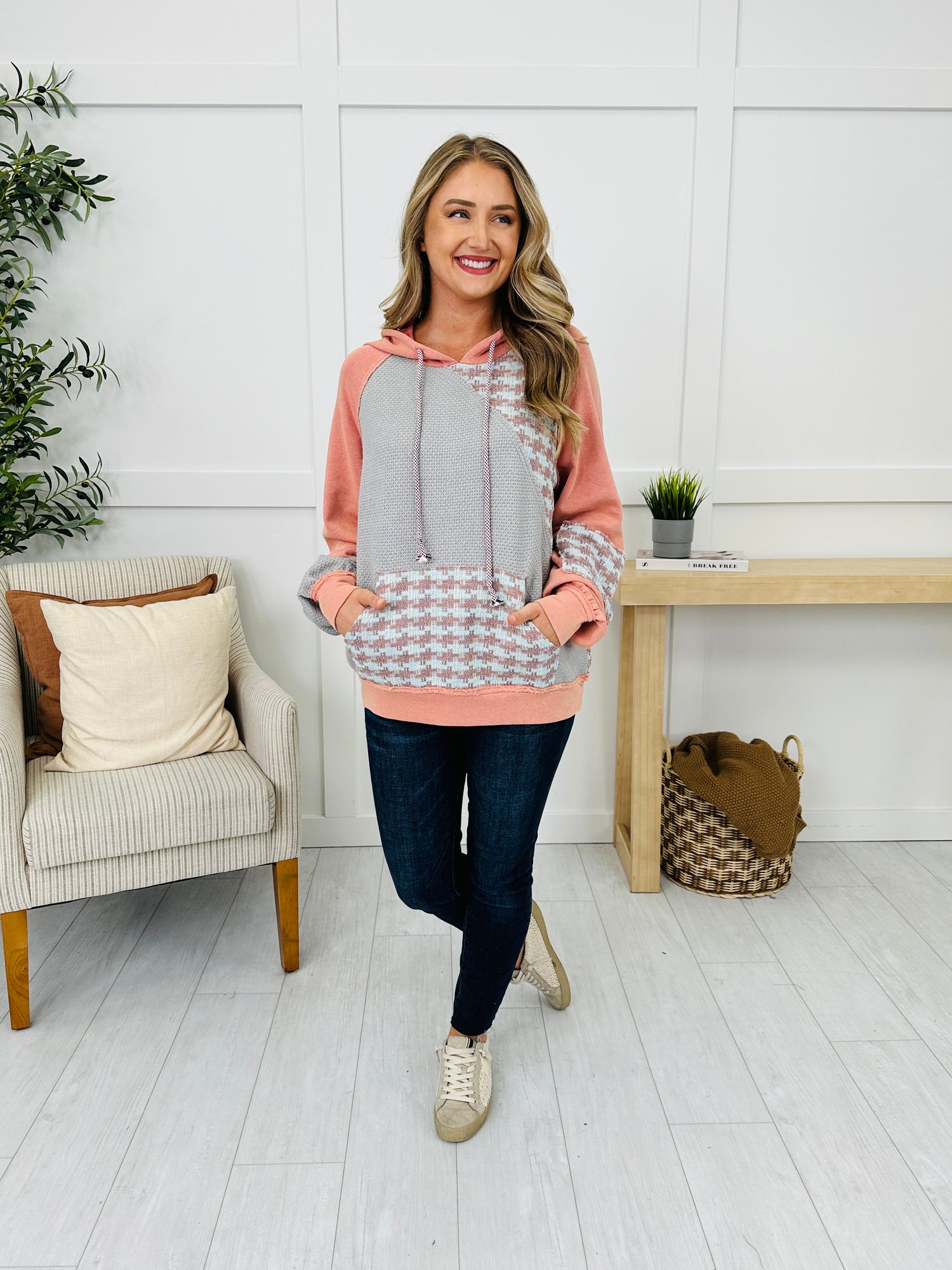 This playful pullover is the perfect blend of cozy and cute! From the color-blocked sleeves to the eye-catching houndstooth details on the pocket and hood, every inch is packed with charm. Finished with a trendy texture and a comfy drawstring hood, it’s your go-to for laid-back days that still call for a little style.