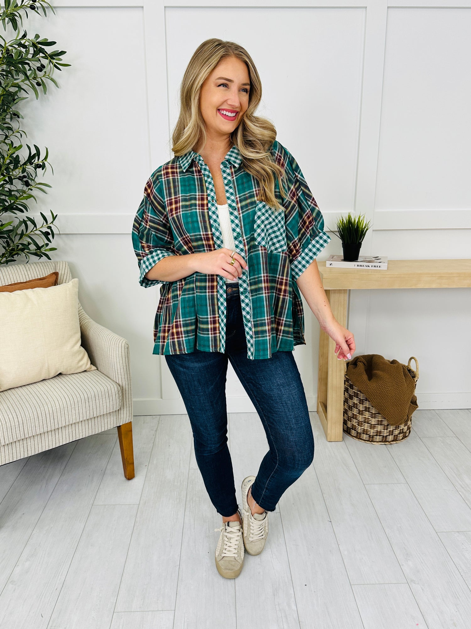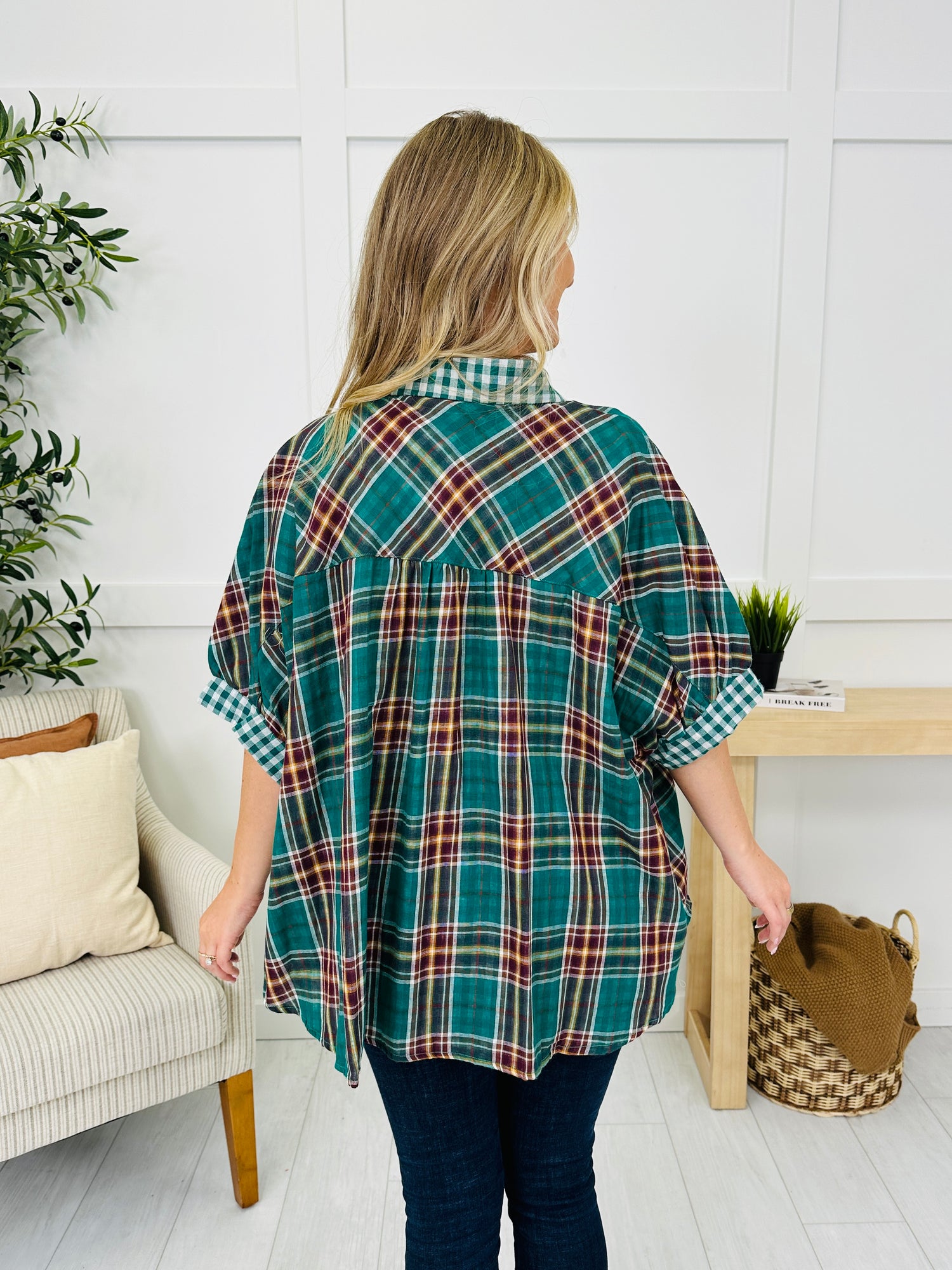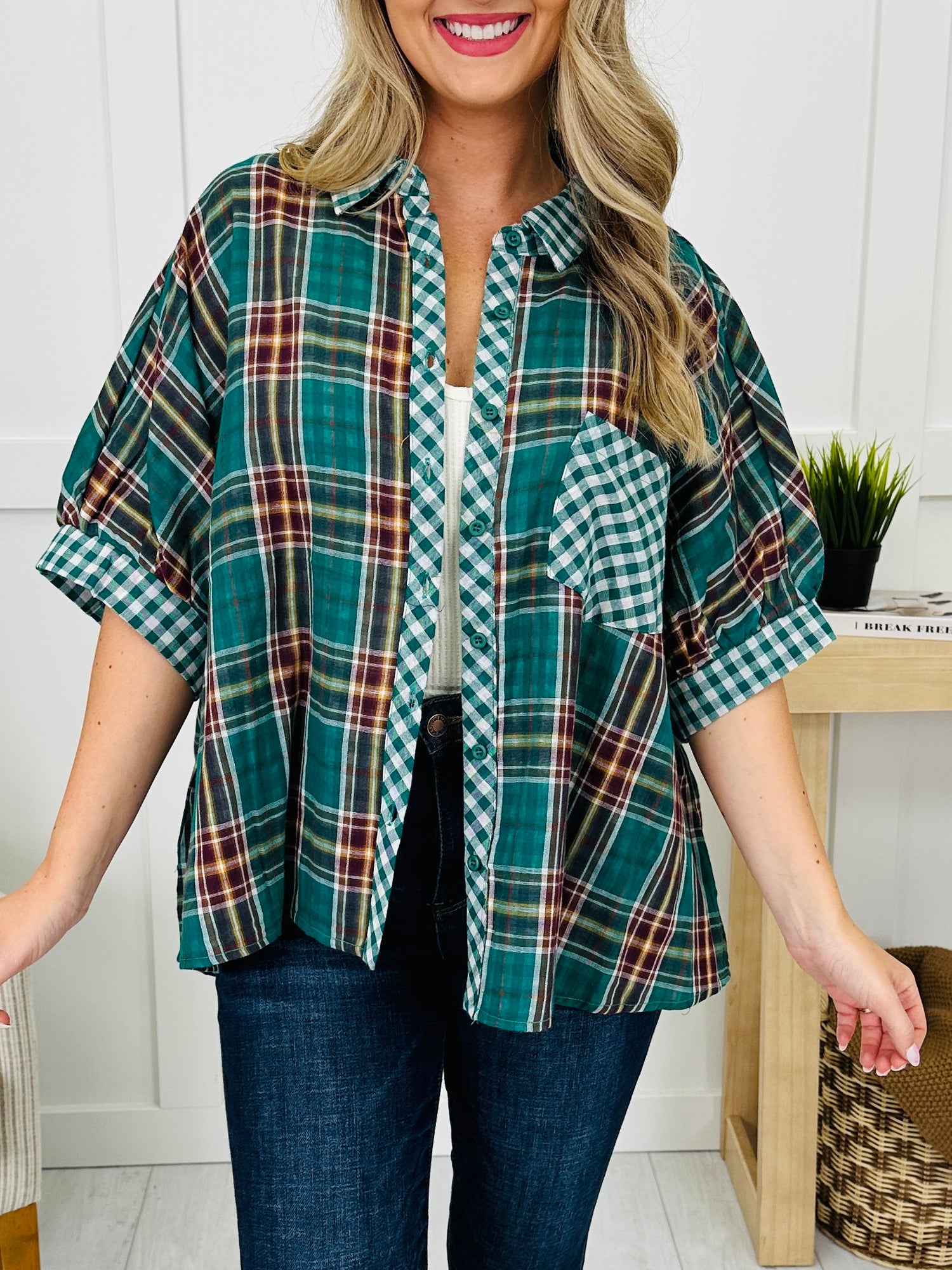 This playful plaid top brings all the cozy vibes with a bold twist! Featuring contrasting gingham accents along the button placket, pocket, and sleeve cuffs, it adds the perfect pop of personality. Plus, the roomy fit makes it effortlessly cute and comfy—just right for layering or wearing solo with your favorite denim.