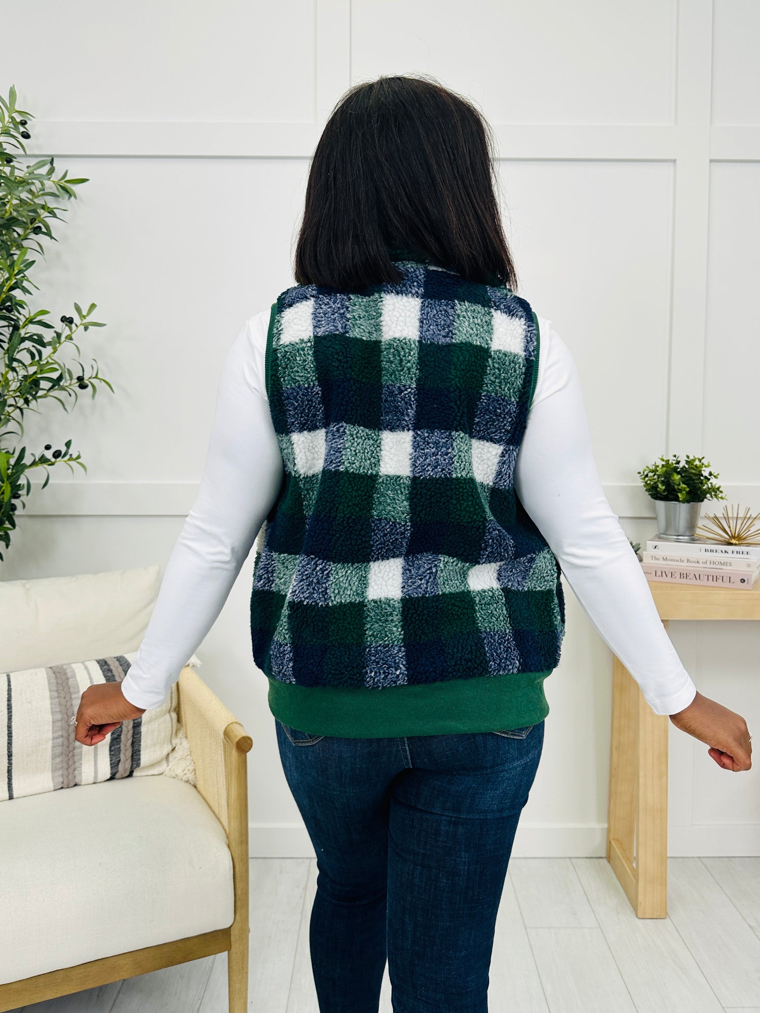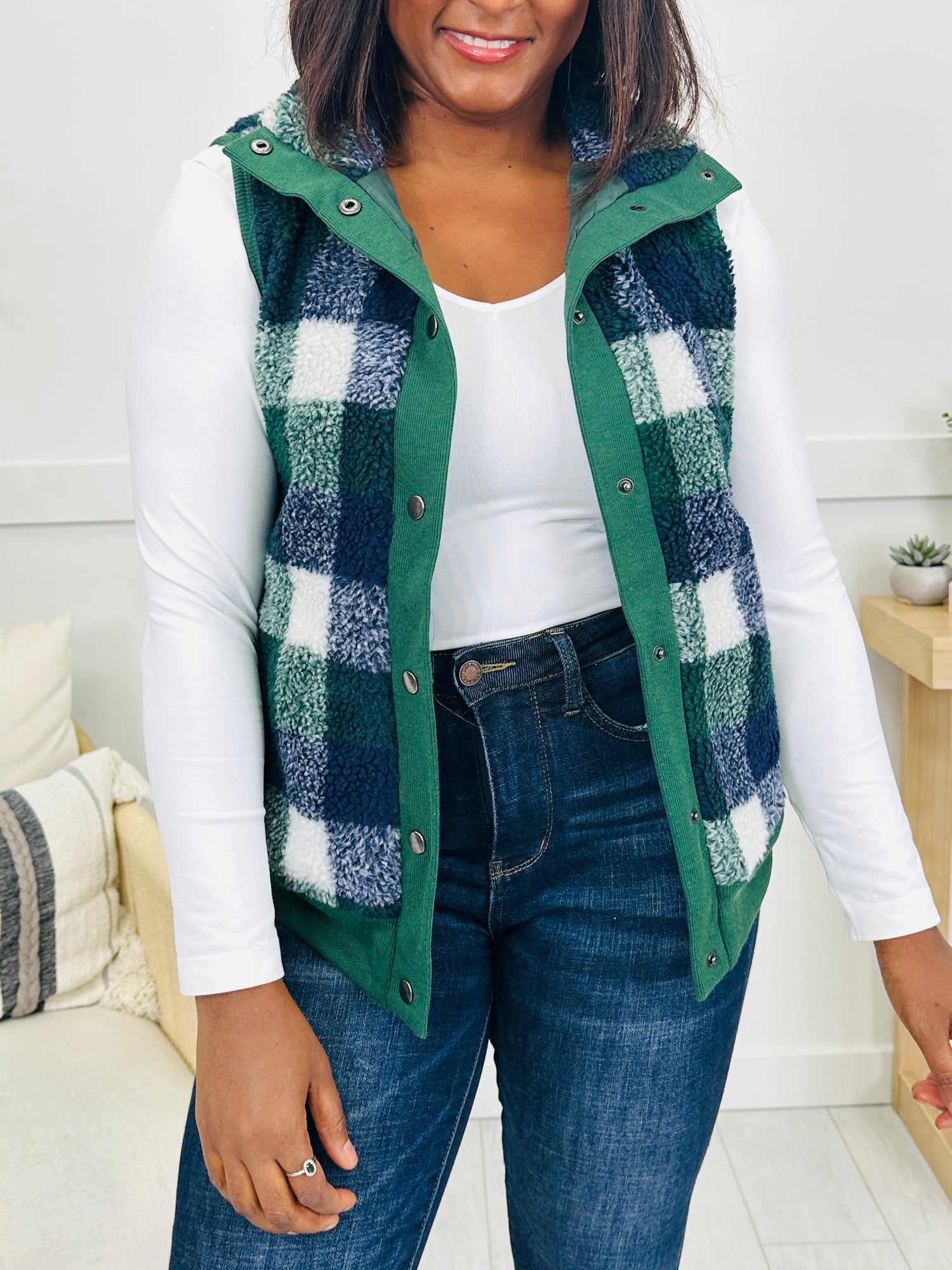This vest is the perfect mix of cozy and casual with its soft plaid sherpa fabric that brings a touch of texture to your look. The corduroy trim adds a structured detail that makes it stand out, while the button front closure keeps the fit easy and versatile. Layer it over your favorite tops for a warm and stylish finish that works all season long.