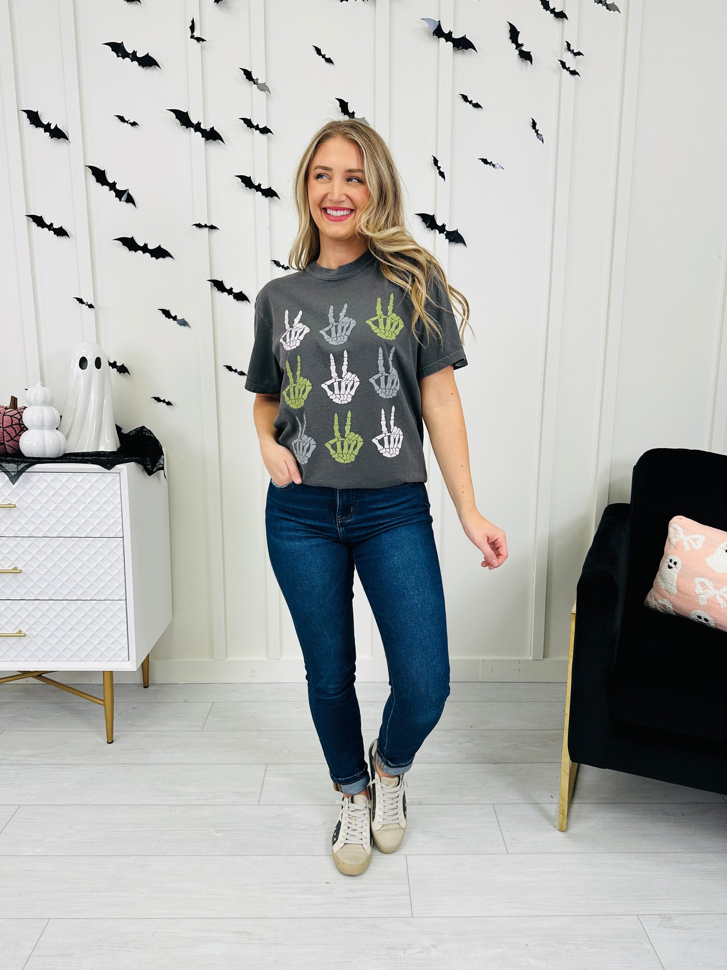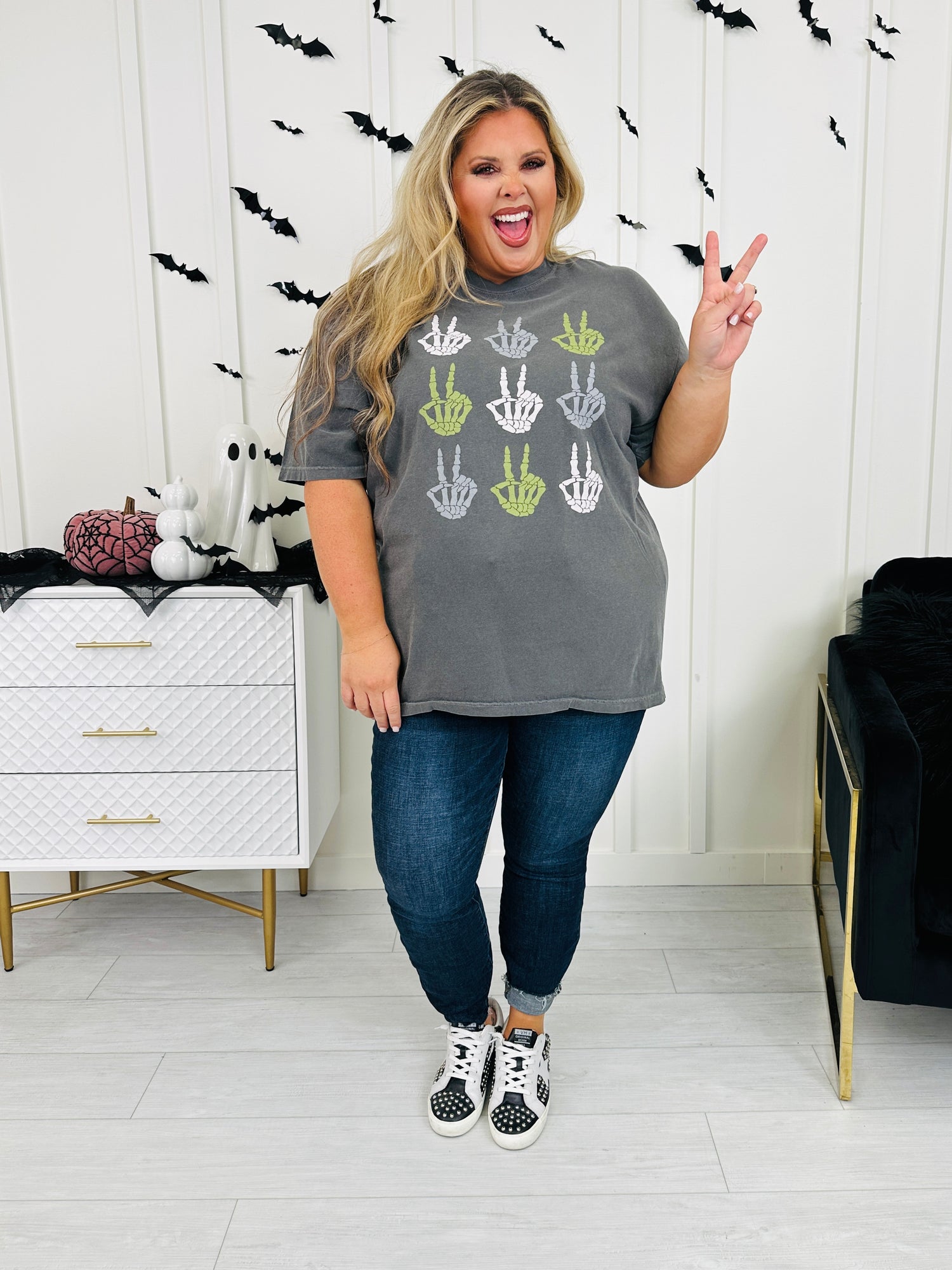 Spook up your style this Halloween with our Skeleton Peace Sign Tee! Featuring eerie-cool skeleton hands flashing the peace sign, this tee blends just the right amount of creepy and casual. Each shirt is screen printed in-house for a bold, long-lasting design you’ll love beyond spooky season. Printed on a premium Comfort Colors tee, it’s soft, relaxed, and perfect for haunted houses, pumpkin patches, or just everyday chills.