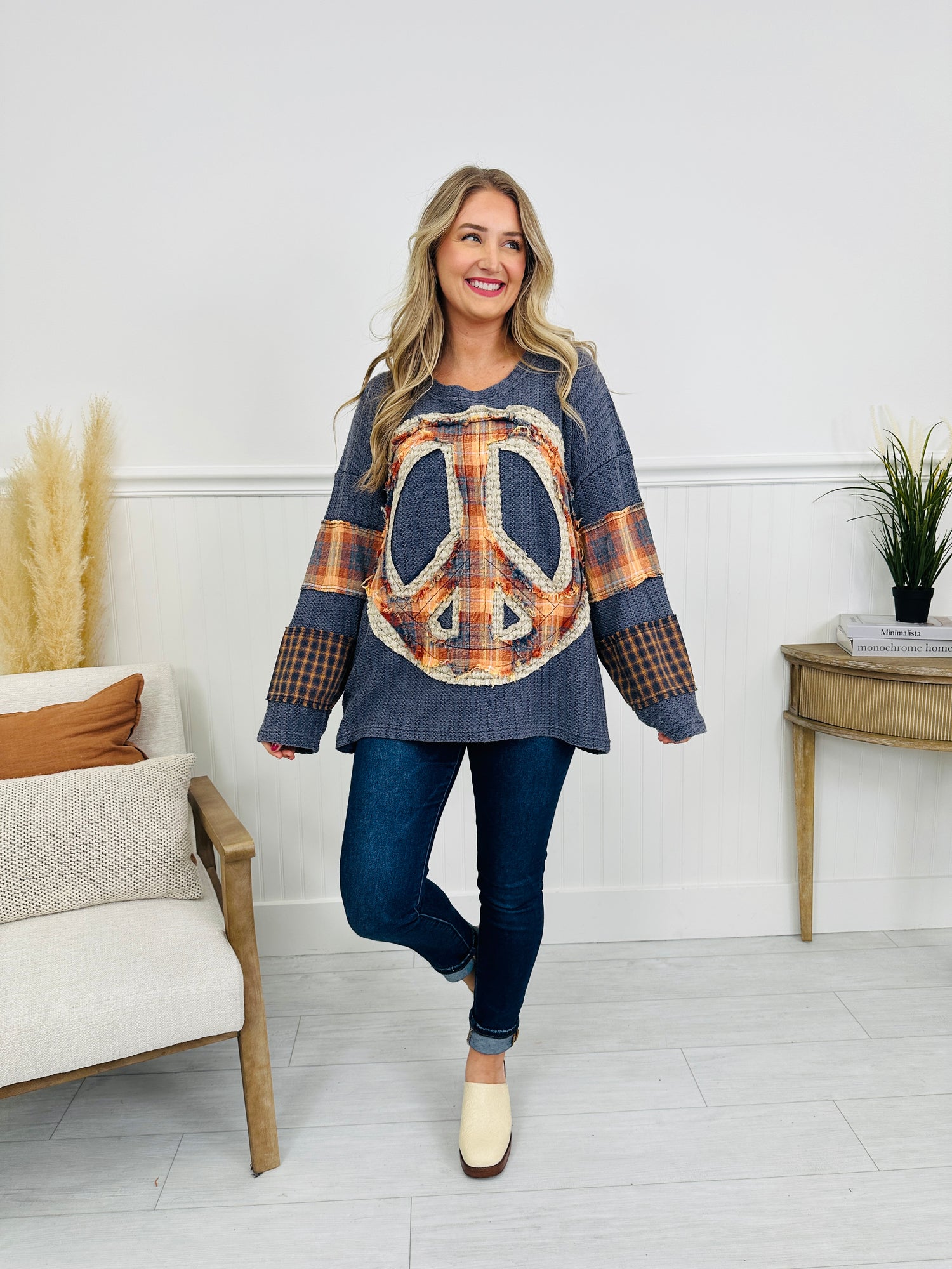 Add a little peace and plenty of personality to your wardrobe with this unique top! Featuring a bold, patched peace sign front and center, this cozy knit combines plaid, textured trim, and frayed detailing for an edgy, boho-inspired vibe. With its relaxed fit and standout sleeves, it’s the perfect blend of comfort and statement style!