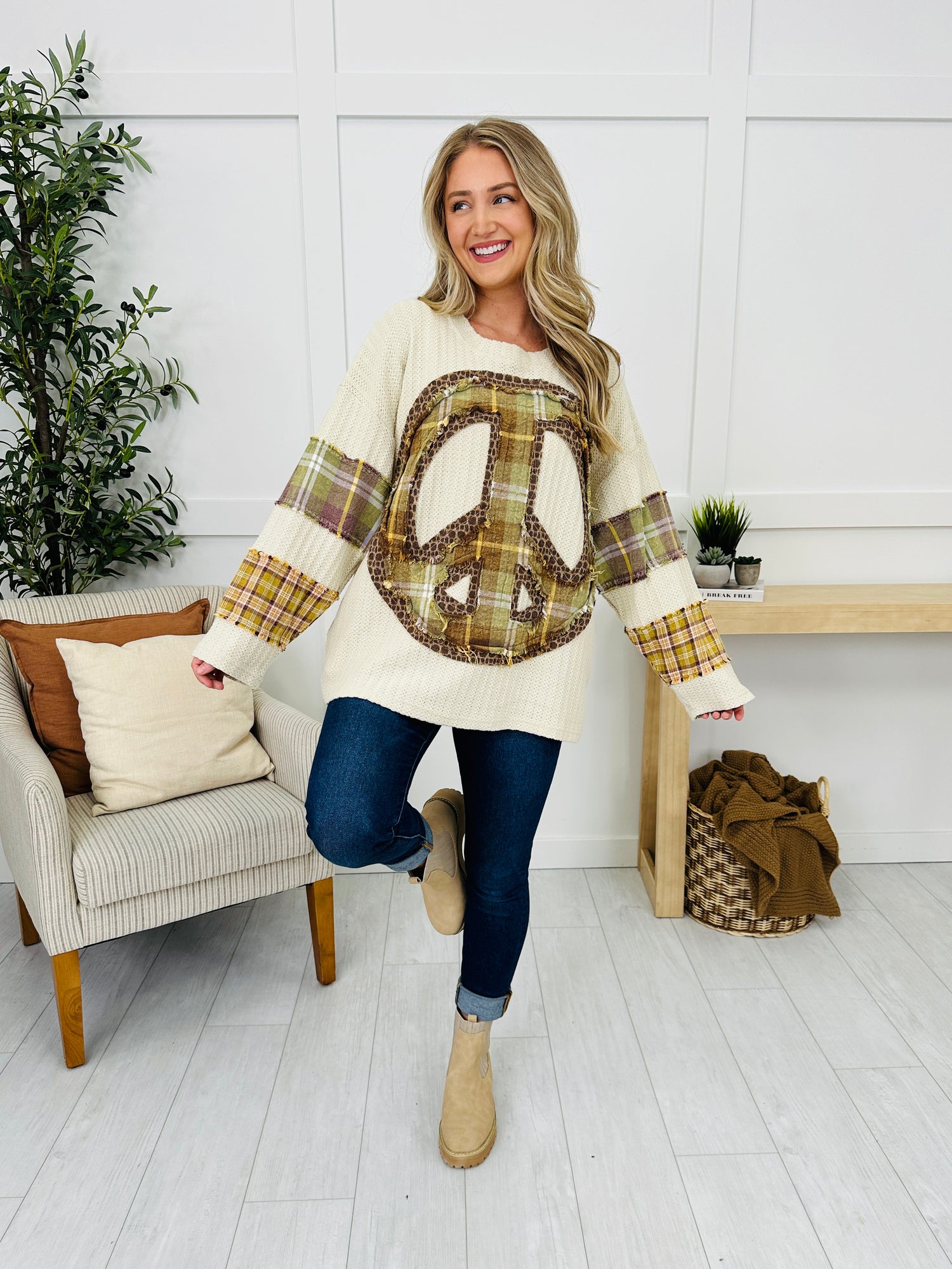 Add a little peace and plenty of personality to your wardrobe with this unique top! Featuring a bold, patched peace sign front and center, this cozy knit combines plaid, animal print, and frayed detailing for an edgy, boho-inspired vibe. With its relaxed fit and standout sleeves, it’s the perfect blend of comfort and statement style!