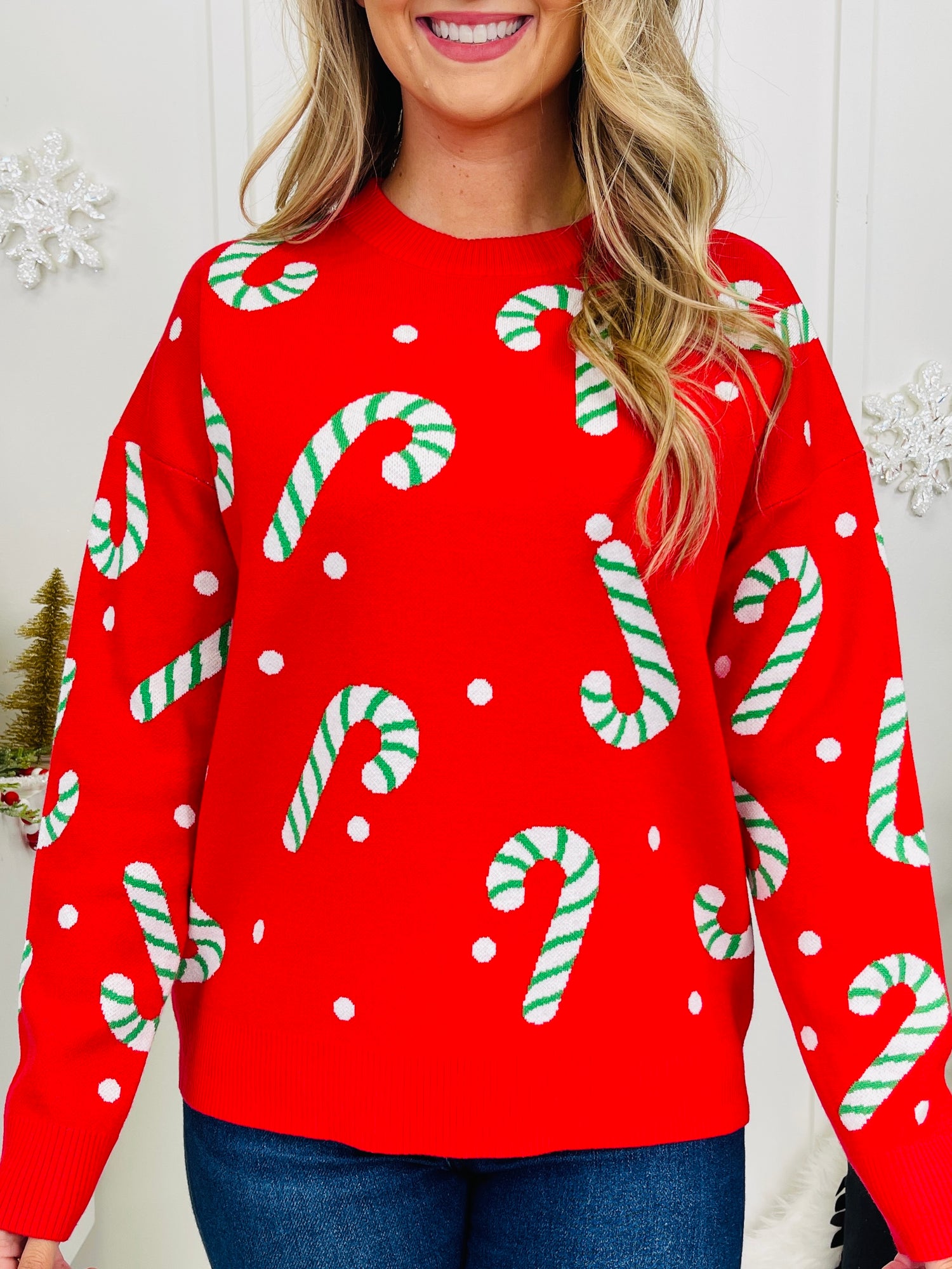 Sweeten up your holiday wardrobe with this adorable candy cane sweater! Featuring a bold red base sprinkled with green and white candy canes and dotted accents, this piece brings a cheerful pop of Christmas spirit. Its playful pattern and cozy knit make it perfect for everything from holiday parties to casual festive days at home.