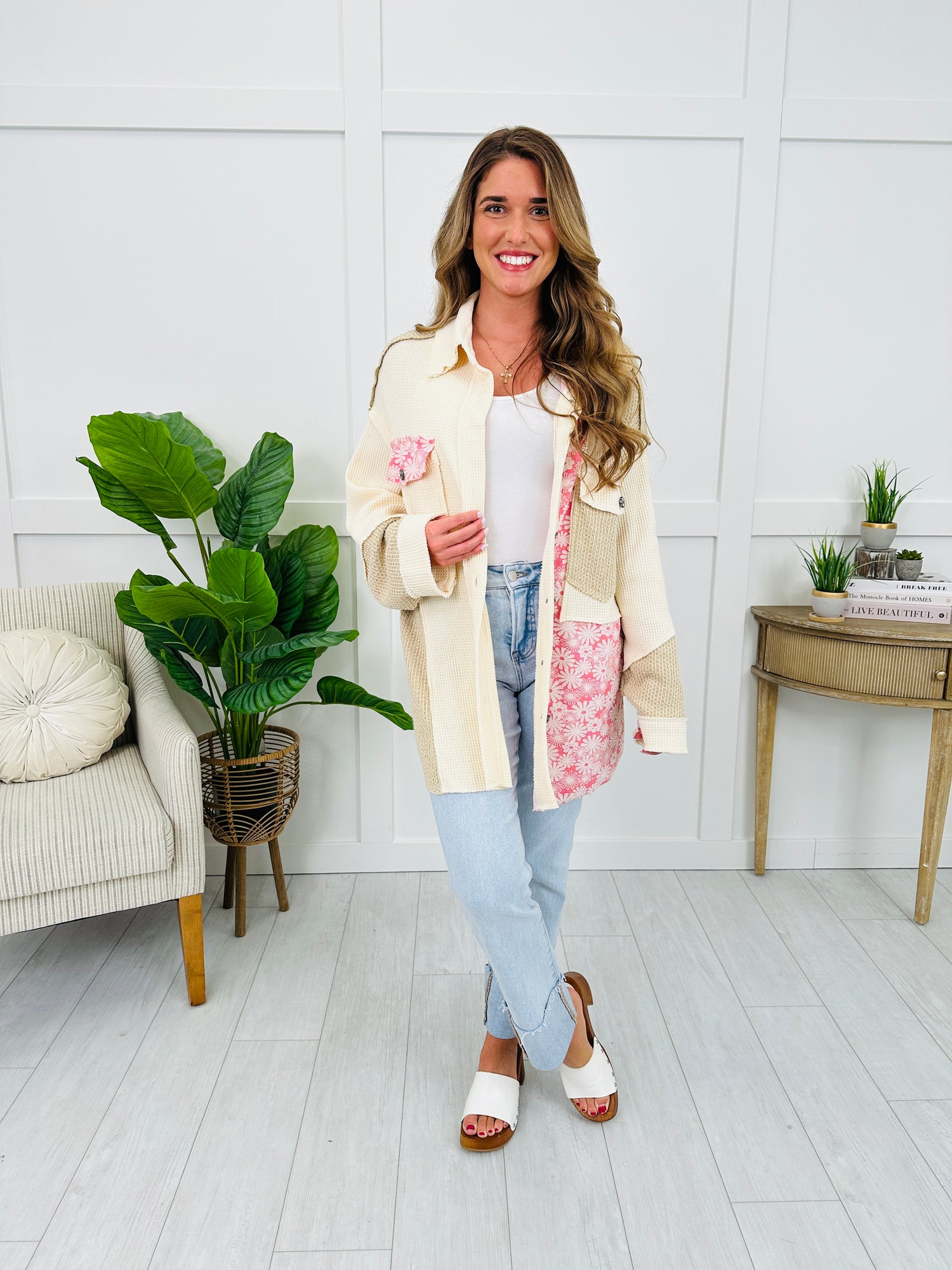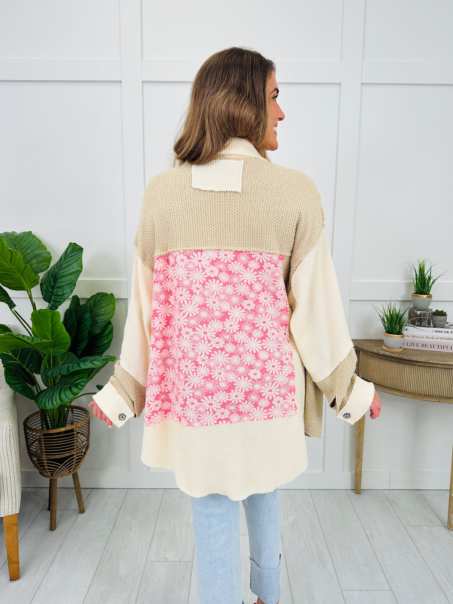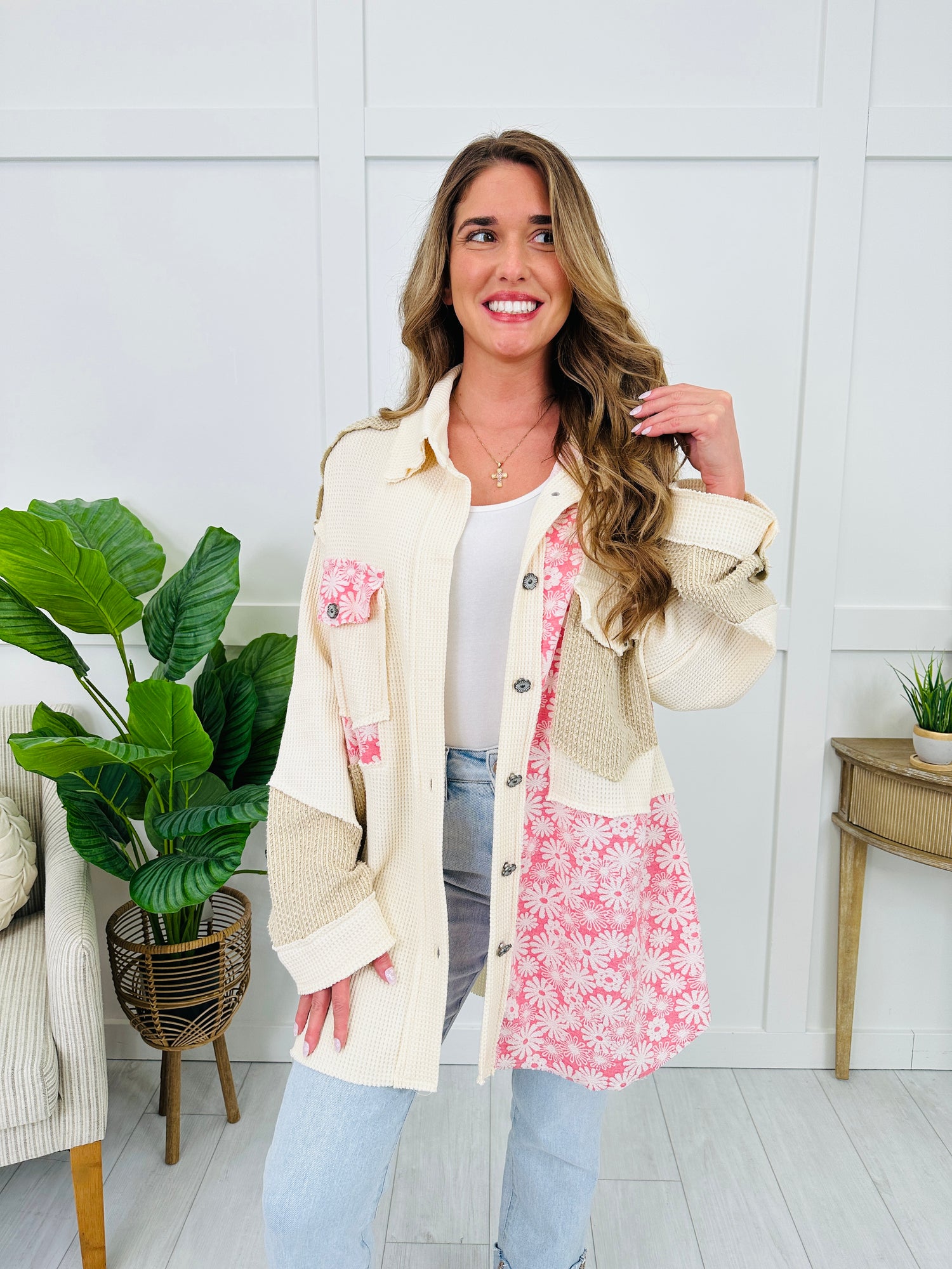 This top brings cozy texture and unique detail together in the best way! The mixed textured panels add depth and dimension, while the floral accent trim gives it a playful, feminine twist. Finished with a button-down front and roomy sleeves, this piece is perfect for layering and adding a touch of charm to any outfit.