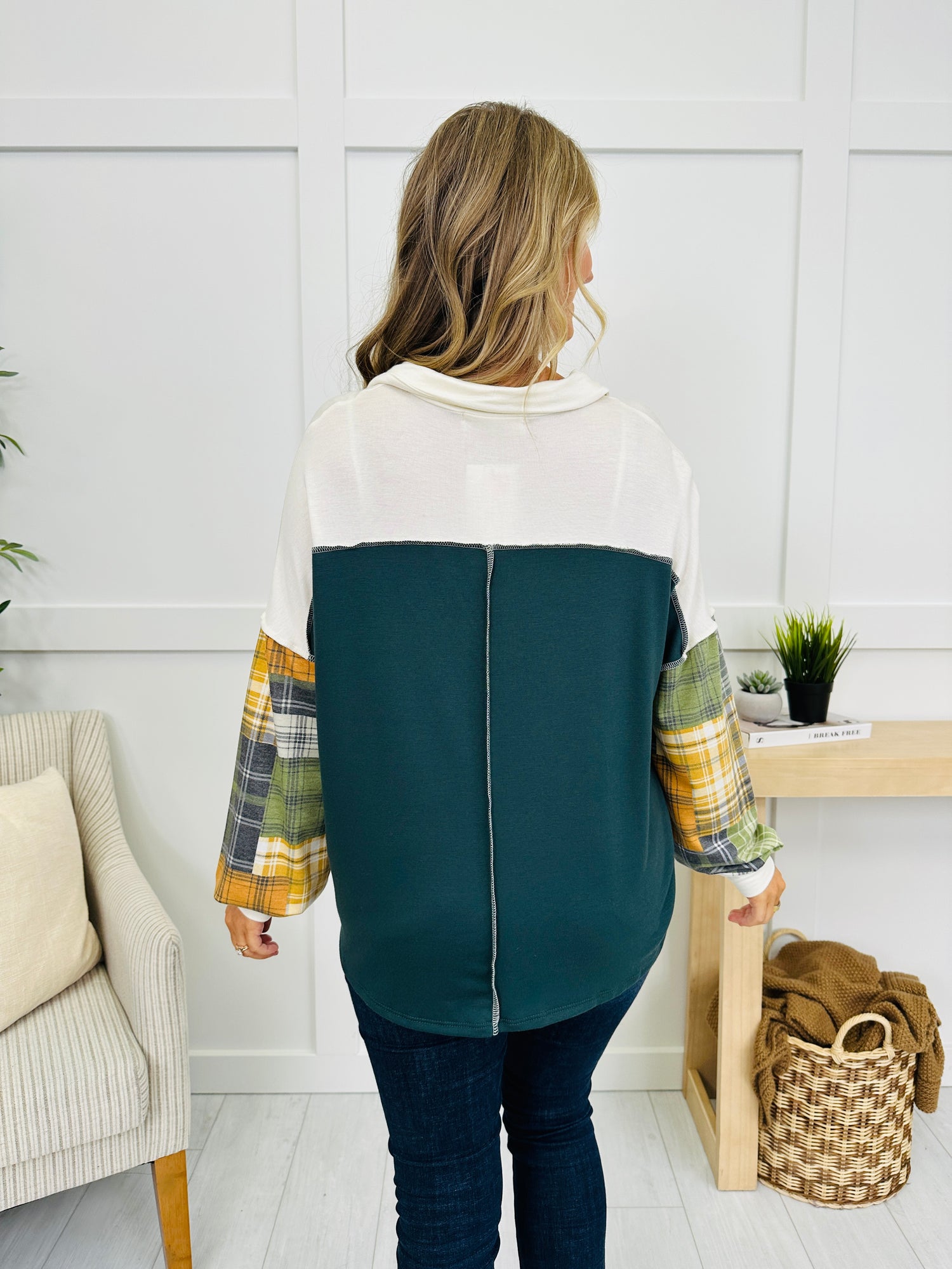 This stylish top brings together comfort and flair with its unique plaid sleeves and soft, relaxed fit. The v-neck collar adds a touch of sophistication, while the mix of colors in the plaid design gives it a fun, casual vibe. Ideal for layering or wearing solo, this piece effortlessly combines trendy details with everyday wearability.