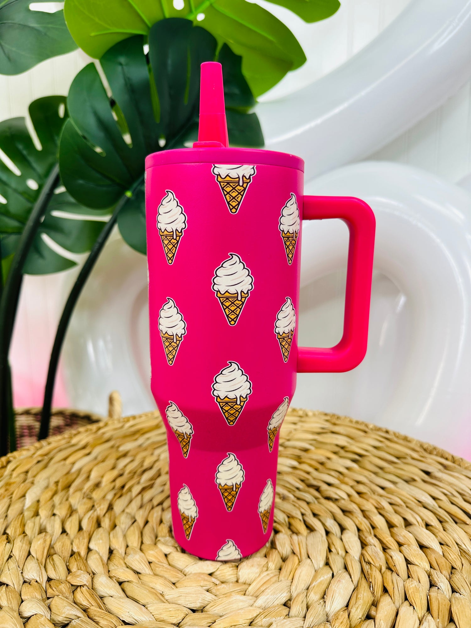 Stay hydrated in style with this adorable ice cream cone print tumbler! Designed to keep your drinks at the perfect temperature, it features a sturdy handle, secure lid, and straw for ultimate convenience. Whether you're on the go or sipping at home, this tumbler is the chic and functional accessory you’ll never want to be without!