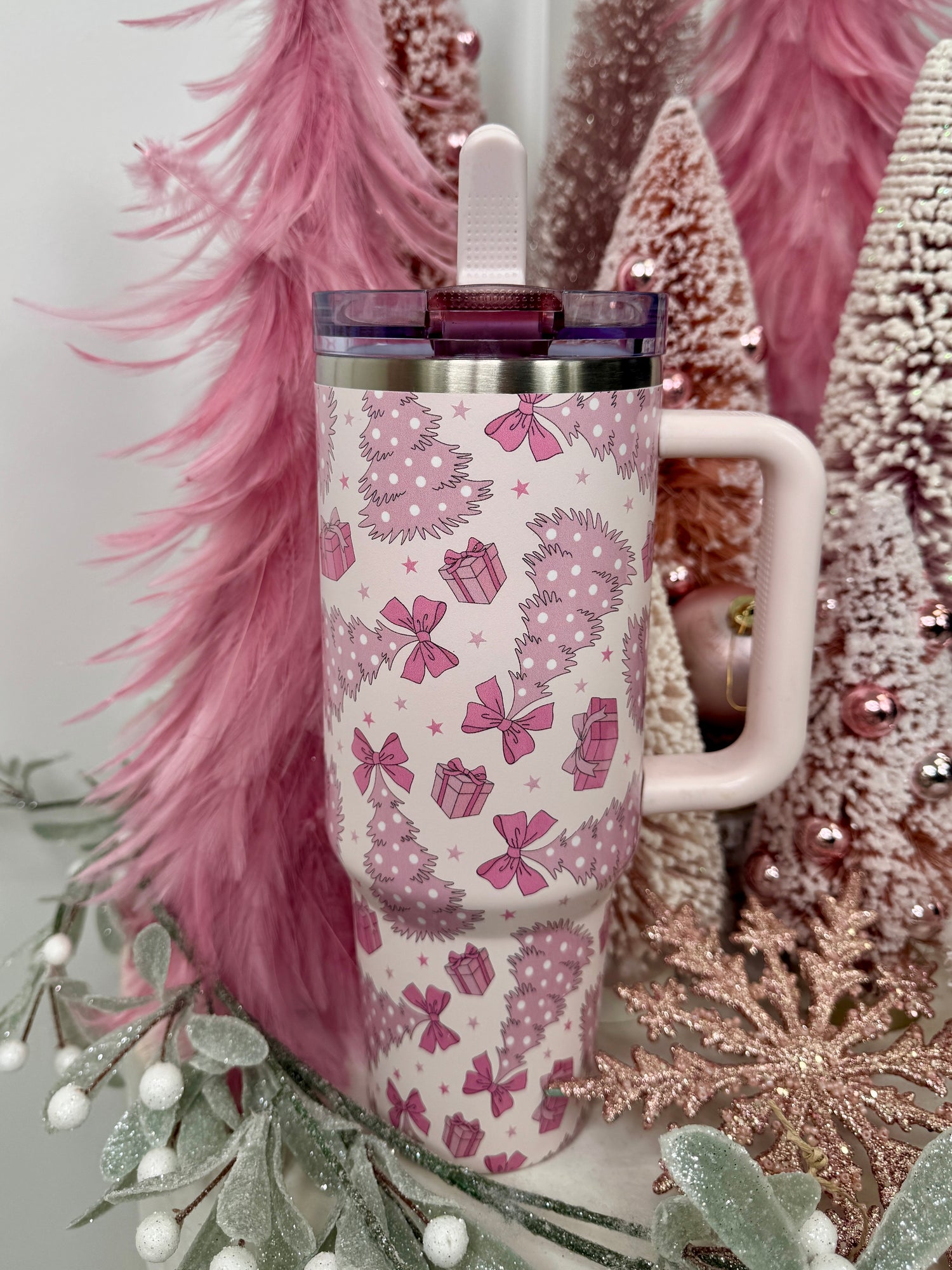 Add a festive touch to your holiday season with this cheerful pink holiday tumbler, featuring a fun design of bows and gift-wrapped presents. The spill-proof lid and convenient handle make it perfect for on-the-go sipping, while the bright and playful design brings a dash of holiday cheer to your everyday routine. Stay hydrated in style while celebrating the season!