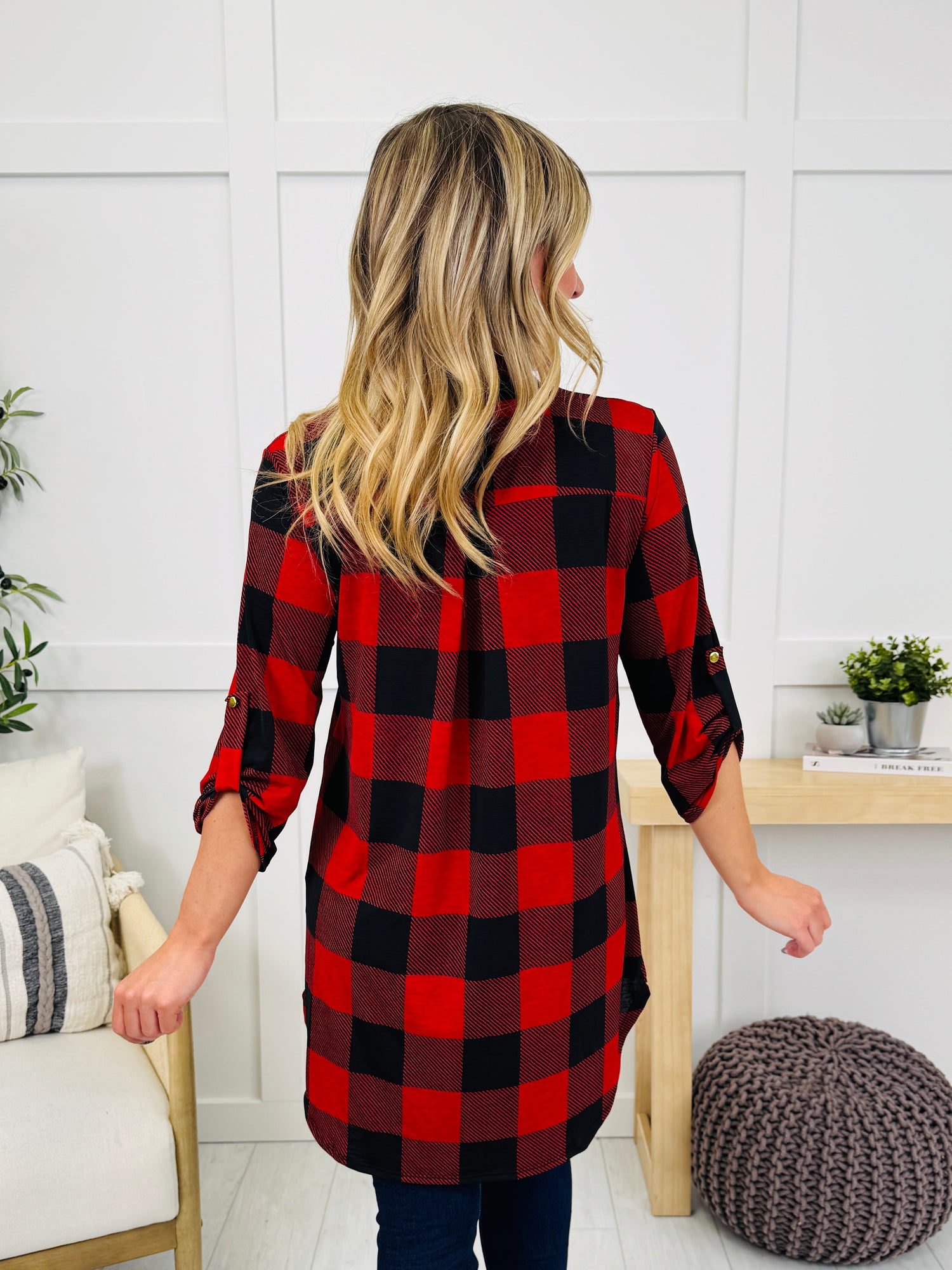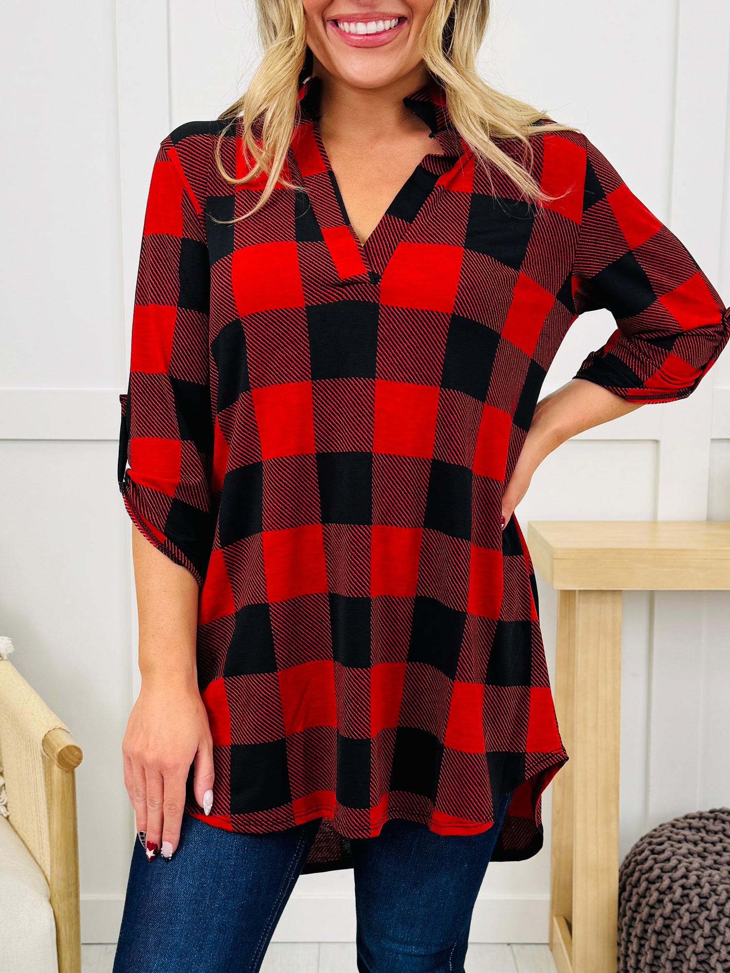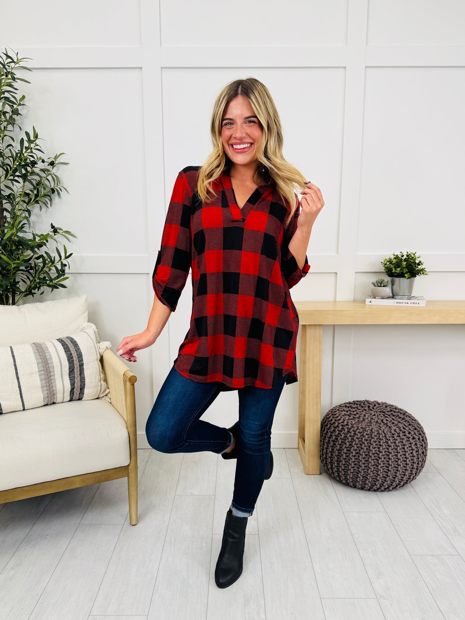 This plaid top brings classic charm with a cozy, casual twist. The bold red and black pattern stands out beautifully, while the split v-neckline adds a touch of modern flair. Finished with rolled sleeve tabs, it’s the perfect piece to pair with jeans or leggings for an effortlessly festive and flattering look.