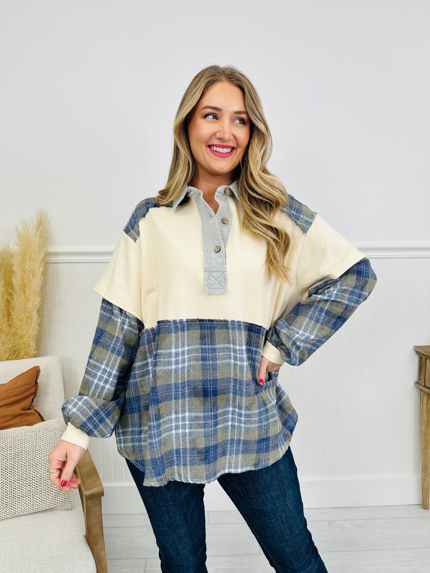This standout top mixes casual comfort with classic charm, featuring plaid contrasting panels that instantly elevate the look. A buttoned neckline detail adds a touch of timeless style, while the cozy longer length and curved hem design gives it that effortless, laid-back vibe. Easy to style and perfect for everyday wear, this piece is a must-have addition to your casual wardrobe.
