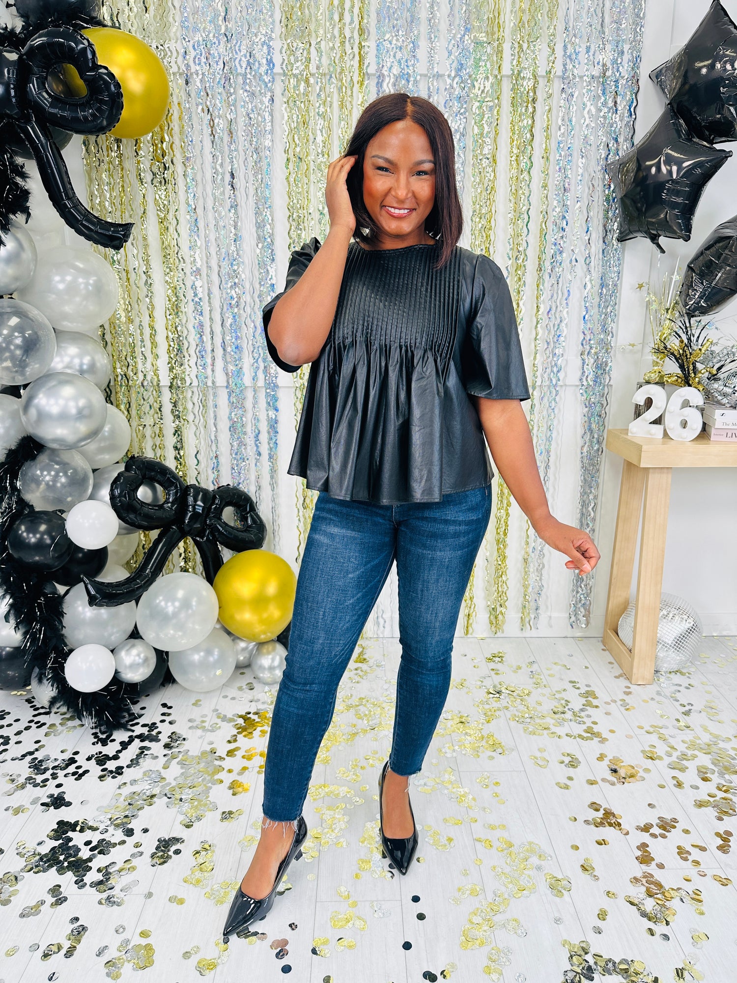 This stylish top combines boldness with sophistication, featuring a chic pleated detailing along the front that adds texture and depth. The tiered silhouette adds dramatic flair, while the faux leather finish gives it an edgy, contemporary look. Perfect for pairing with jeans or trousers, this top is ideal for making a statement at any casual or semi-formal occasion.