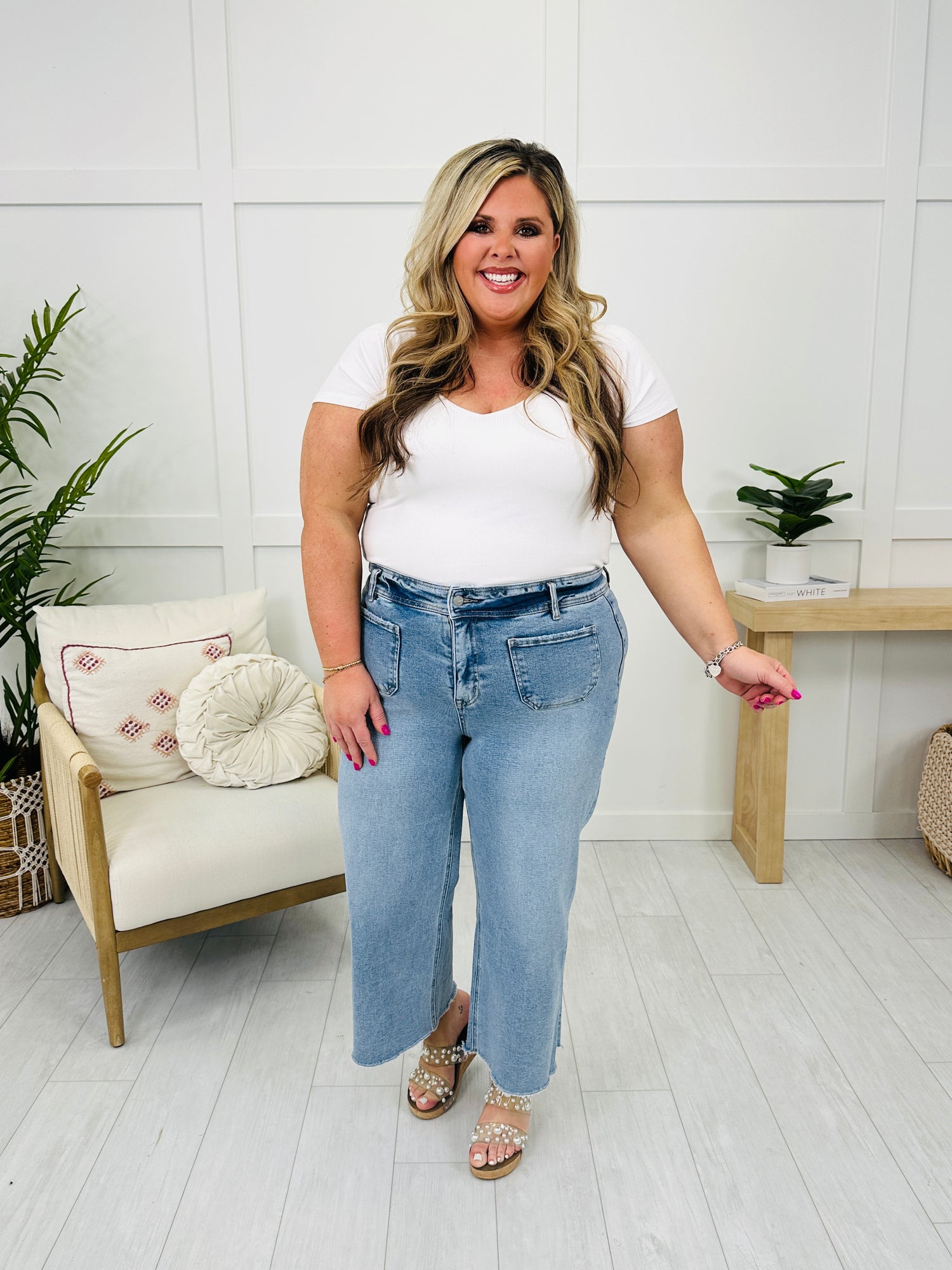 These new jeans are so adorable and perfect for spring! They are a wide leg cropped style jean with trendy front pockets that we can't get enough of. They have incredible stretch and are buttery soft, too. You will be so comfortable and cute in these new jeans that have zero distressing, which means they can be worn from work to weekend to everywhere in between.