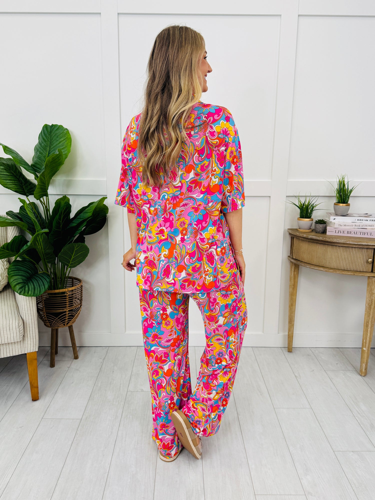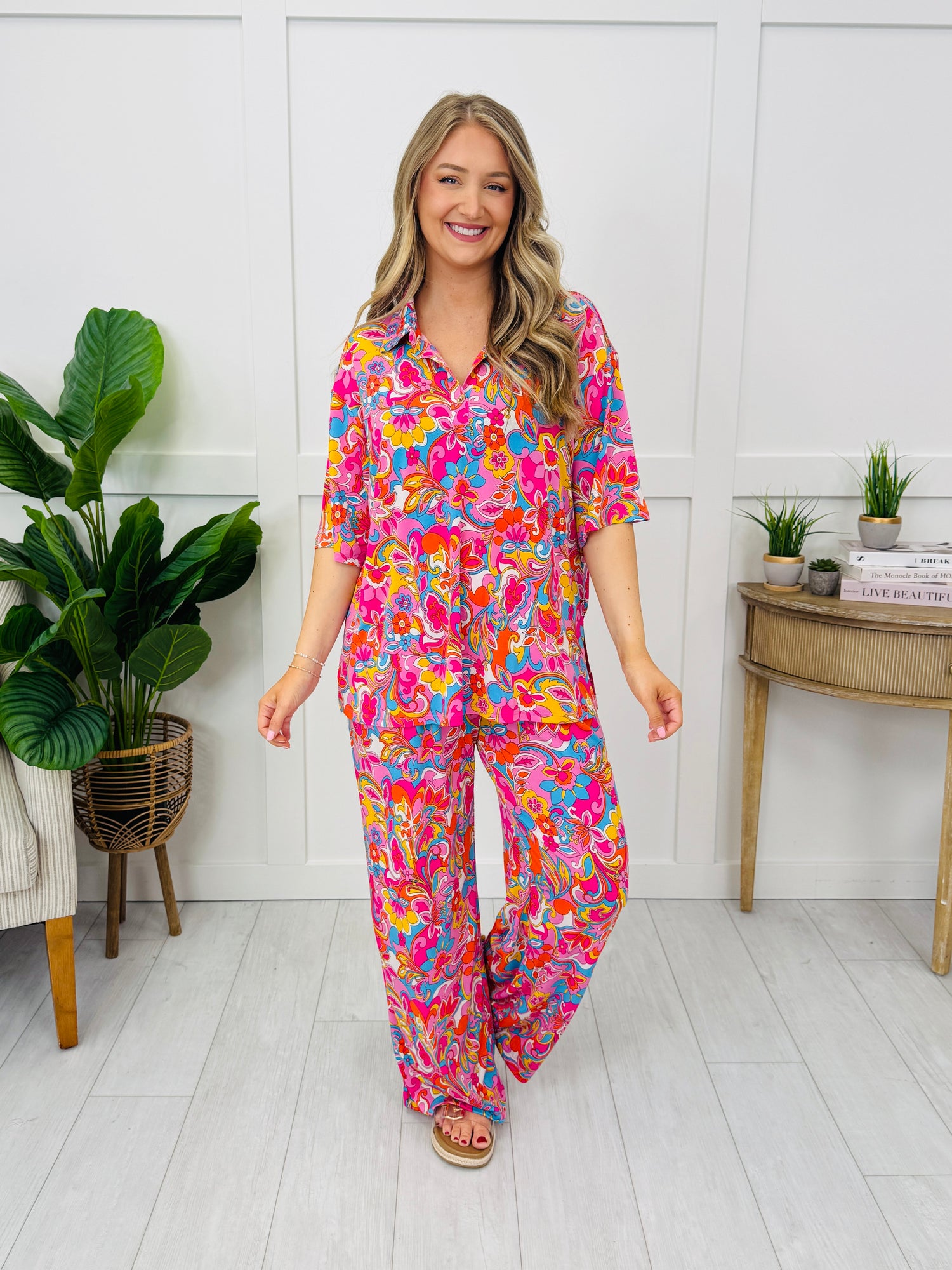 Designed in a wrinkle-free, cool-to-the-touch fabric, this vibrant set keeps you looking put together without the fuss. The relaxed fit drapes beautifully without clinging, giving you that easy, confident feel from morning to night.