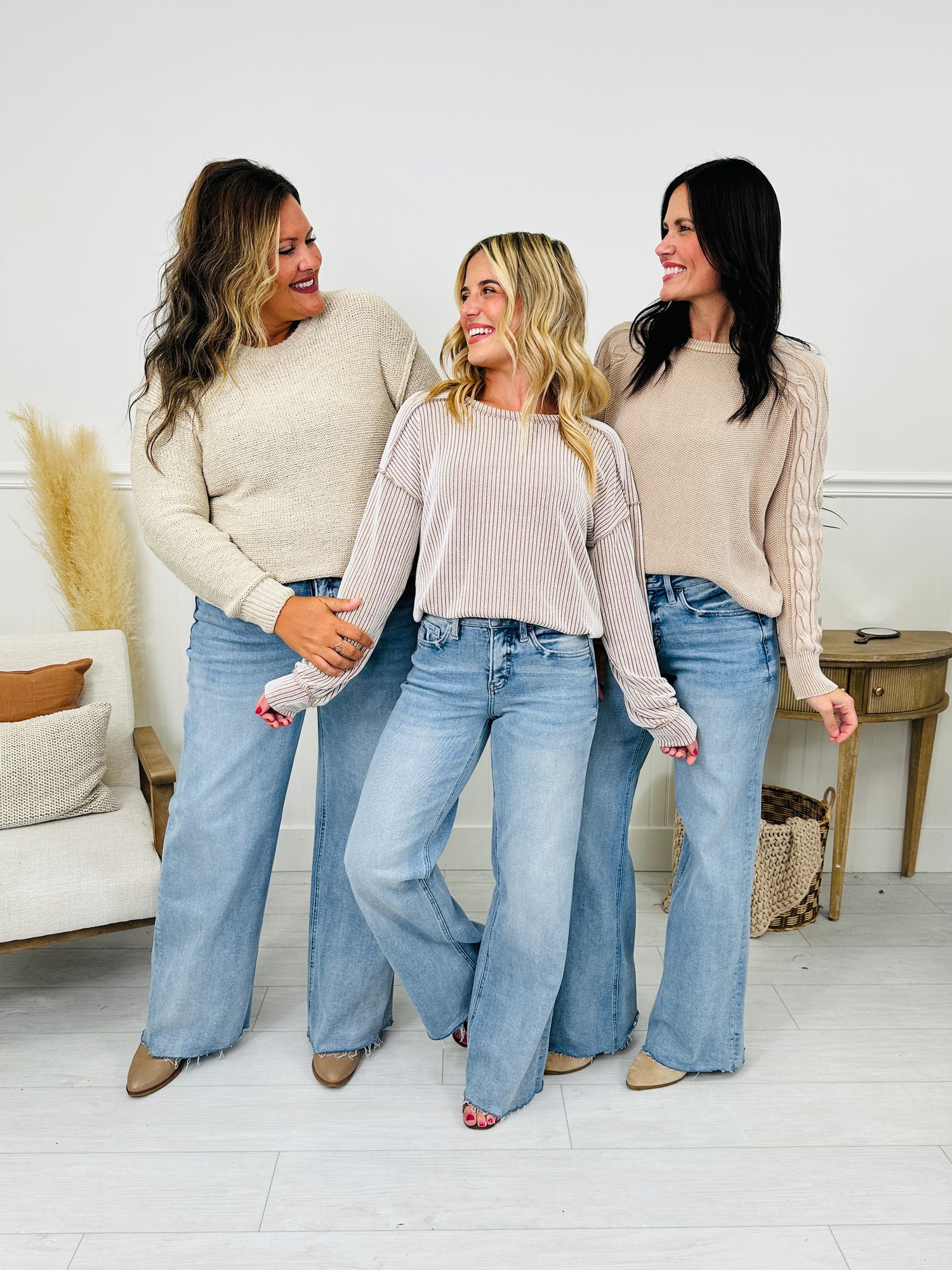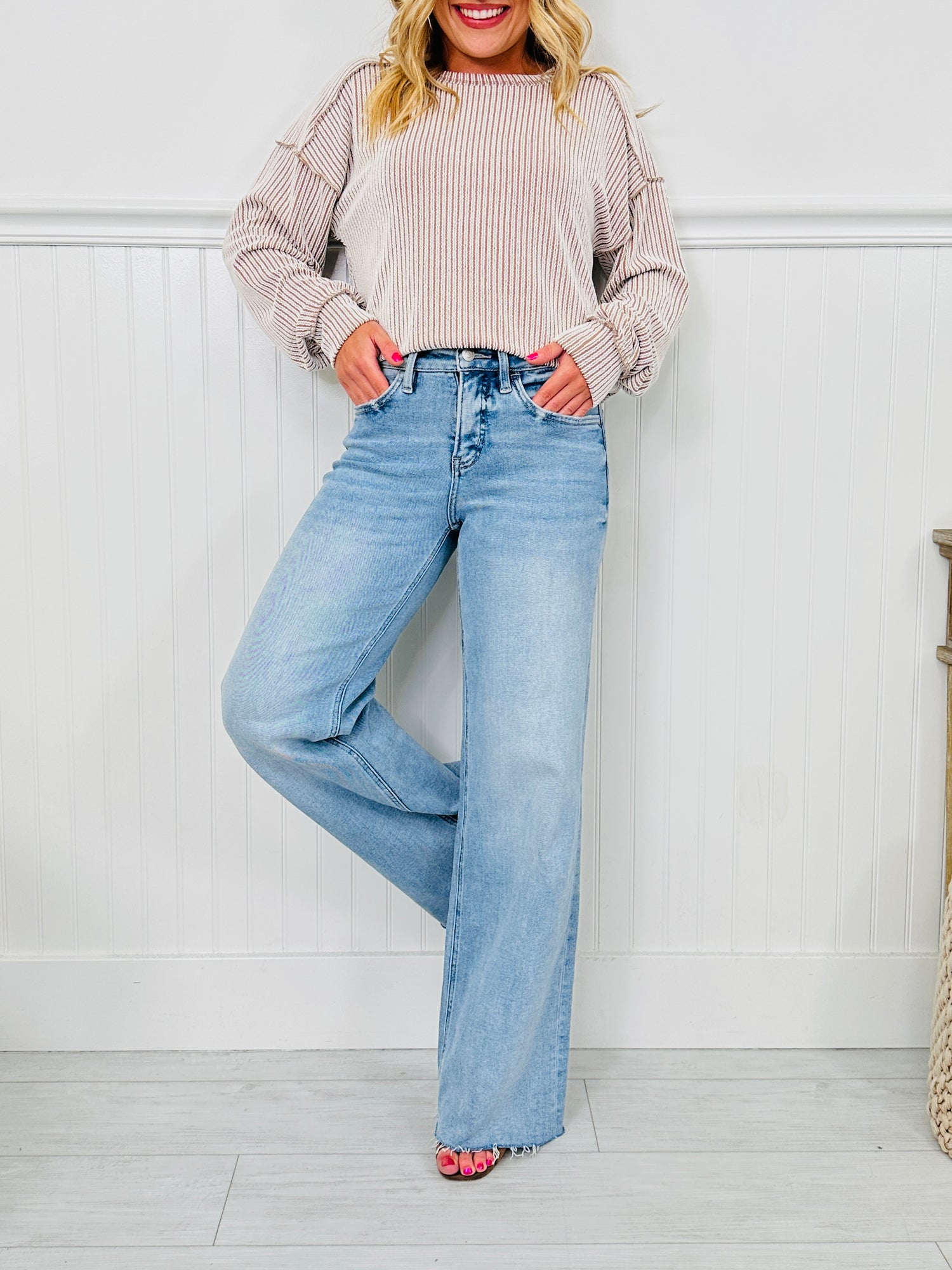 You are going to be making power moves in these new wide leg jeans! These are the jeans that can be worn anywhere and everywhere! Wear them from work, to weekend, to date night, to everywhere in between. The tummy control panel will give you an amazing confidence boost without sacrificing stretch or comfort! The Slim Wide Leg fit gives the trendy appearance of a wide leg jean with a slimmer fit on the legs, making it flattering on all body types, regardless of where you carry your weight!