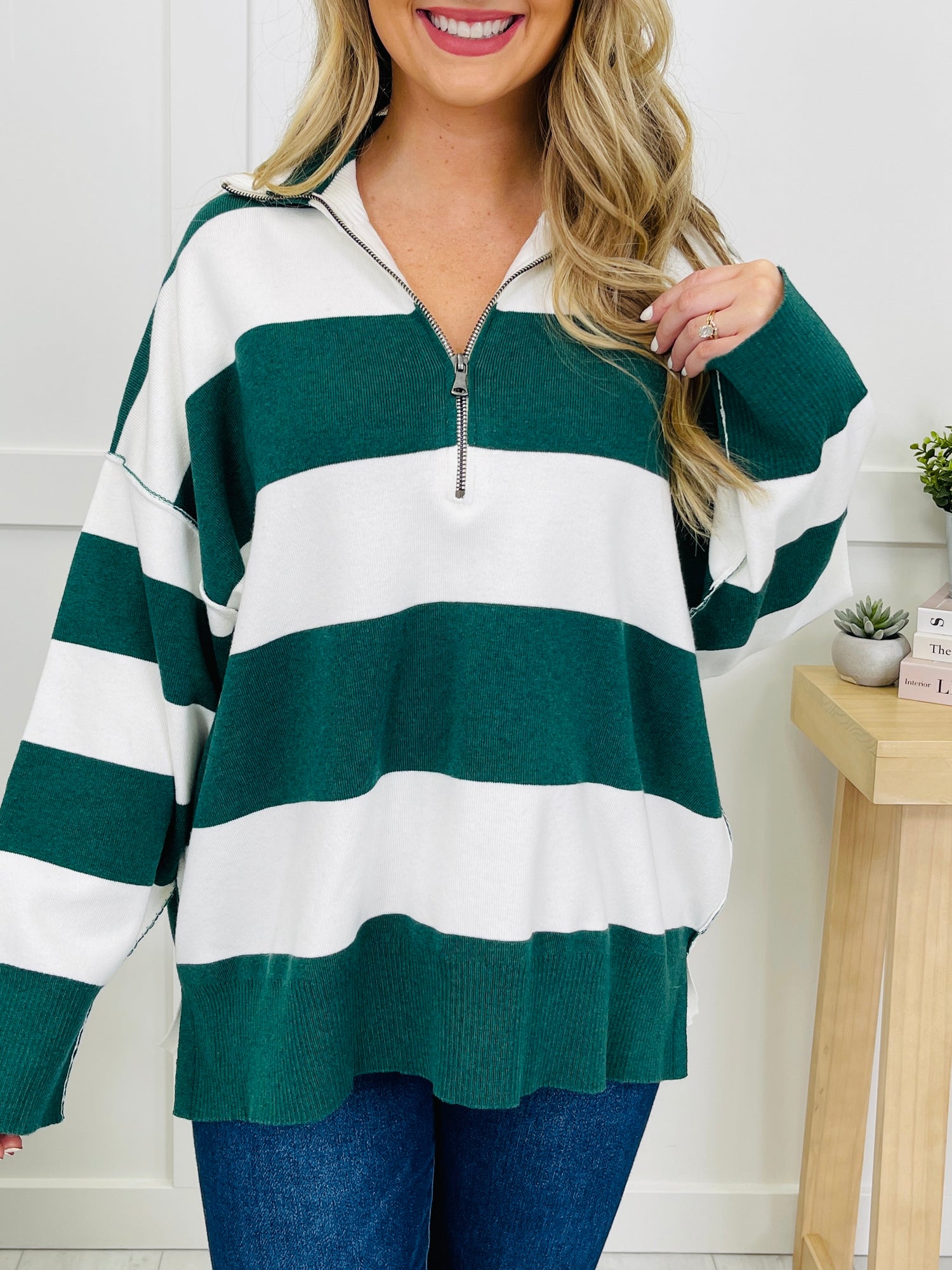 Make casual days cuter with this classic striped pullover that blends sporty and chic. The bold striped pattern stands out effortlessly, while the zip-front neckline adds a touch of versatility to your look. Designed with a relaxed, comfy fit, this top is perfect for everyday wear—just pair it with jeans or leggings and go!