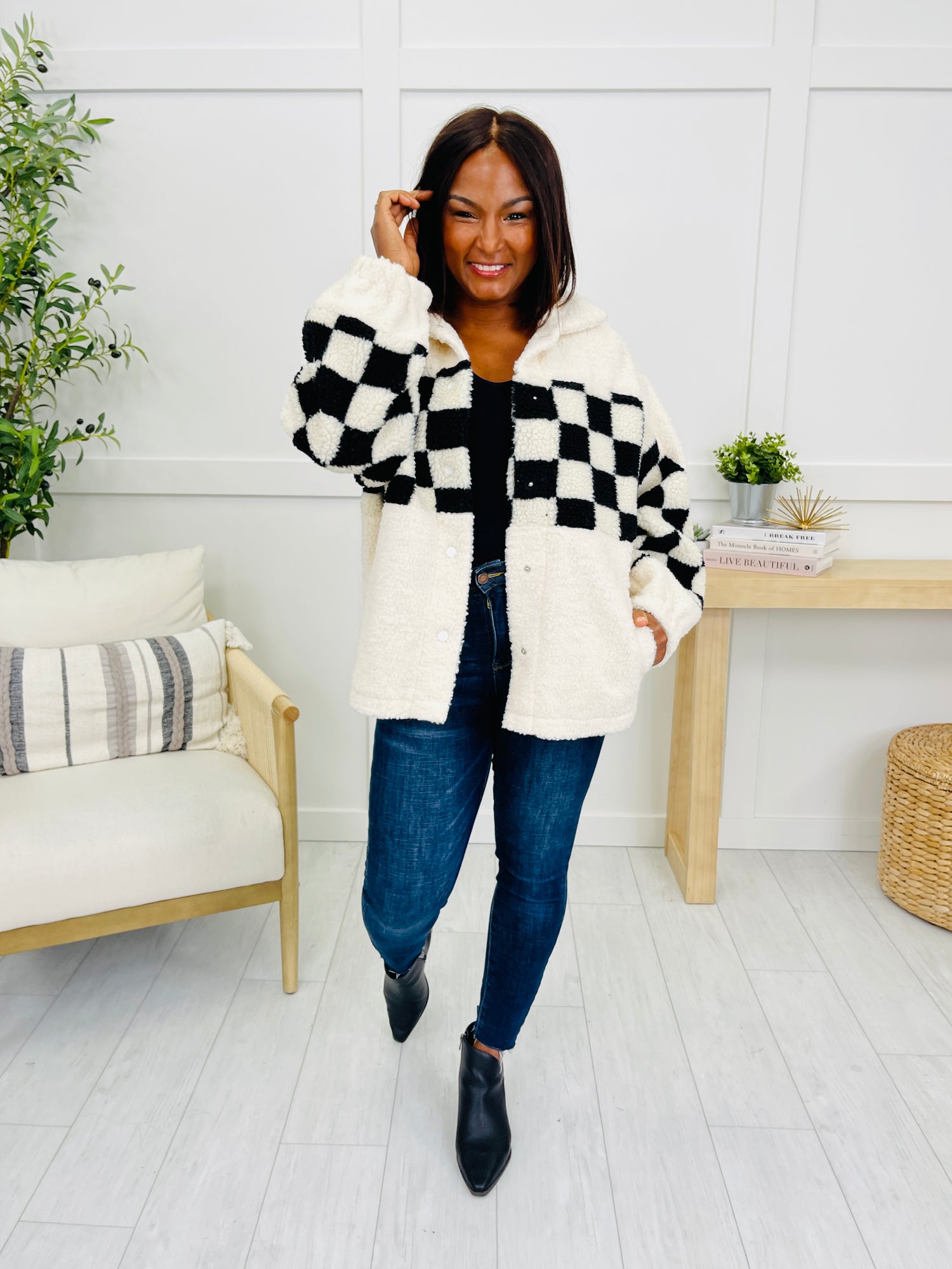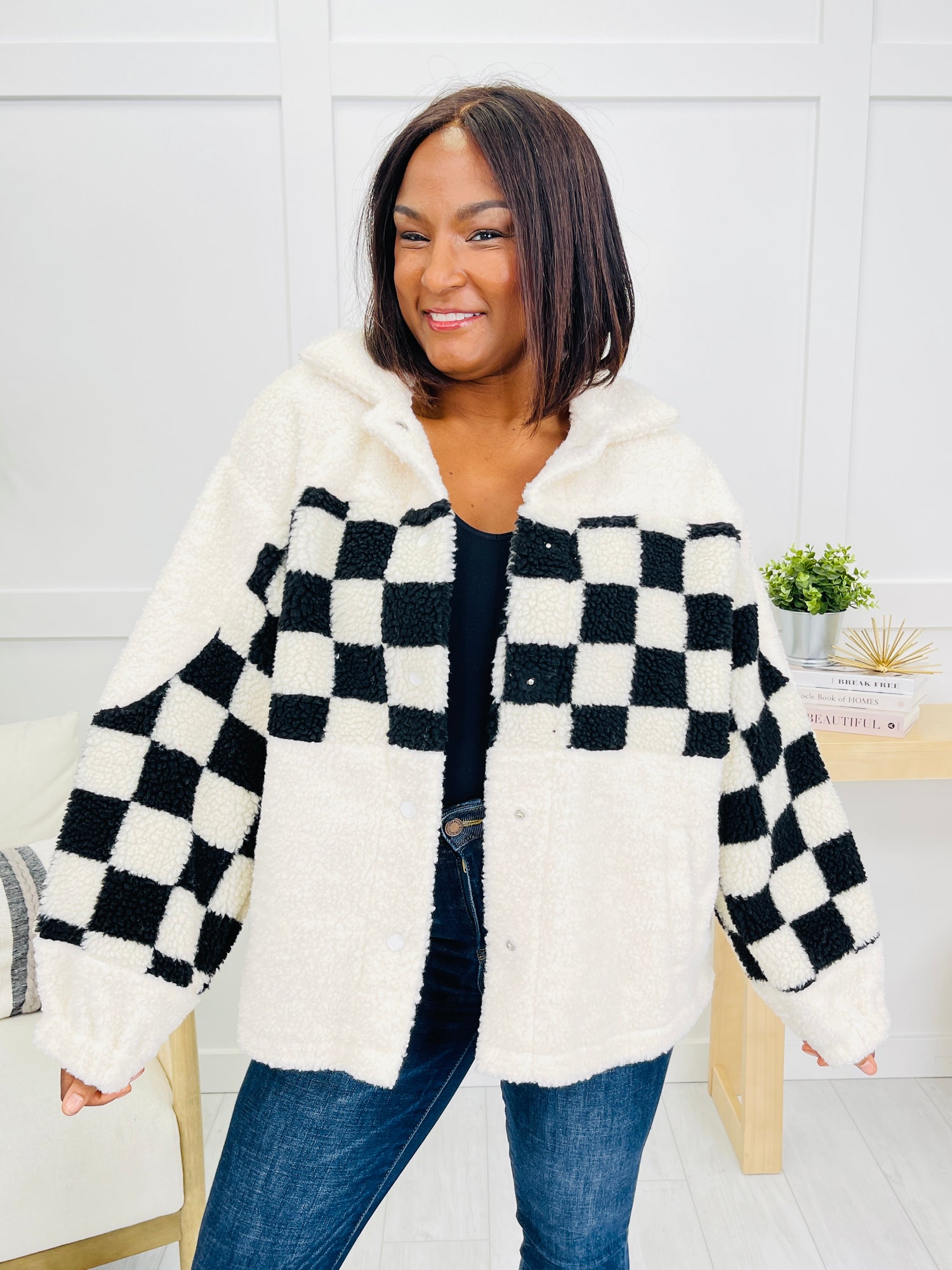 This eye-catching jacket brings a fun twist to your cool-weather looks with its bold checkered pattern across the top and sleeves. The soft sherpa texture gives it a plush, cozy feel that’s perfect for layering. Complete with a snap-front closure and relaxed fit, it’s a stylish way to stay warm and on-trend all season long.