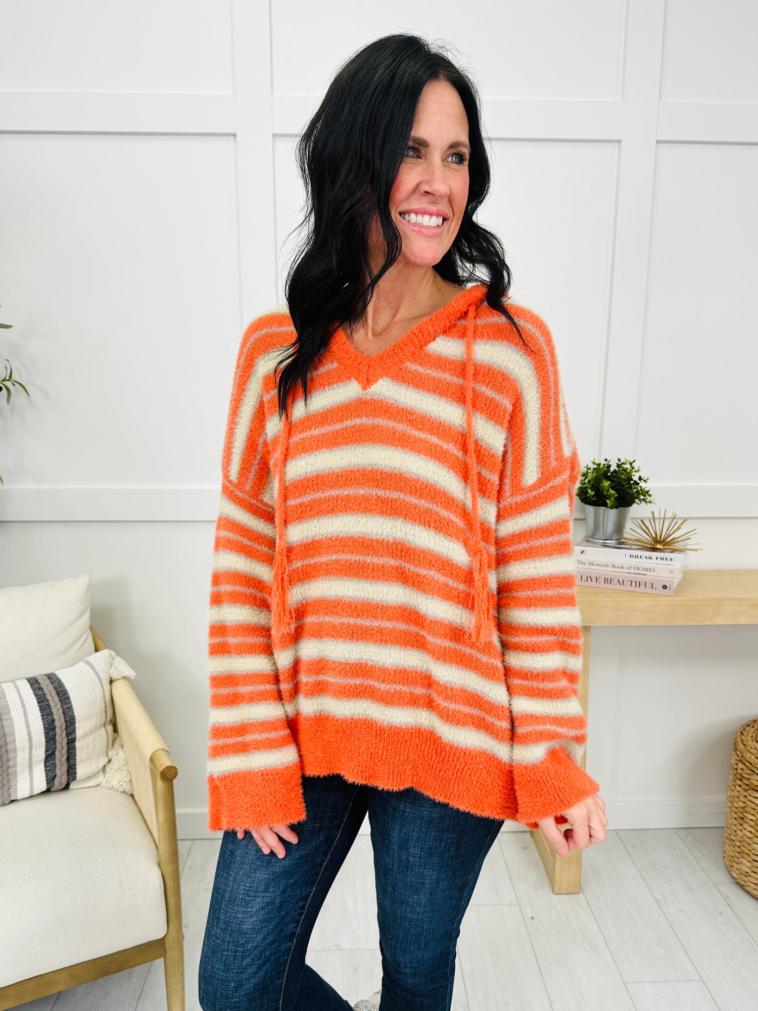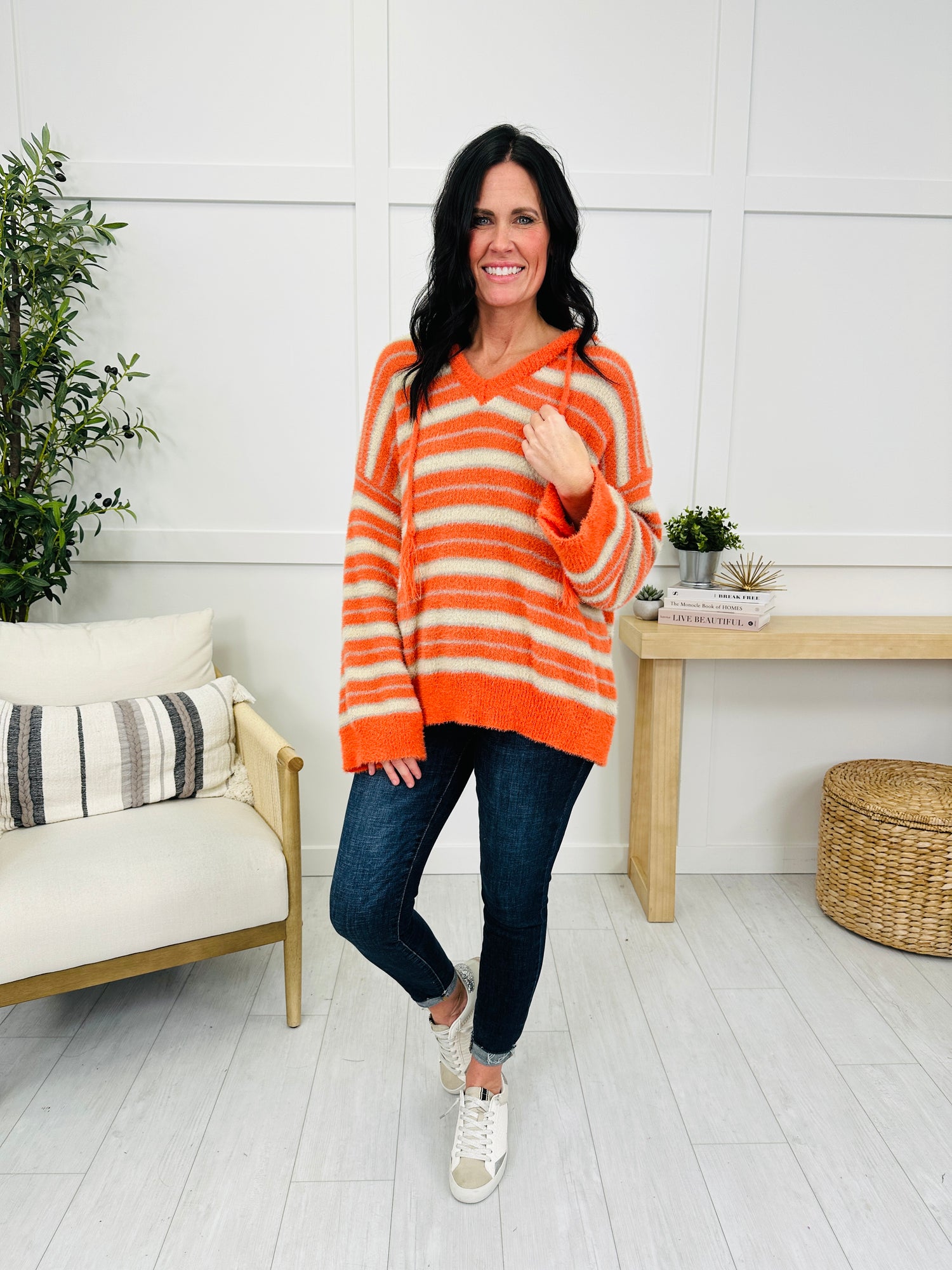 This striped sweater brings a fun pop of color and comfort to your look with its bold orange and cream pattern. The textured fuzzy knit gives it a soft, snuggly feel, while the relaxed fit keeps it effortlessly easy to wear. Finished with a v-neckline and drawstring accents, it’s a cheerful staple for cool-weather days.