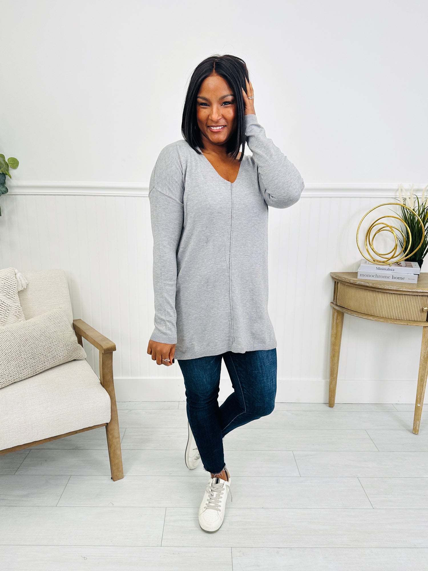 This simple yet polished top offers an easy everyday feel with its clean center seam and soft V neckline. The relaxed long sleeves and gently draped silhouette create a comfortable fit that still looks put-together. Finished with subtle side slits and a smooth knit texture, it’s a versatile piece you can style effortlessly across seasons.