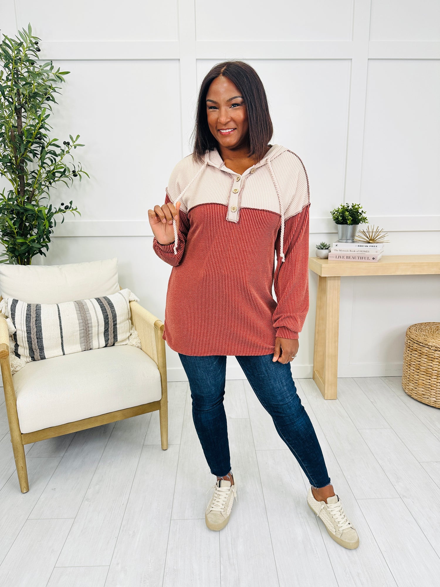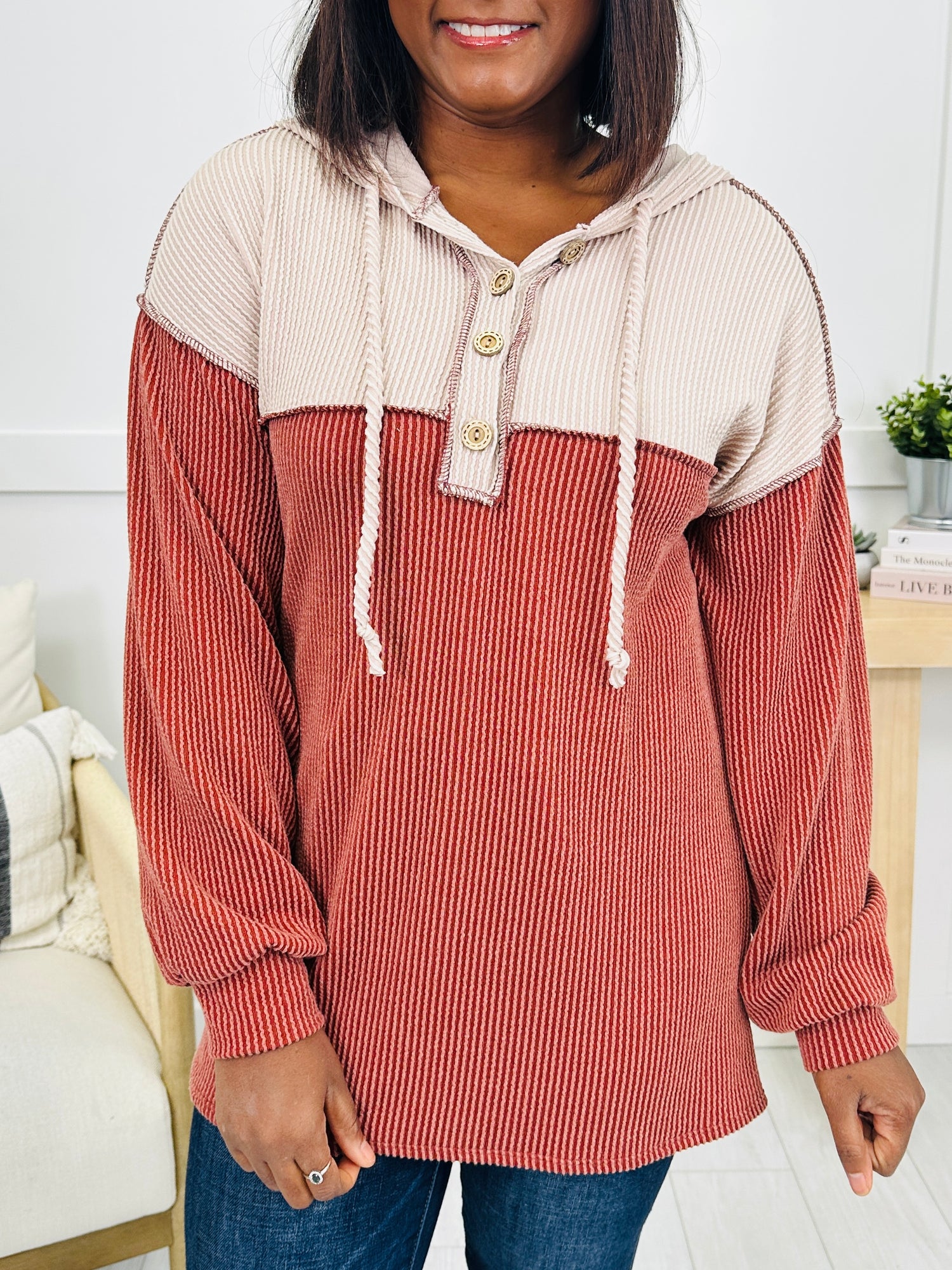 Sweet meets cozy in this long-sleeve top, featuring an allover raised rib texture topped with a contrast hooded upper panel and chunky drawstrings. A short button-front placket adds that henley touch, while gathered cuffs and a curved, tunic-length hem keep the fit easy and wearable. Pair it with denim and sneakers for an effortless, pulled-together look.