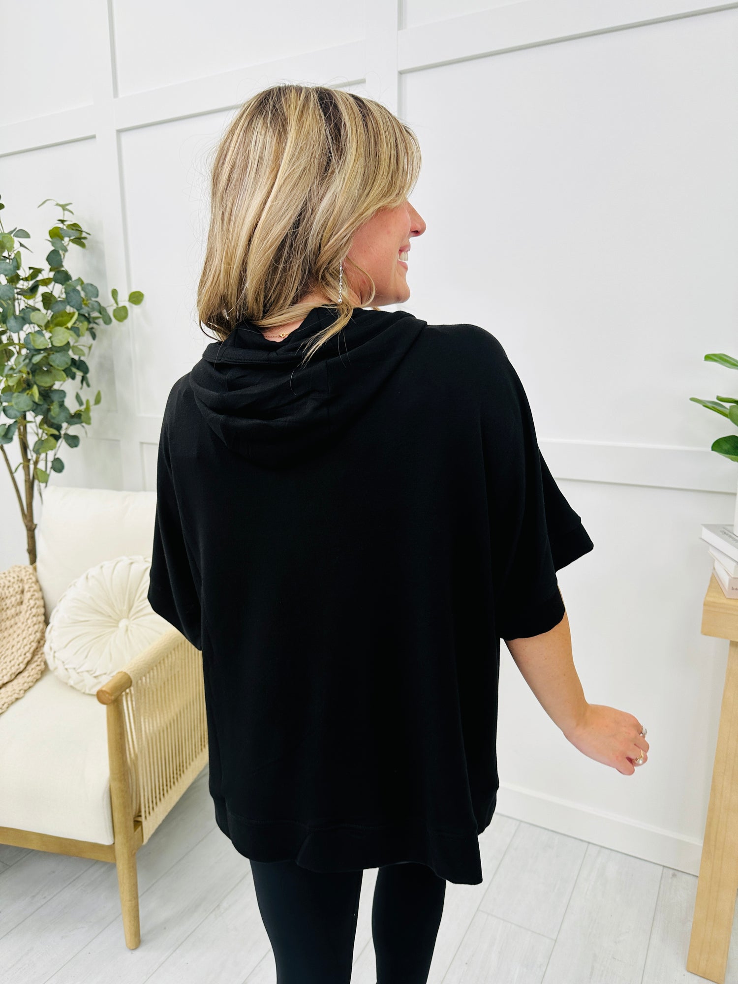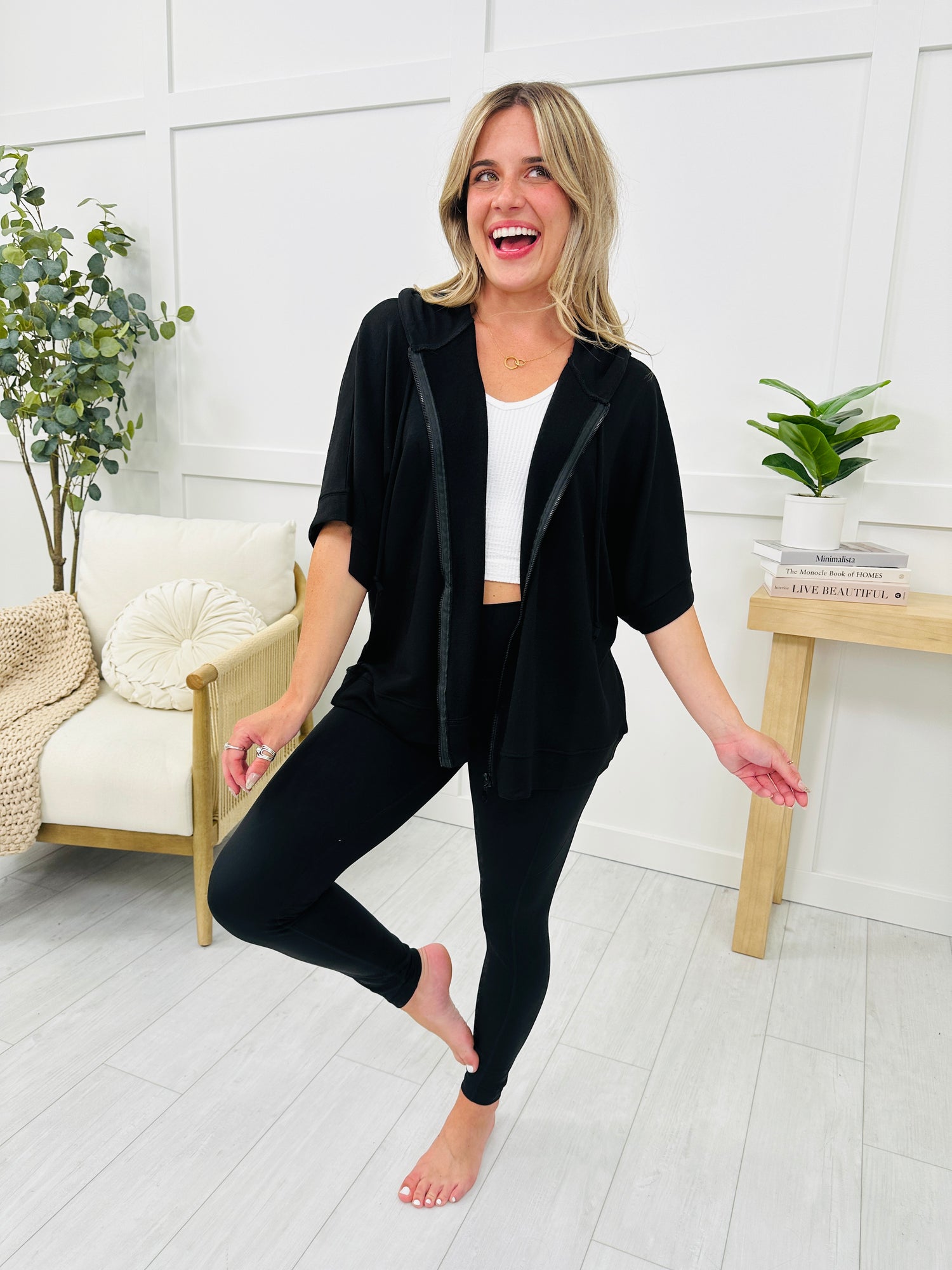 This black zip-up hoodie features dolman sleeves and a relaxed, flowy fit for a comfortable and casual look. With its soft fabric and neutral color, it's the perfect layering piece to add to your wardrobe.