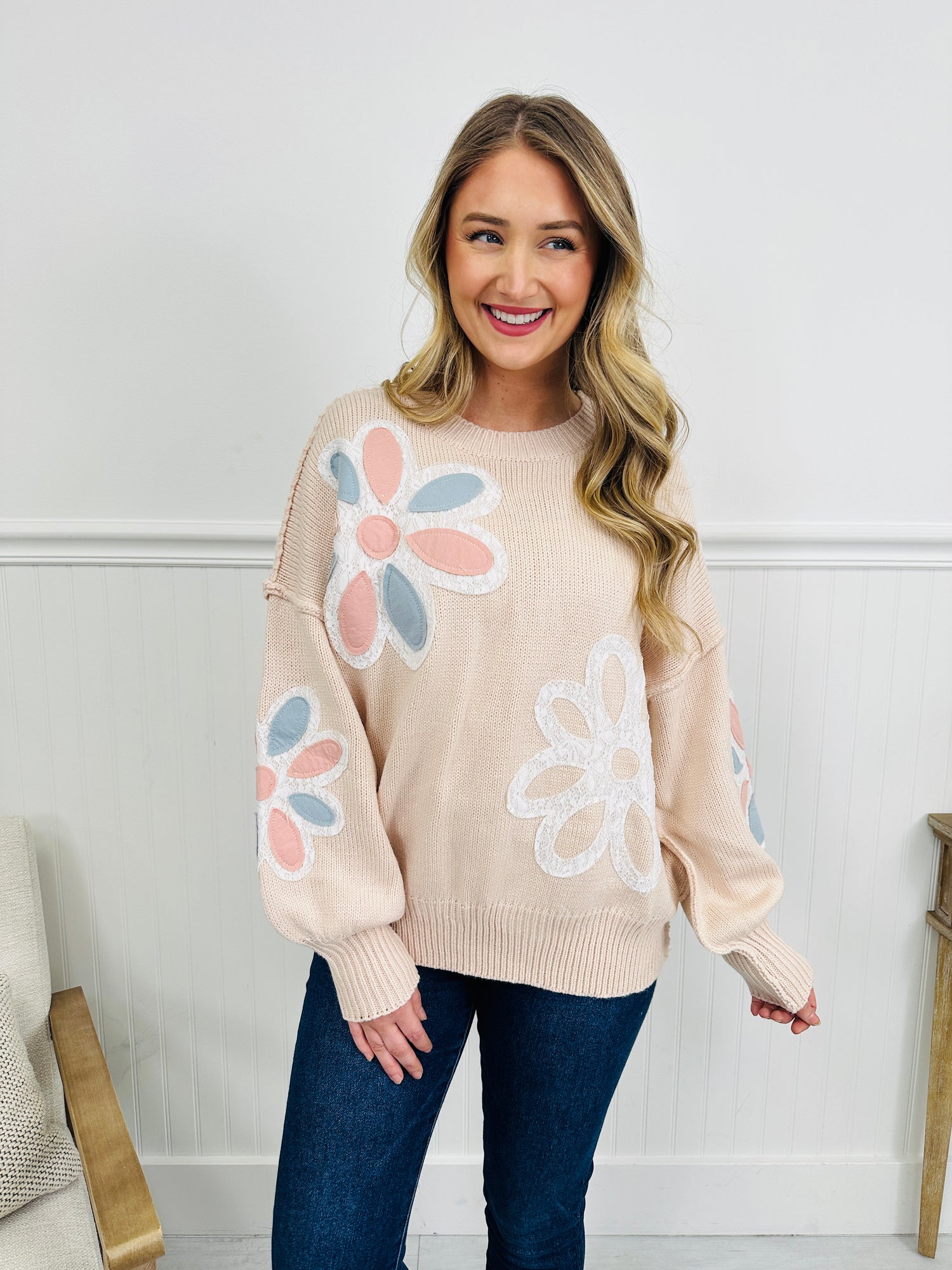 Bring a touch of whimsy to your everyday wardrobe with this charming knit sweater, decorated with oversized daisy accents along the front and sleeves. The soft knit texture keeps it cozy and comfortable, while the relaxed, easy fit gives it that effortless, feel-good silhouette you’ll reach for again and again. Finished with ribbed trim at the neckline, cuffs, and hem, it’s the perfect blend of fun and comfy style.