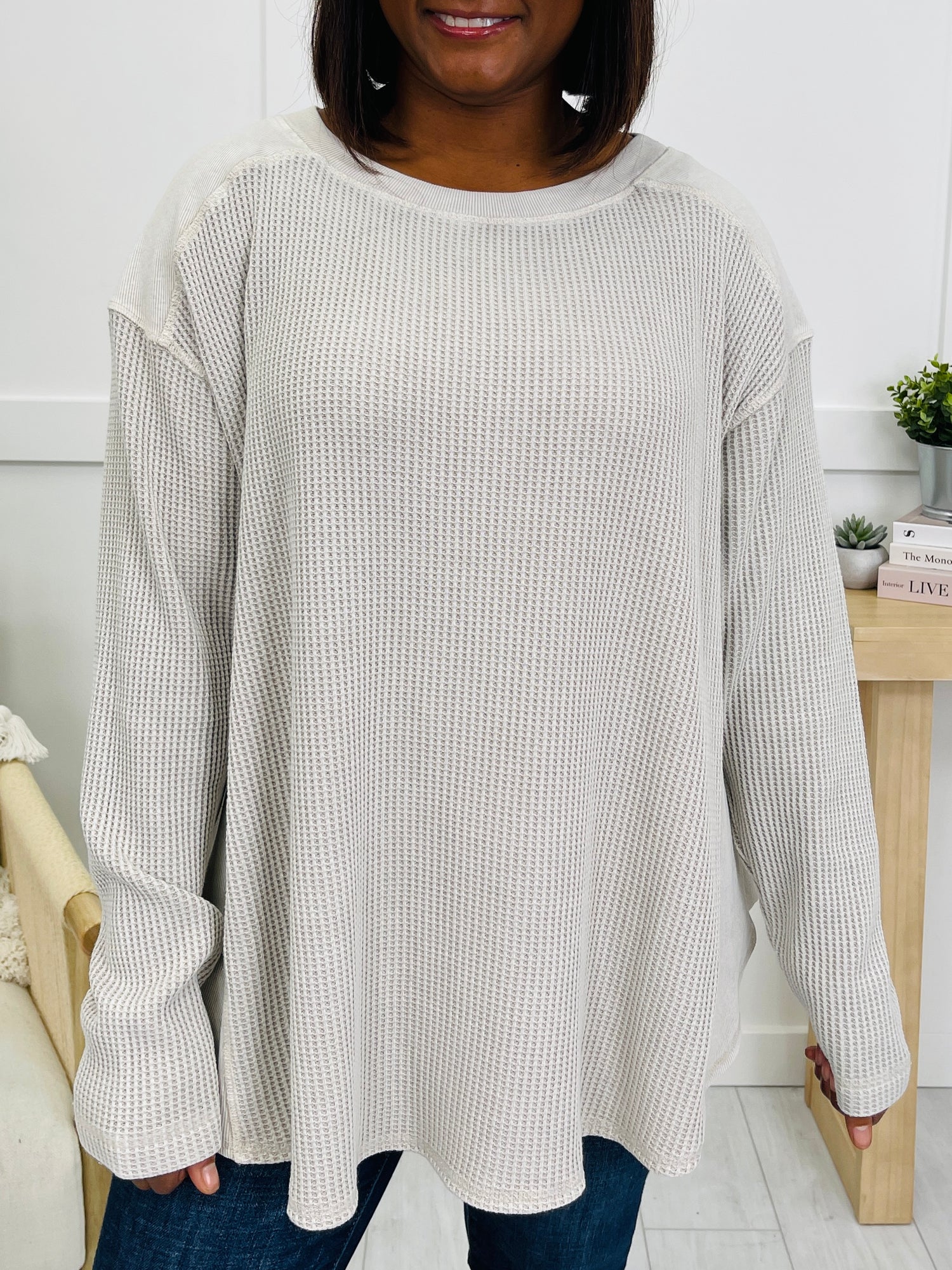 This cozy top brings an effortlessly laid-back feel to your everyday style. The textured knit design adds subtle dimension, while the relaxed draped fit keeps it easy and comfortable for all-day wear. Finished with a rounded neckline and stitched seam accents, it’s a versatile piece that’s perfect for pairing with jeans or leggings across every color option.