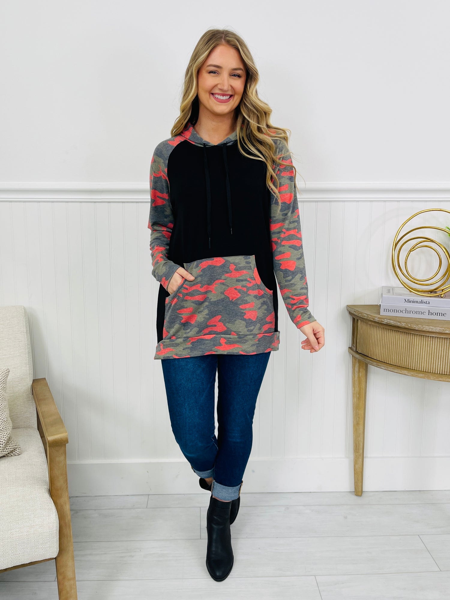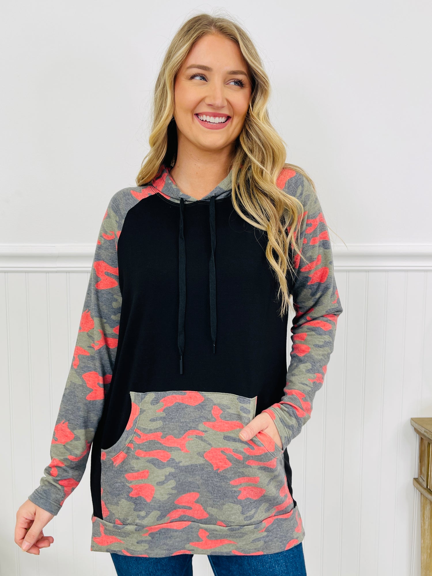 This playful hoodie brings together a bold mix of colors with its solid black body paired against camo sleeves, hood, and a matching kangaroo pocket. The contrast creates a fun, standout look while the relaxed fit keeps it easy and comfortable for everyday wear. Finished with drawstrings at the hood and a camo-trimmed hem, it’s the perfect throw-on piece when you want effortless style with a pop of personality.