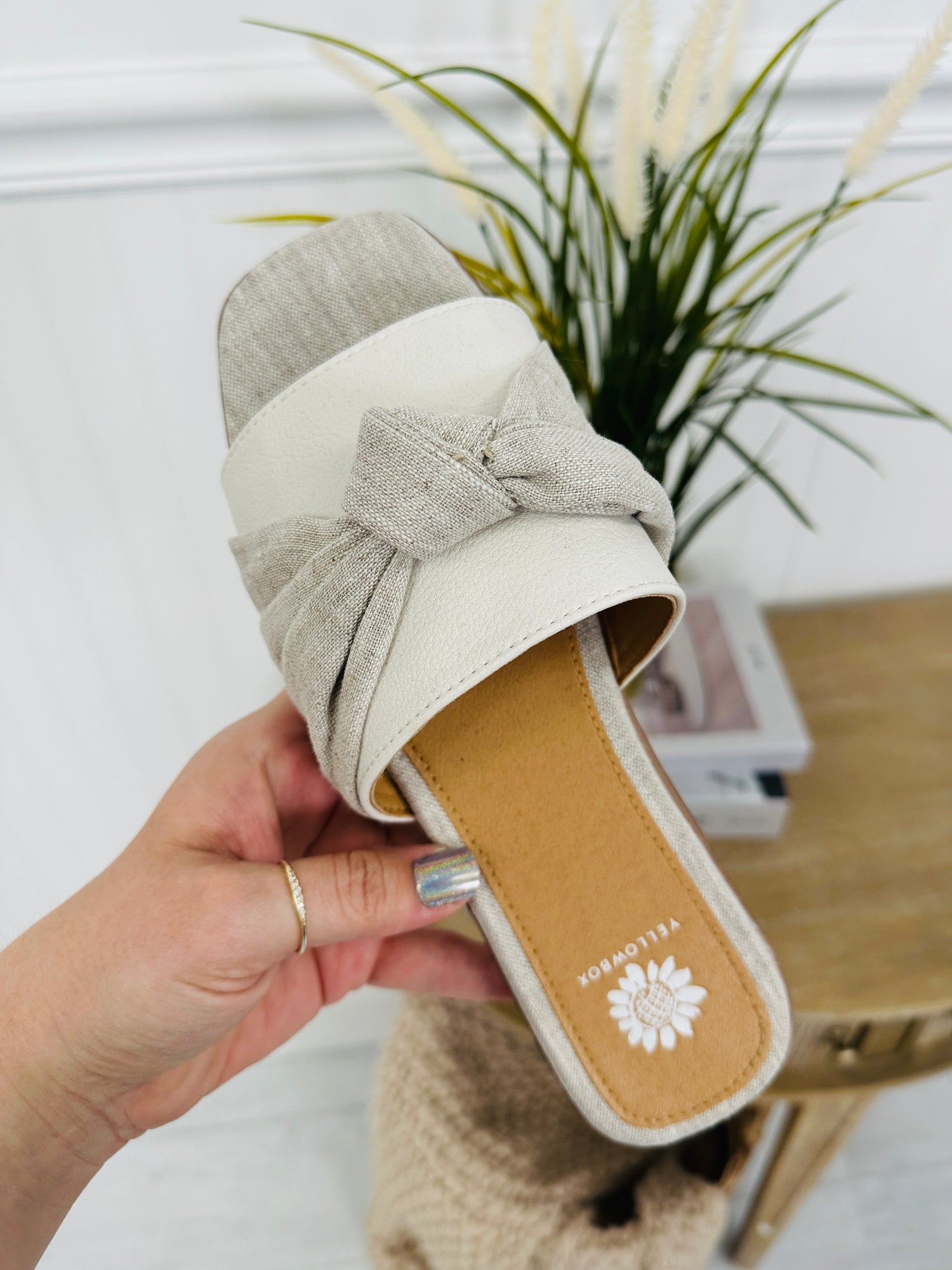 These sandals are the perfect mix of casual charm and everyday comfort. The knotted fabric detail gives them a chic, feminine touch, while the neutral two-tone style makes them easy to pair with any look in your wardrobe. Finished with an easy slip-on fit, they’re a go-to choice for effortless styling from weekday errands to weekend outings.