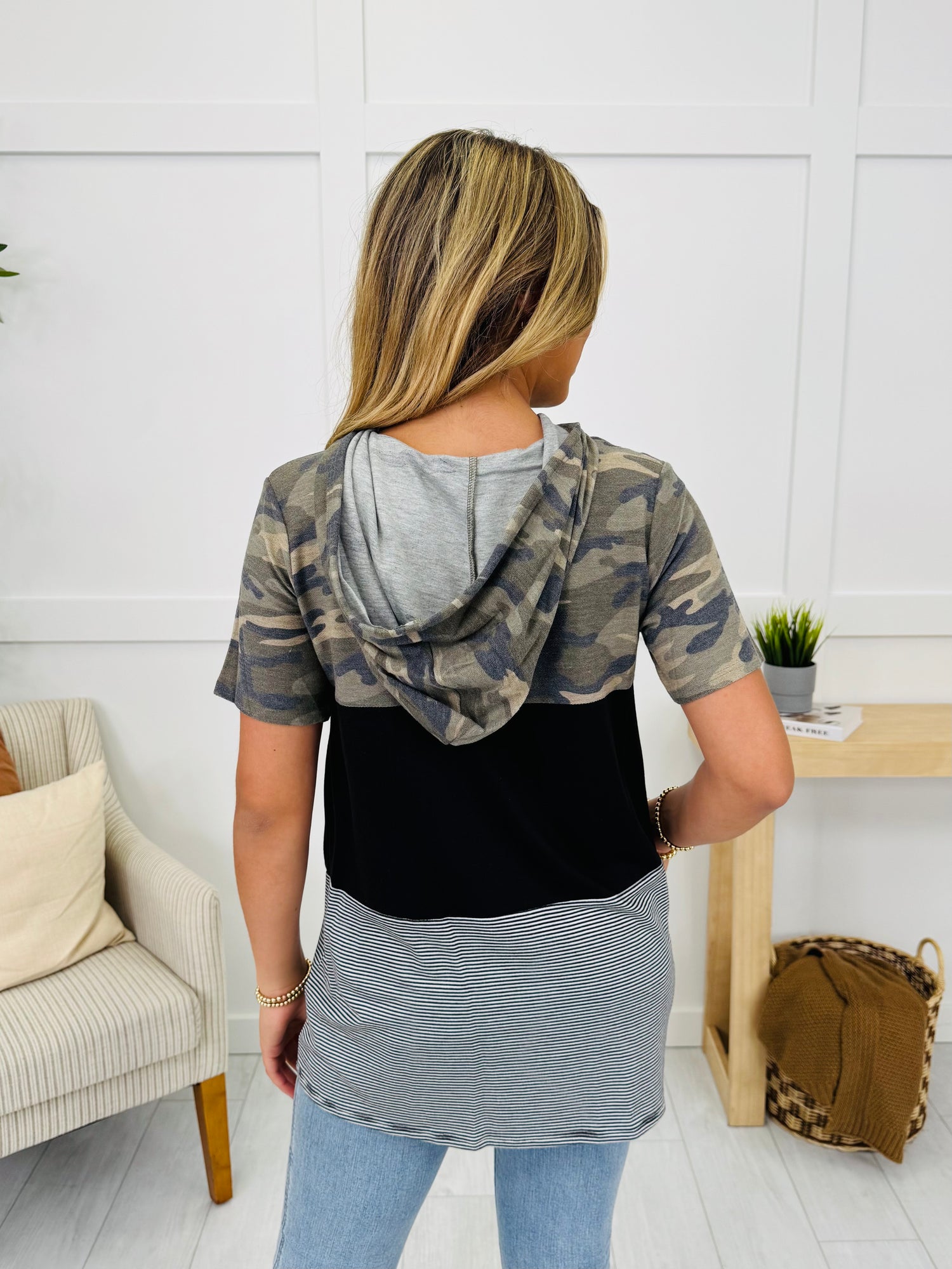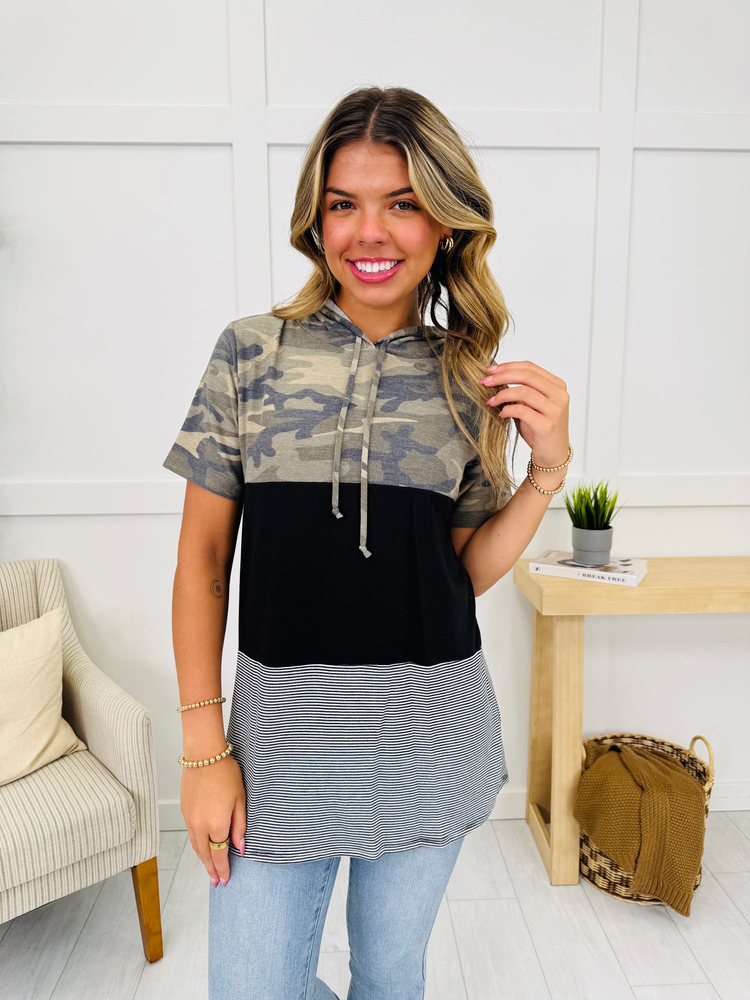 This top is the perfect mix of casual and fun with its bold camo and stripe contrast. The lightweight hoodie style adds a sporty touch, making it great for laid-back days. Finished with a relaxed everyday fit, it’s an easy piece to throw on with denim or leggings for an effortlessly cute look.