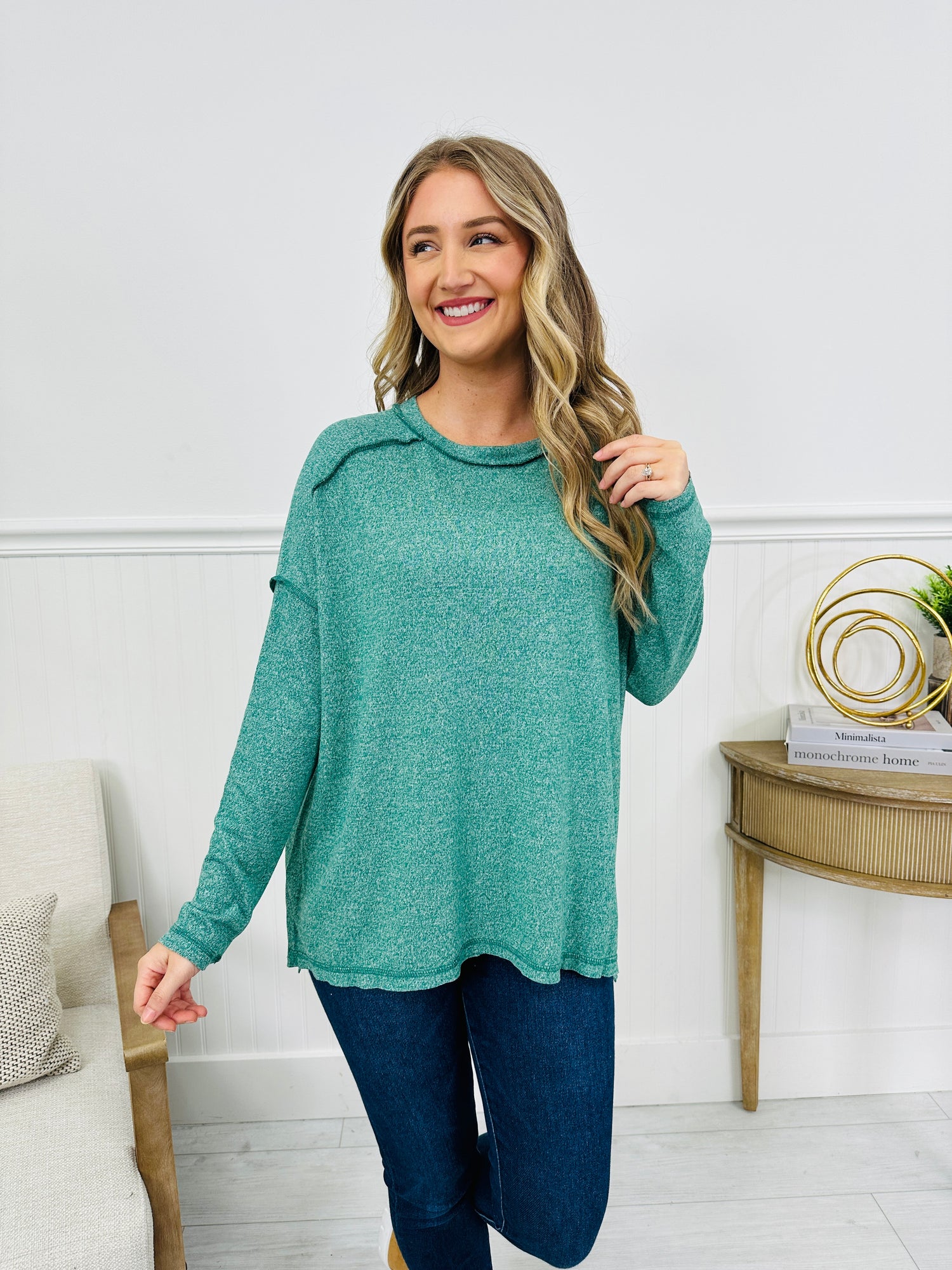 This top features a softly textured knit with visible raw-edge seams that add just the right amount of detail without taking away from its easy, wearable feel. The relaxed fit drapes effortlessly, giving you room to move while still keeping things polished and put-together. Whether you're dressing it up or keeping things simple with denim, this one is an easy grab-and-go favorite you’ll want in multiple colors.