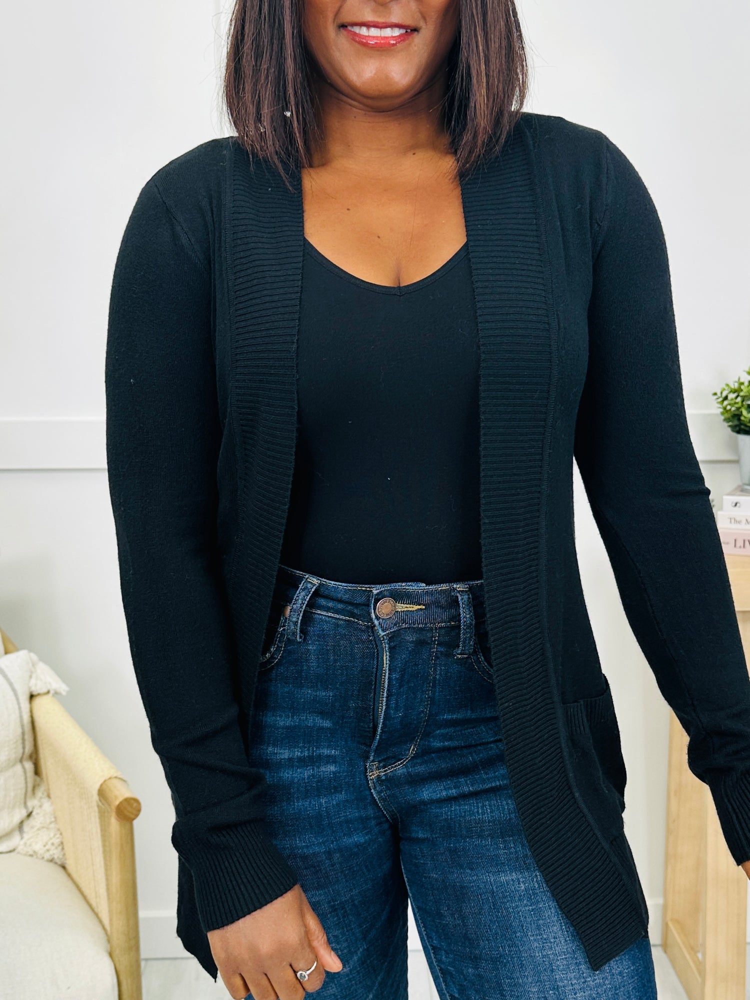 Simple yet polished, this long cardigan is an easy layer you’ll reach for again and again. It features a clean open-front design with ribbed trim along the neckline, cuffs, and hem for a refined finish. The front pocket detail adds a practical touch, making it perfect for everyday wear with your favorite denim or leggings.