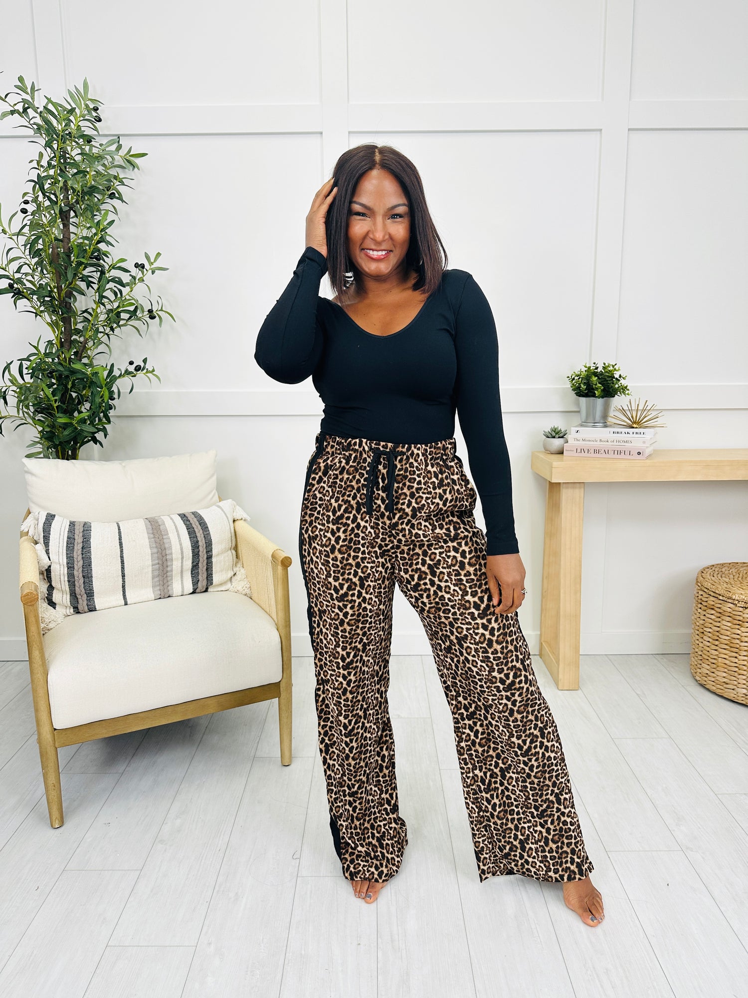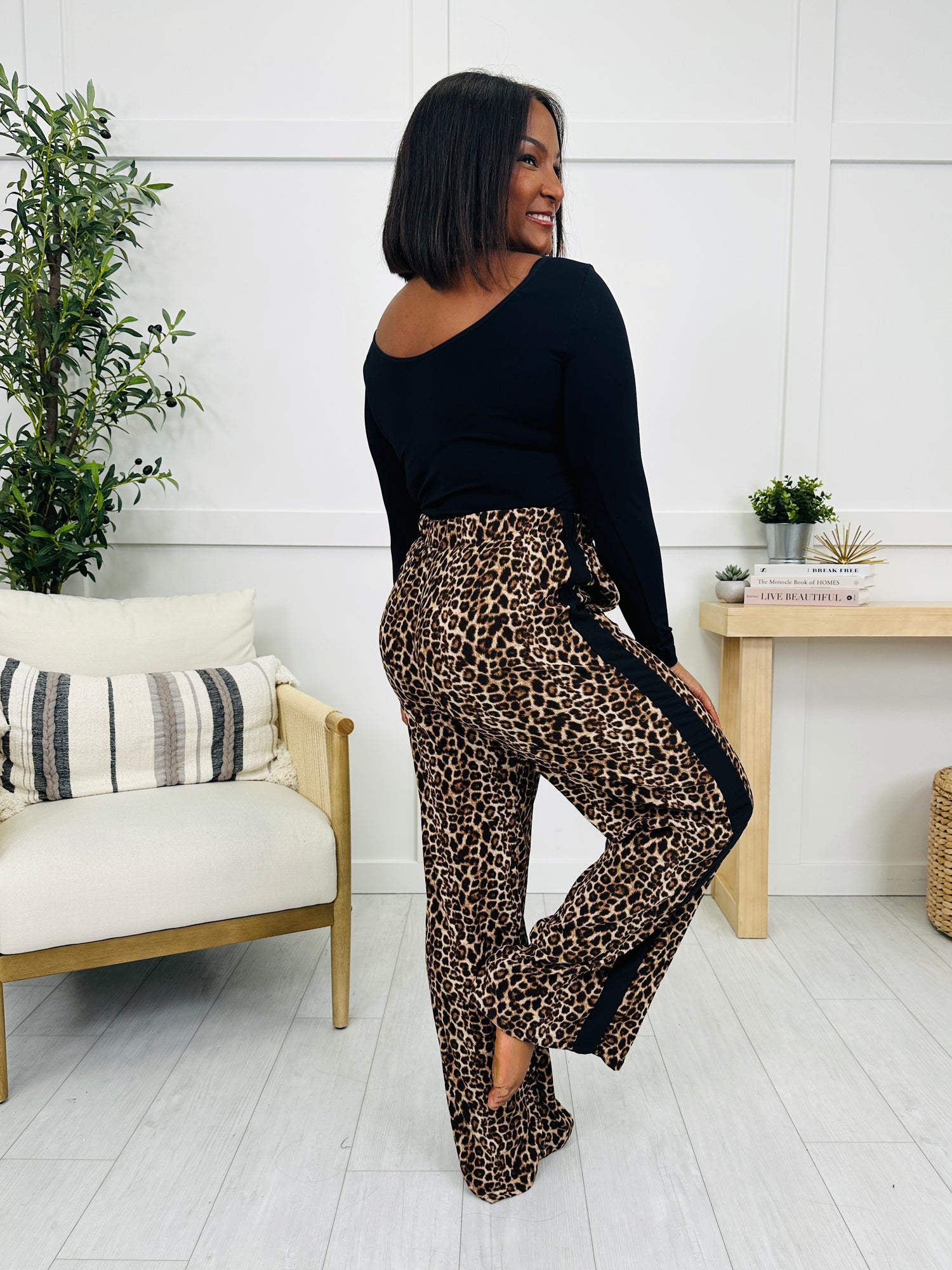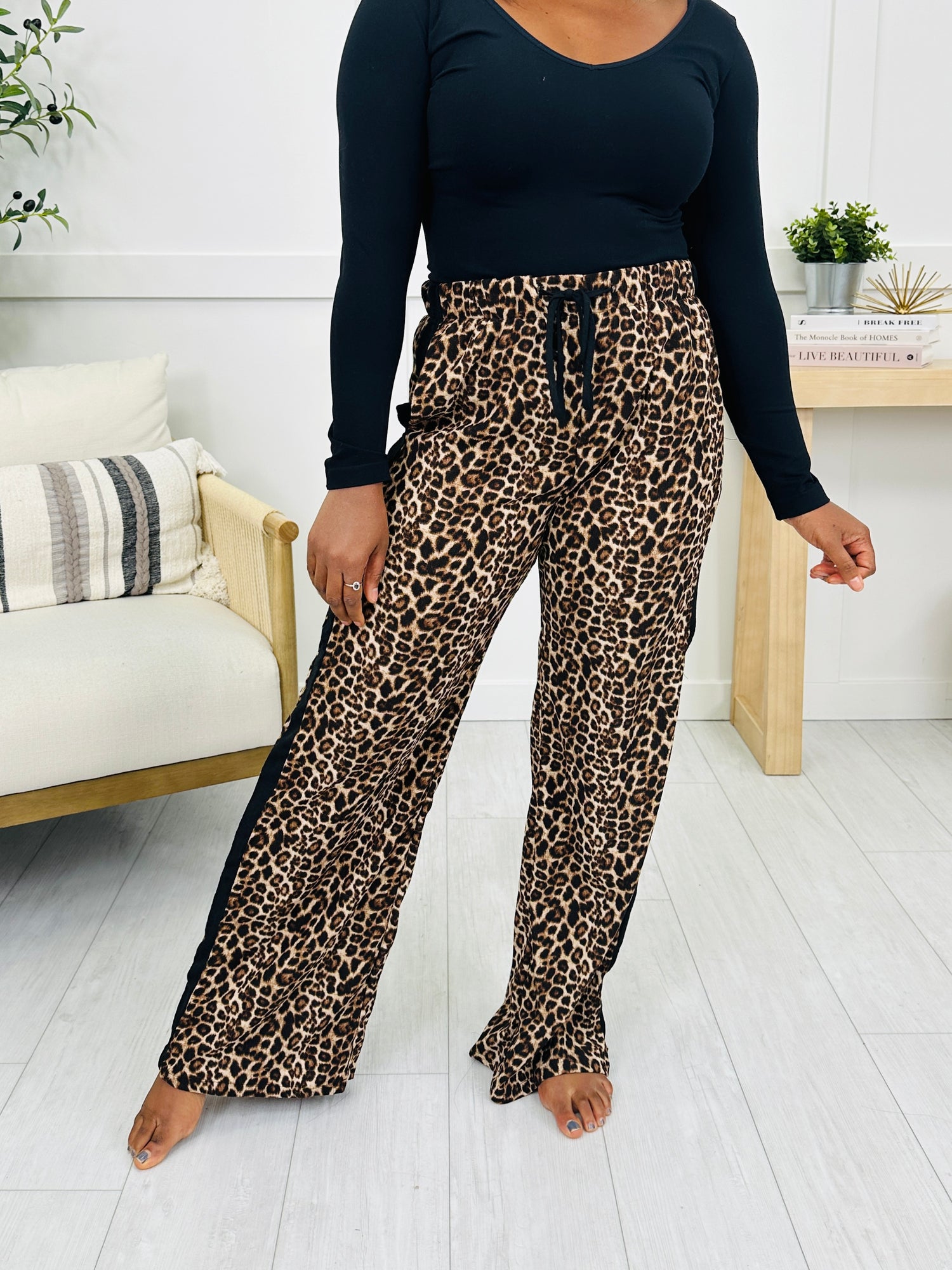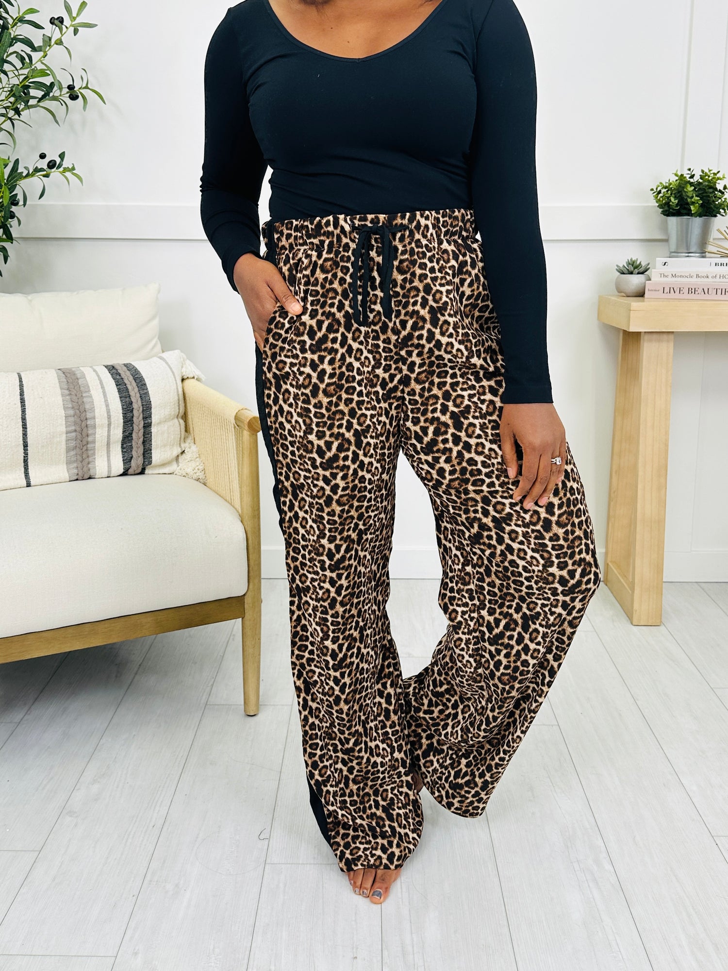 Make a statement in these effortlessly bold leopard print pants! Designed with a relaxed wide leg silhouette, they bring the perfect balance of comfort and confidence to your look. The drawstring waist detail adds a touch of adjustability, while the side stripe accent gives them a sporty, fashion-forward finish.